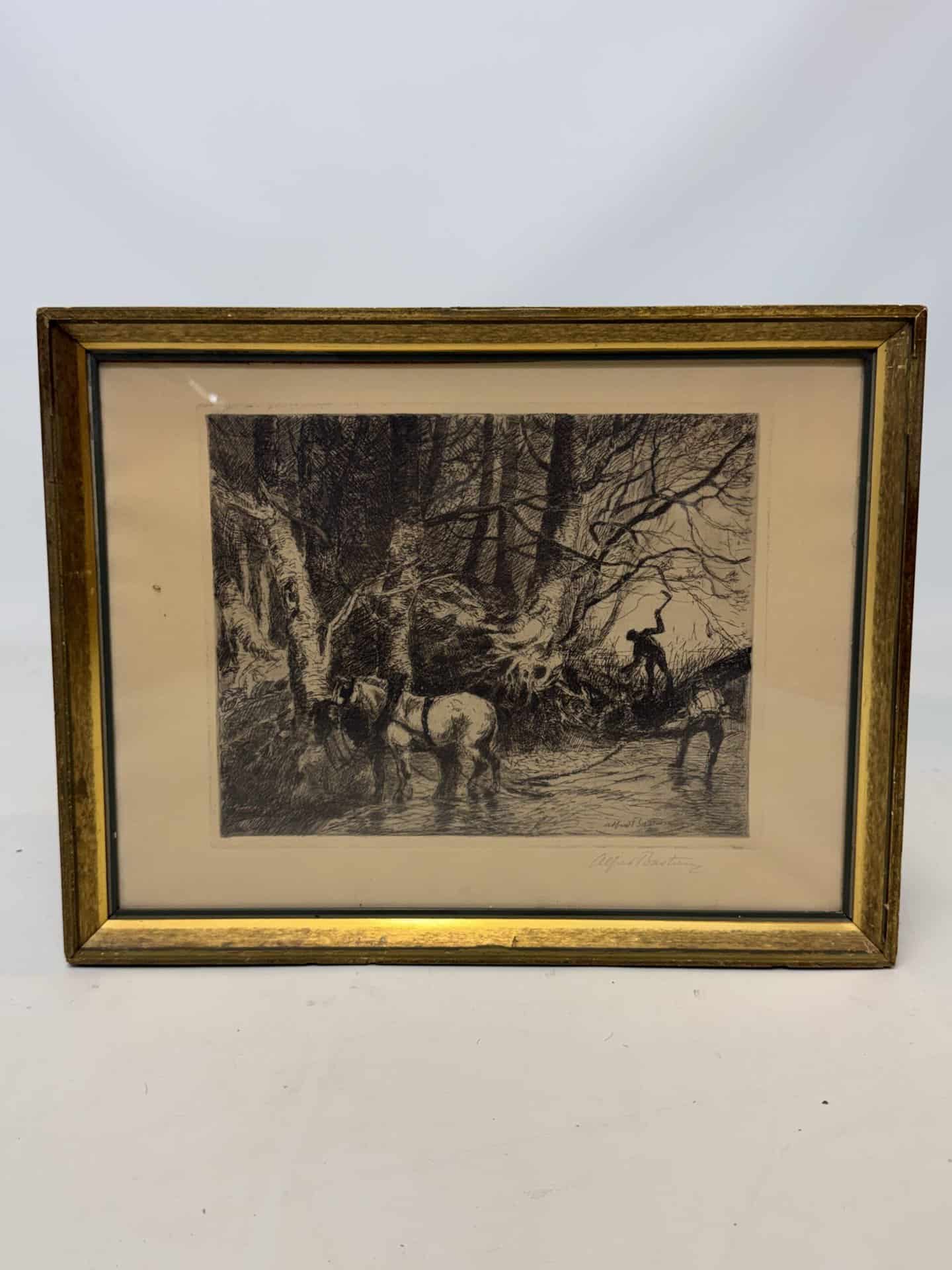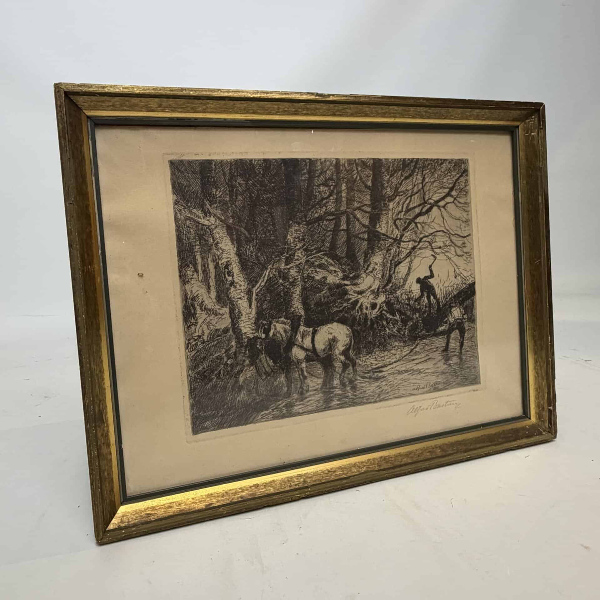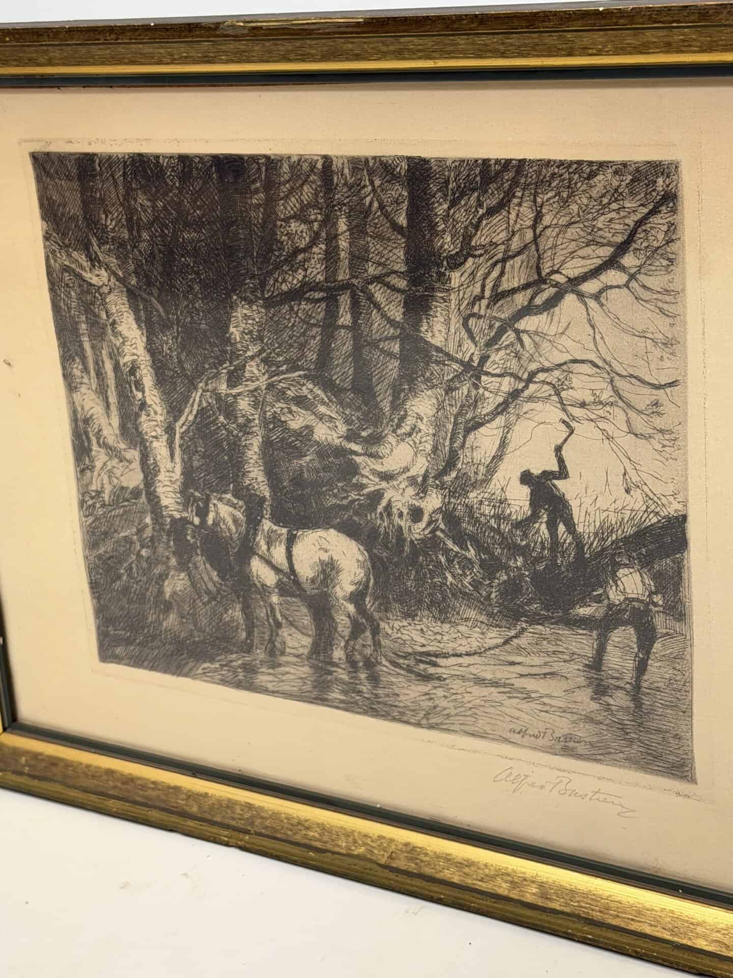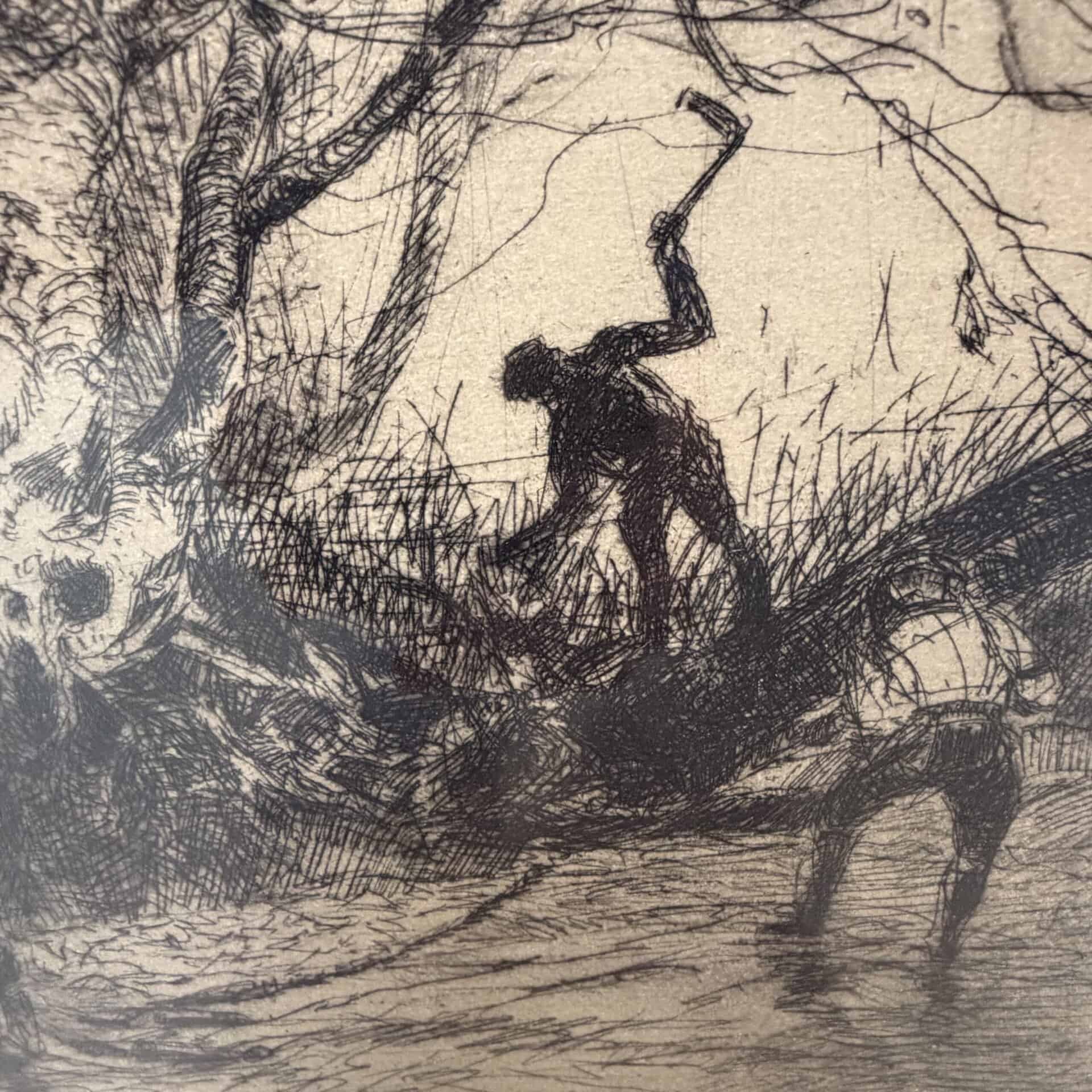 This etching depicts woodcutters at work with horses in the foreground in a wooded area.