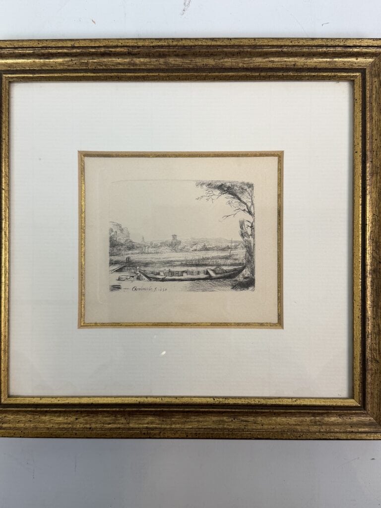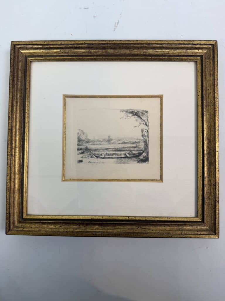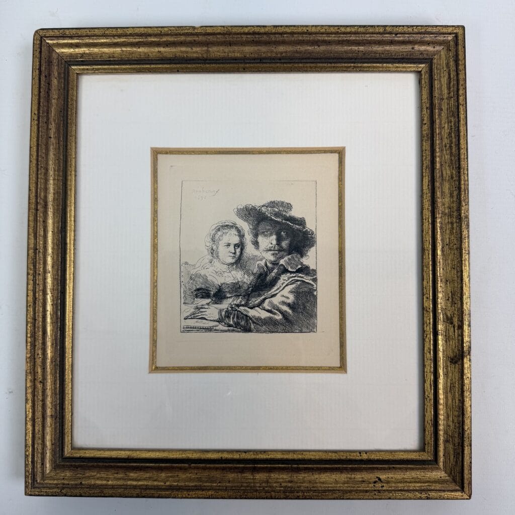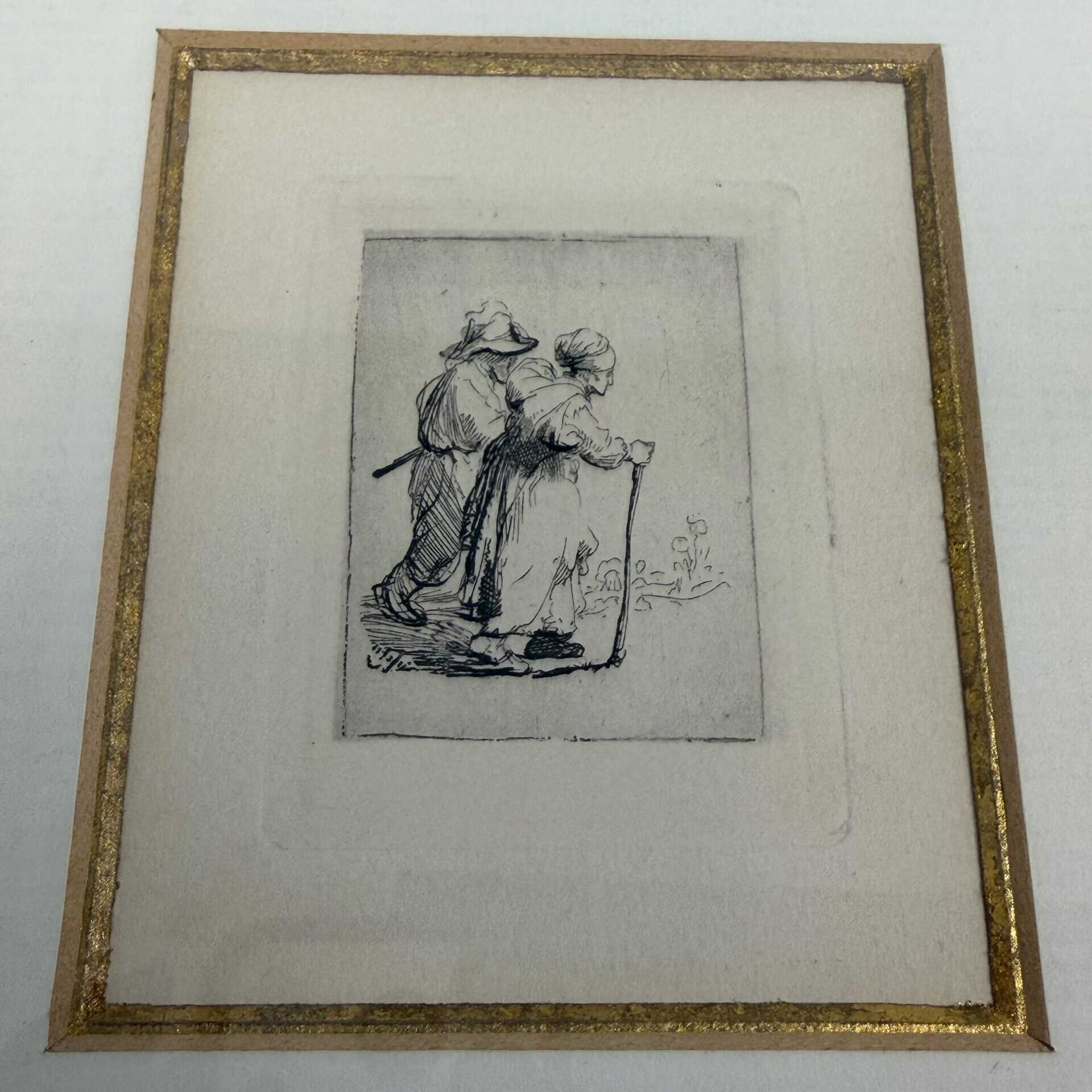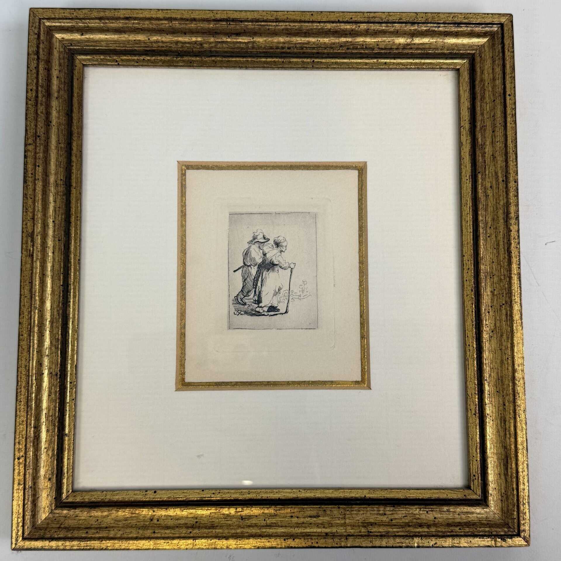 The patinated gilded frame with multiple tiers, along with the passe-partout and fillet around the edge of the etchings, draw your attention to the small work of art in the centre