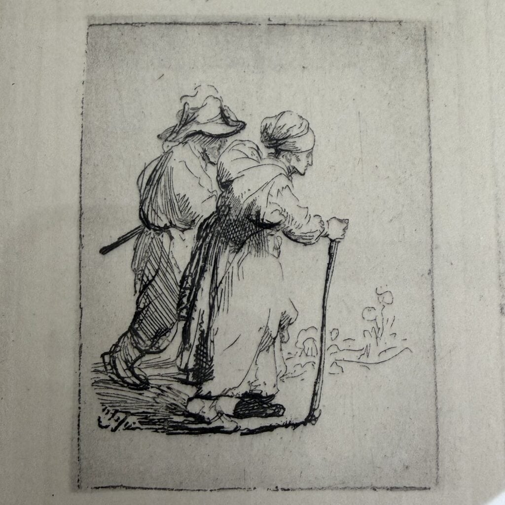 Rembrandt scratched a wax-coated copper plate with a needle. The plate was then placed in a bath of etching acid, causing the lines to be etched into the metal.