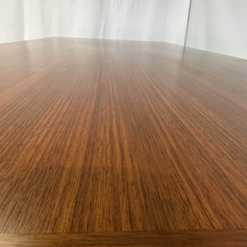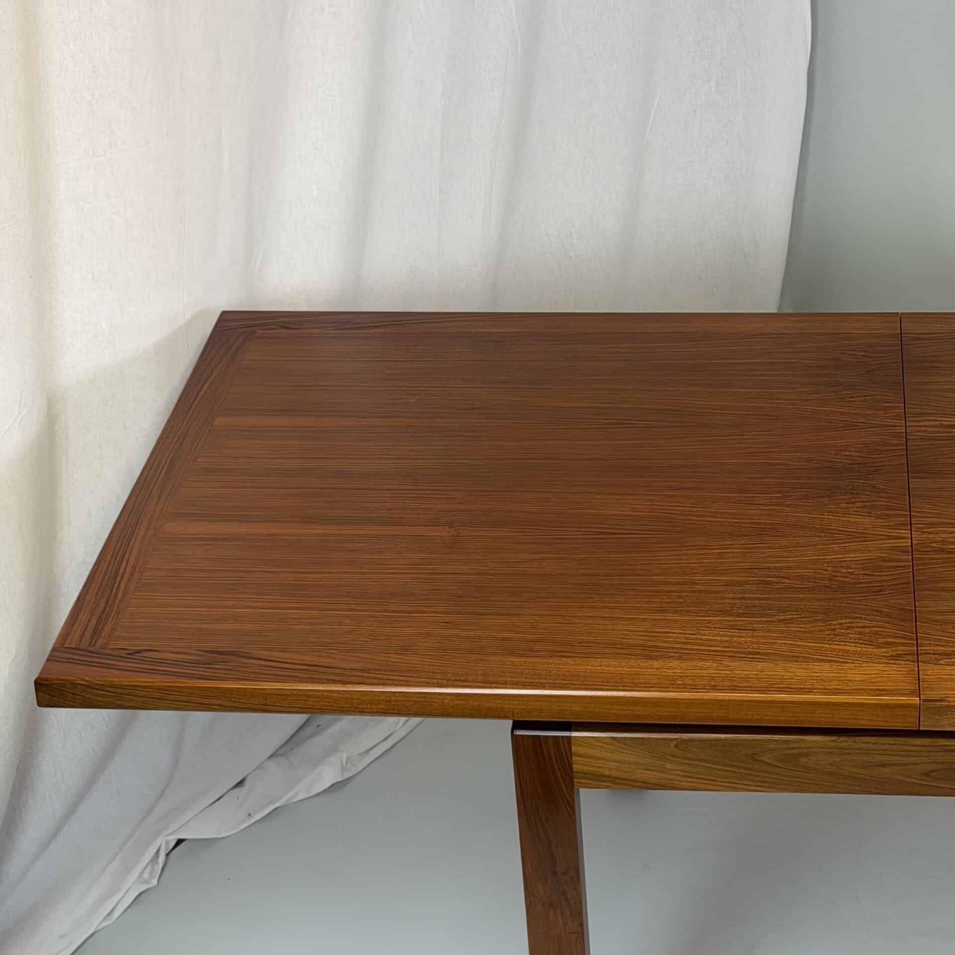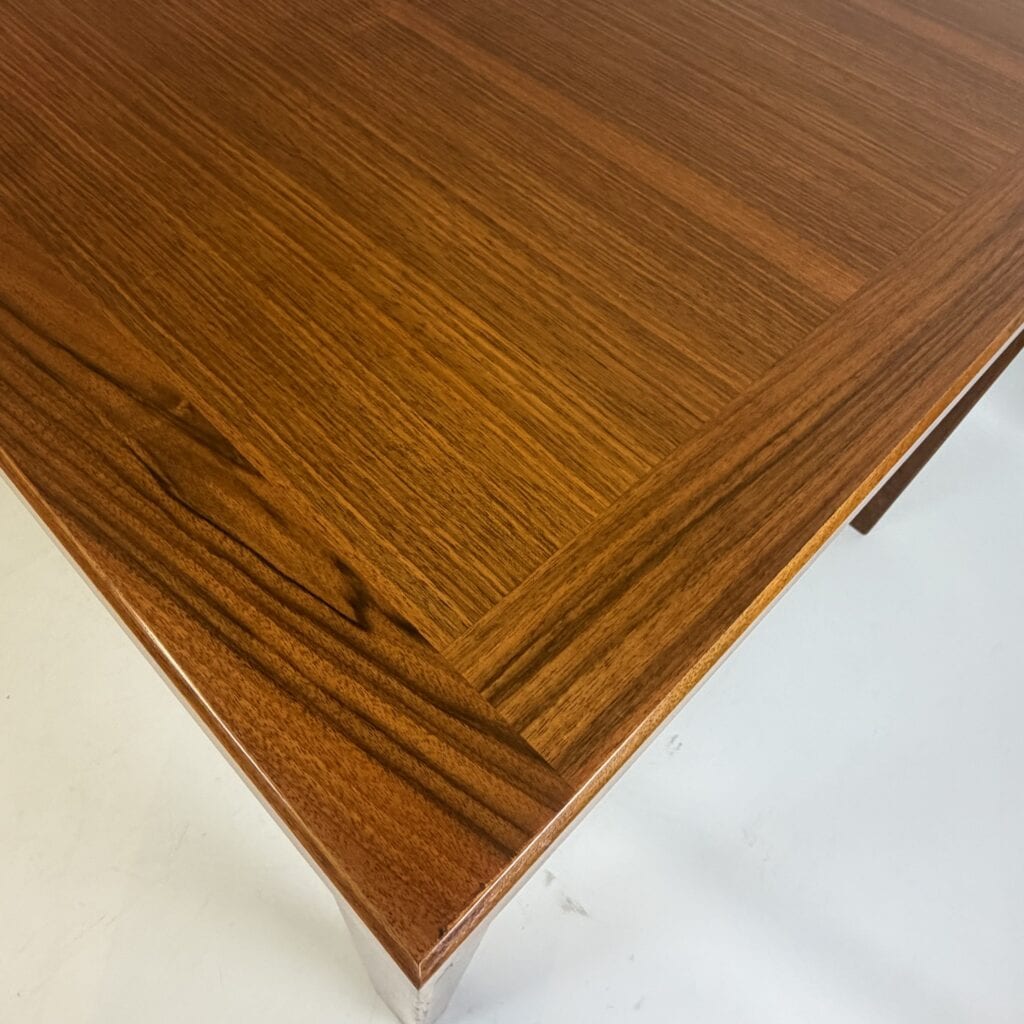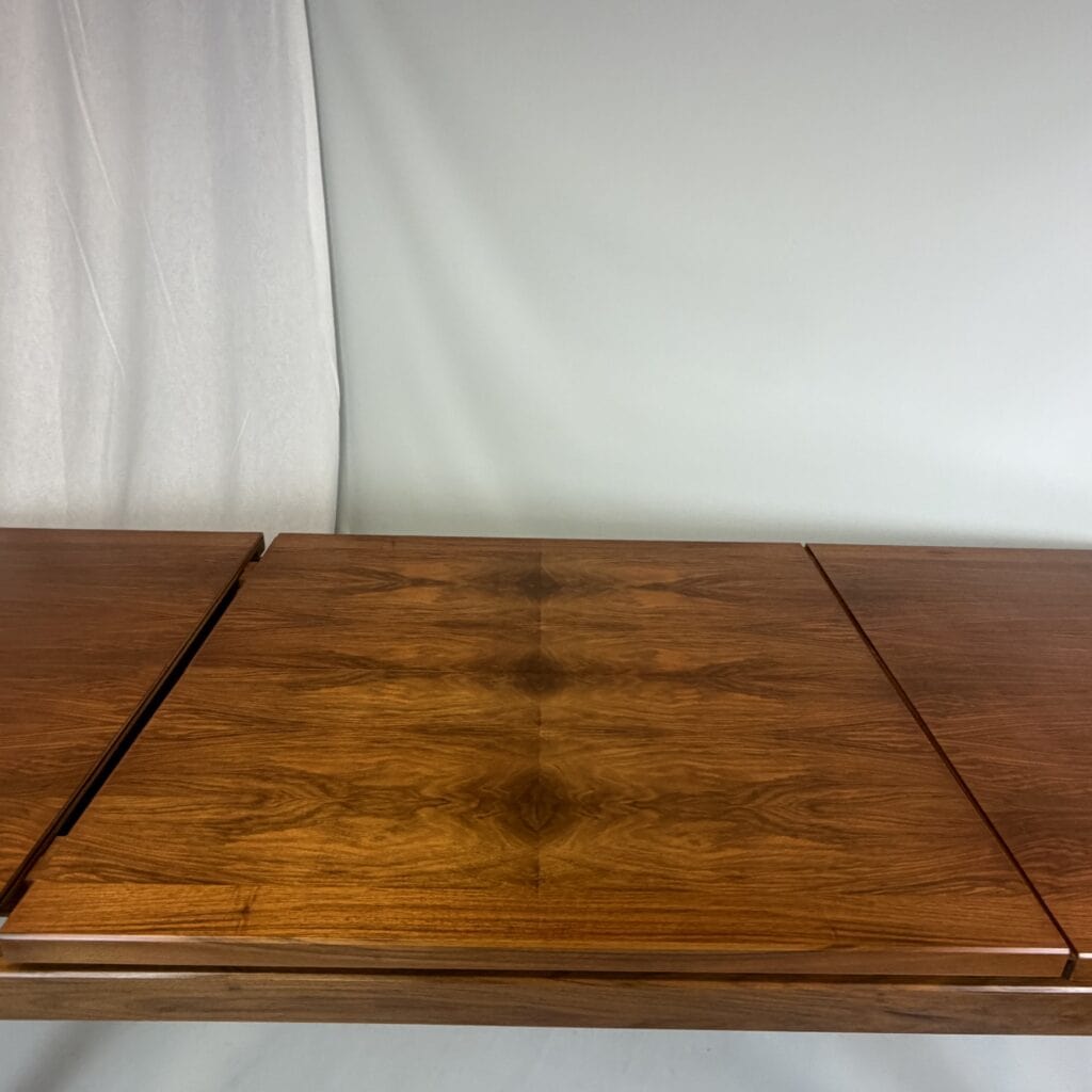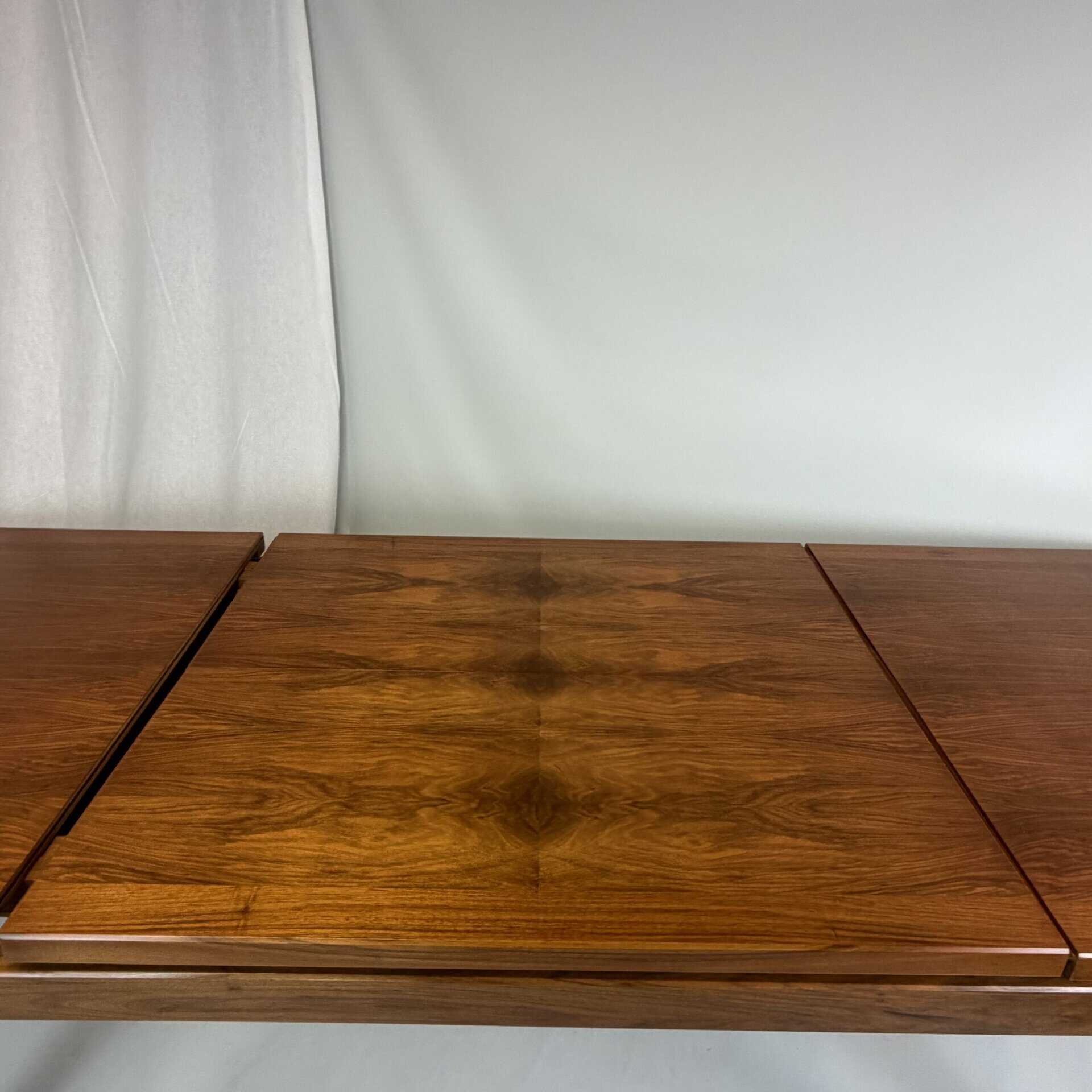 Rectangle dining table with rio rosewood veneer top, the book matched veneer with striking symmetrical grain pattern make this an eyecatcher for every interior