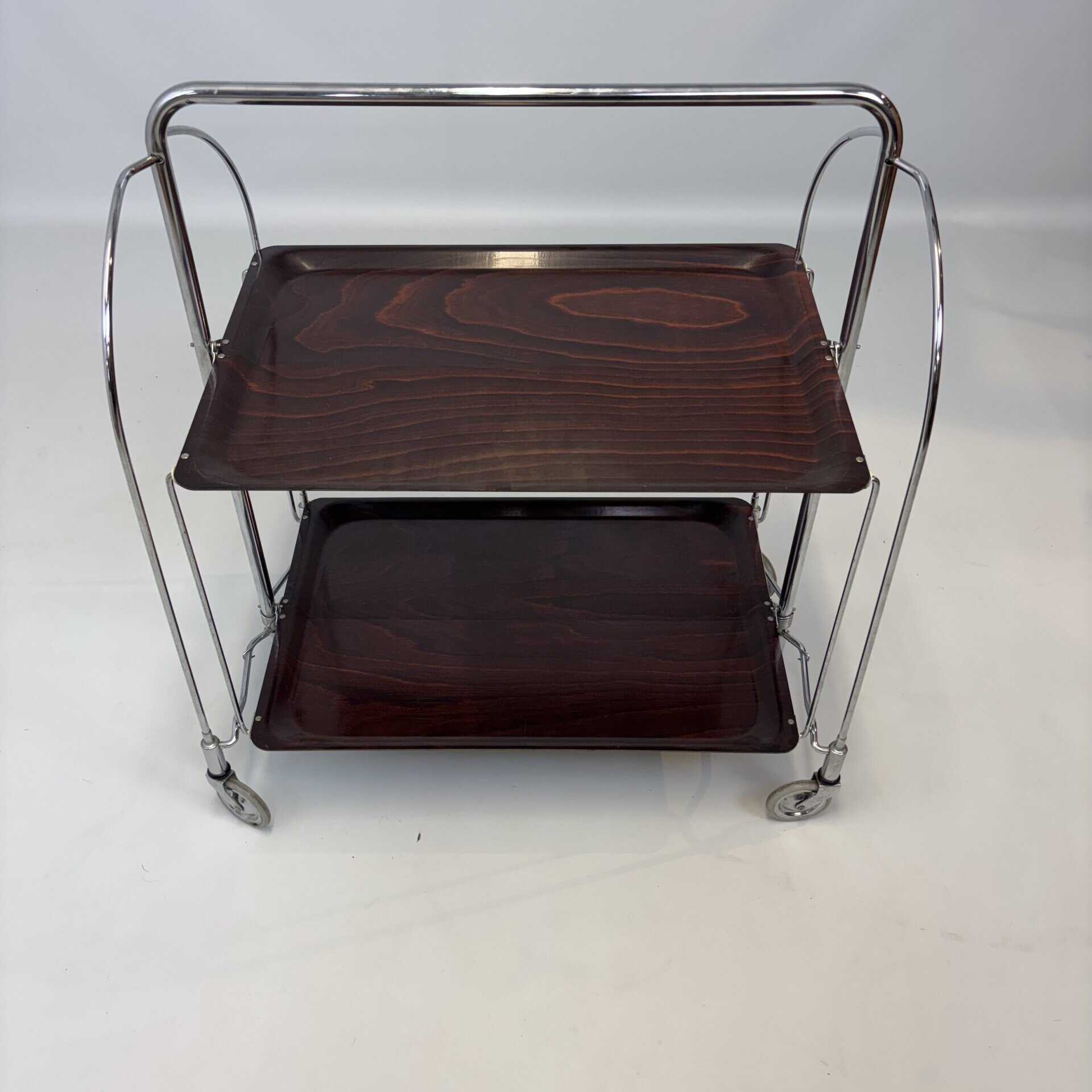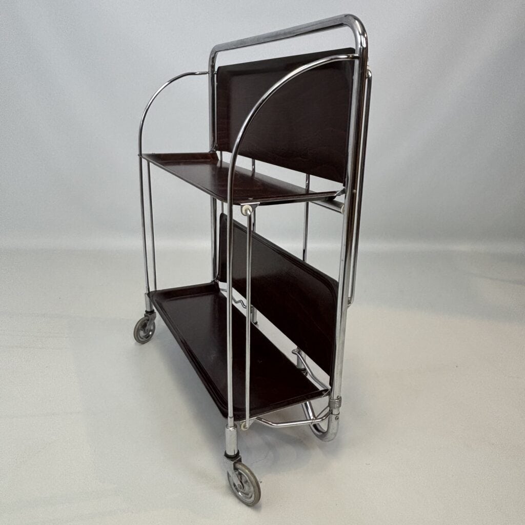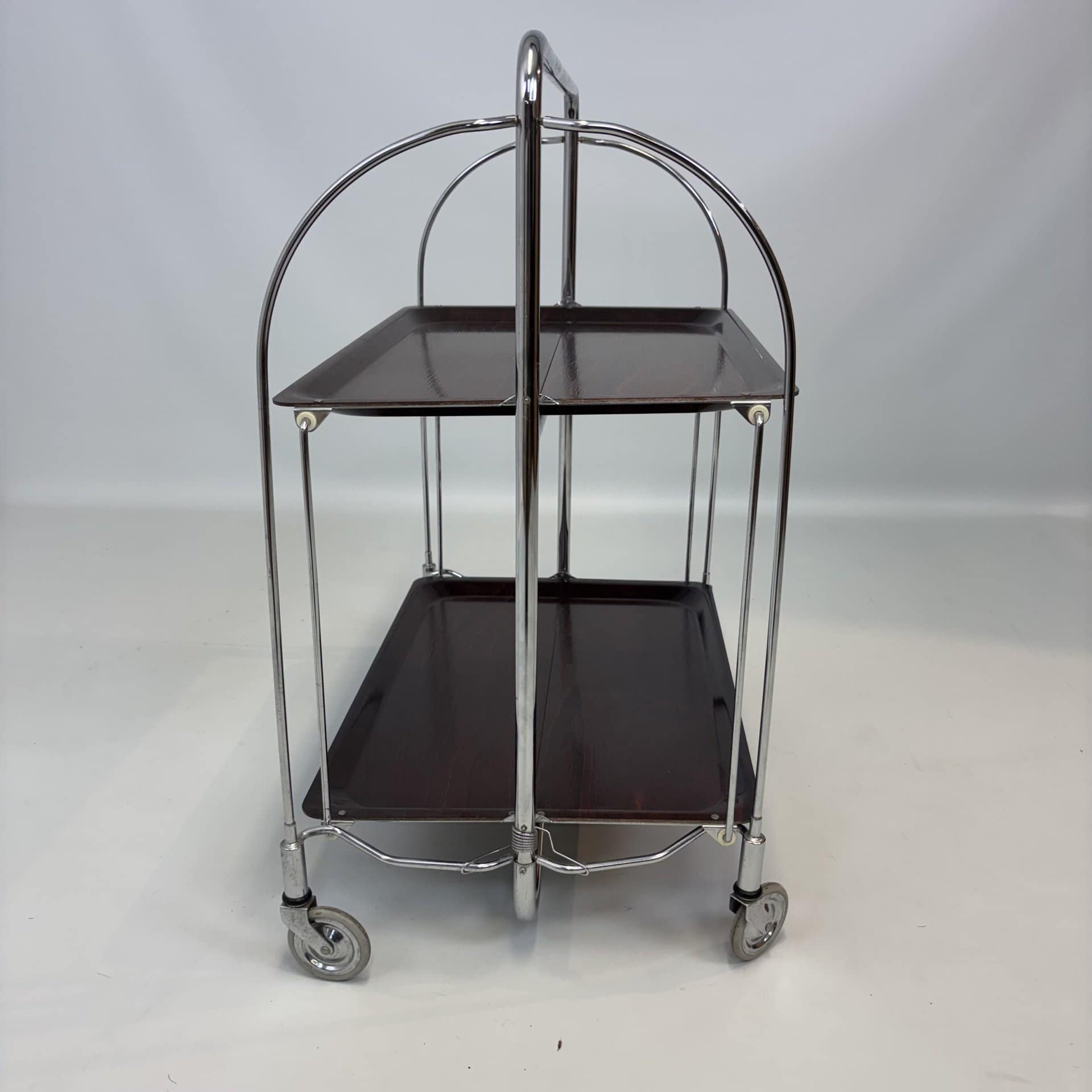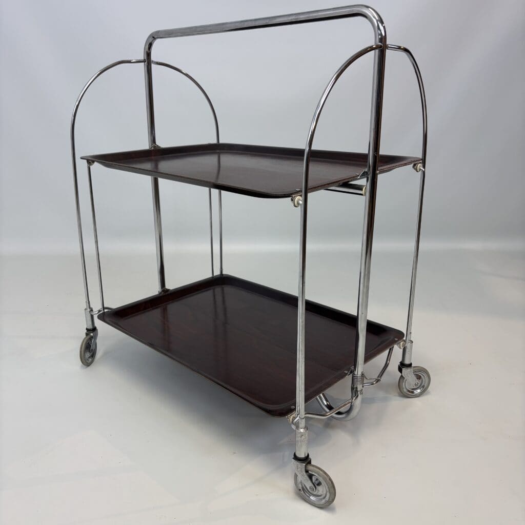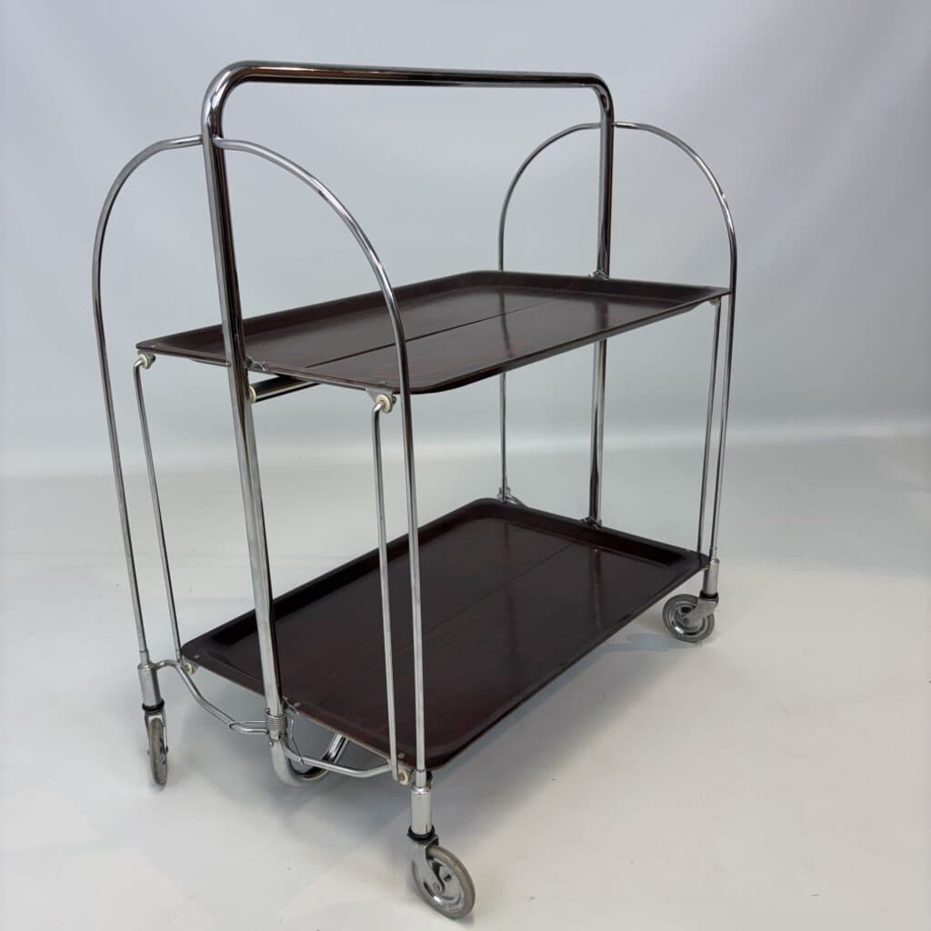 Silver-colored, chromed metal frame with 2 brown/reddish trays