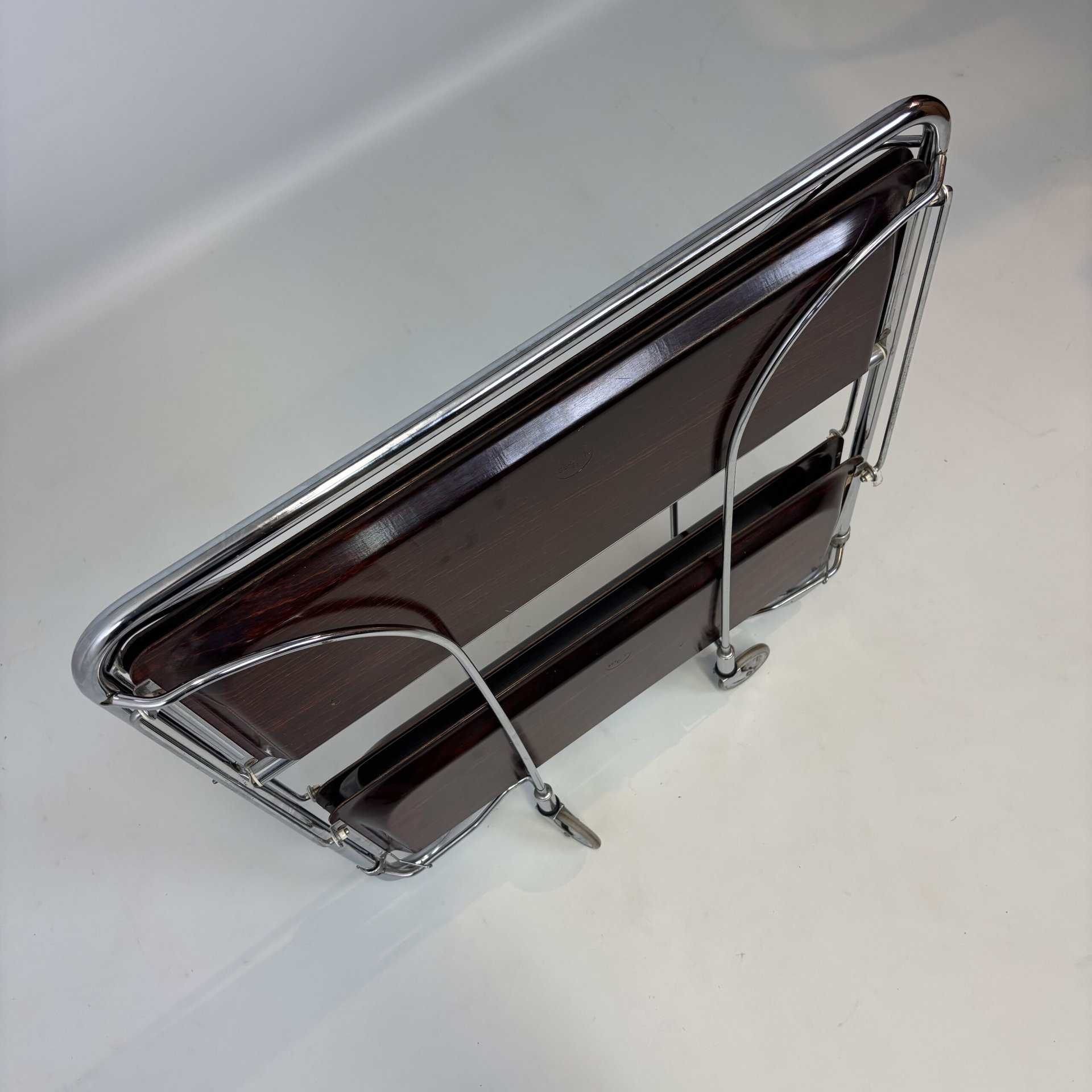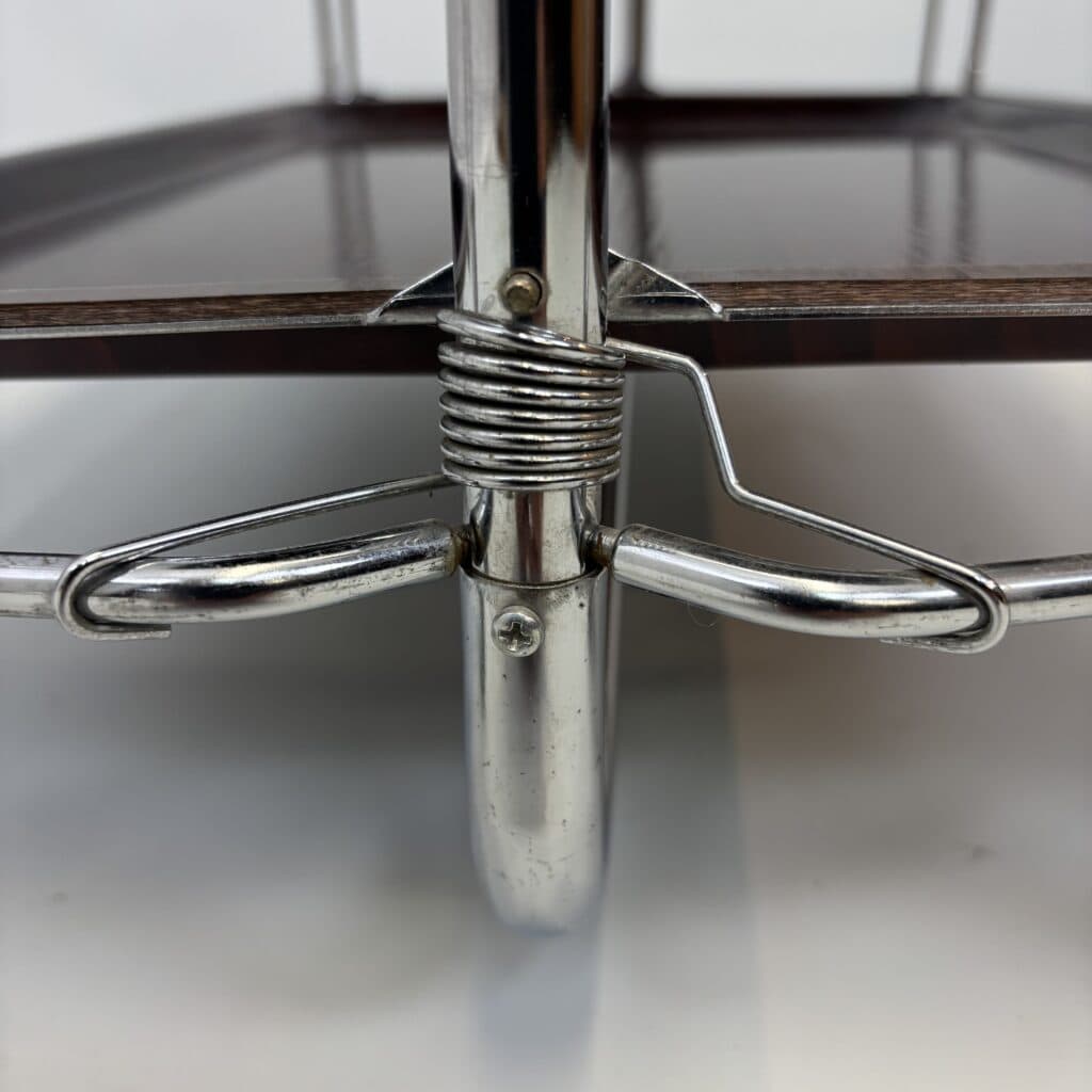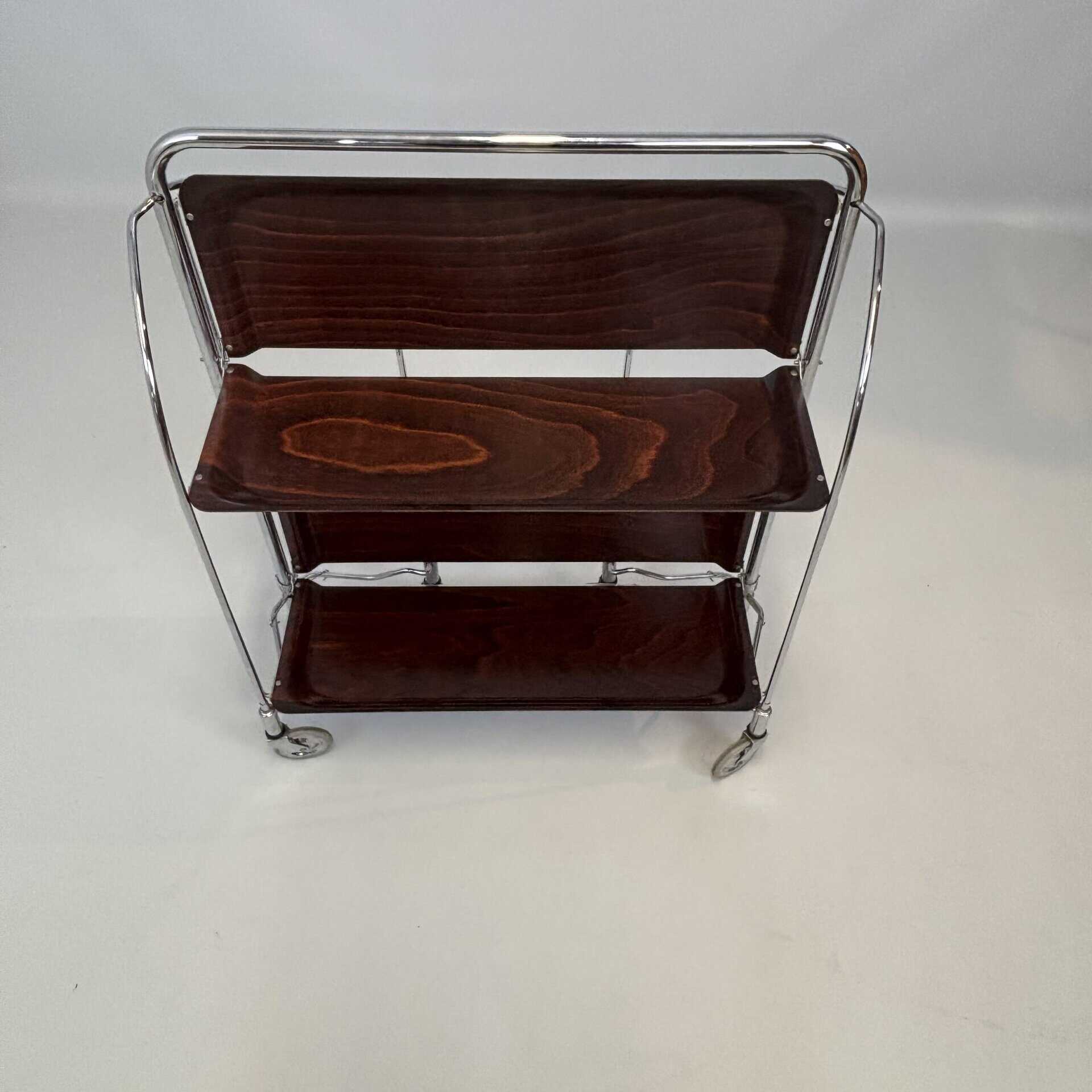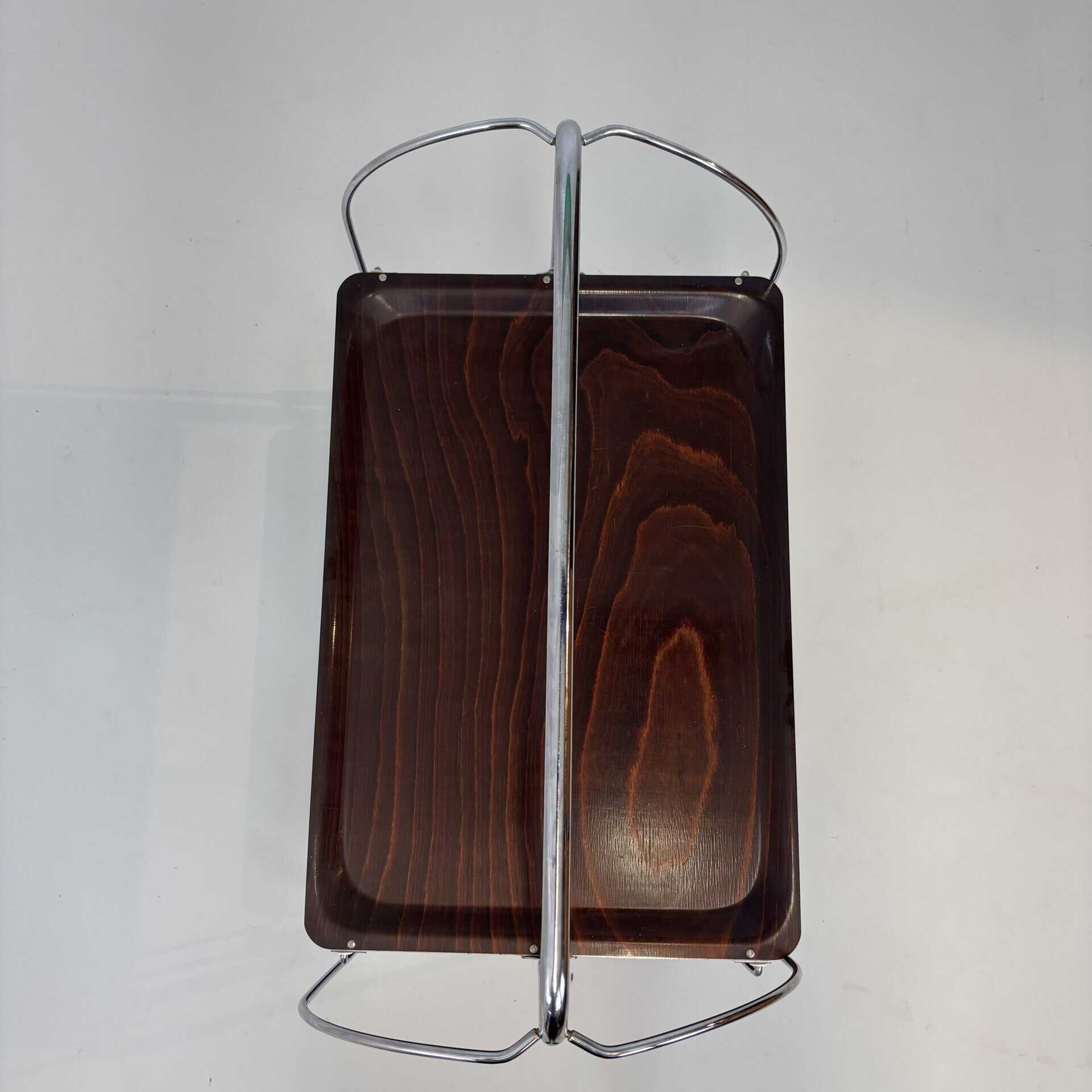 Silver-colored, chromed metal frame with 2 brown/reddish trays