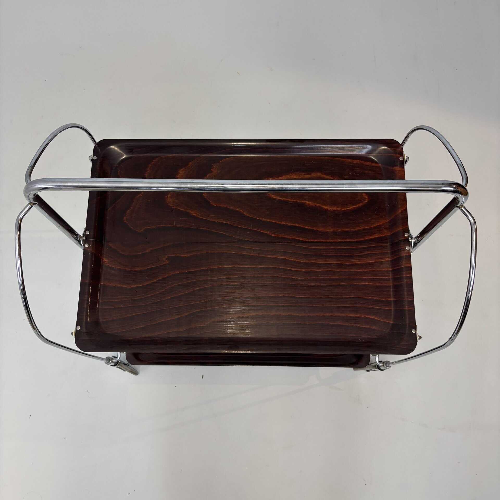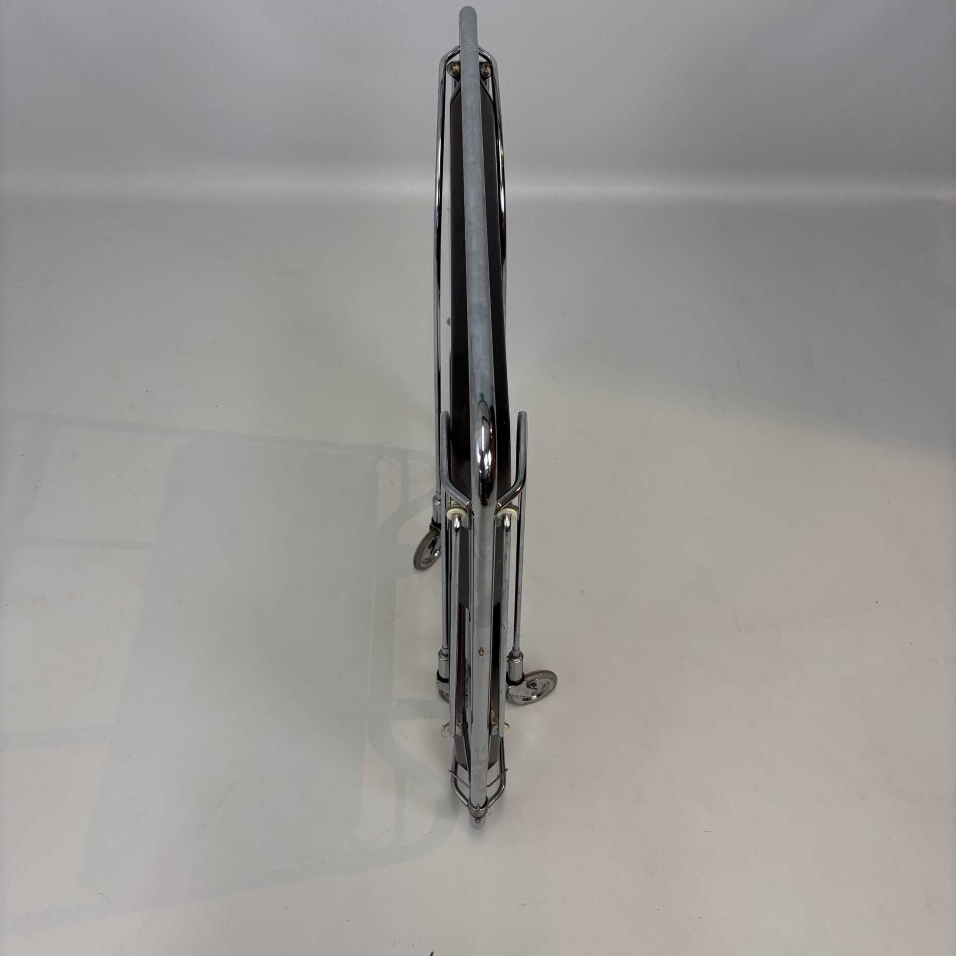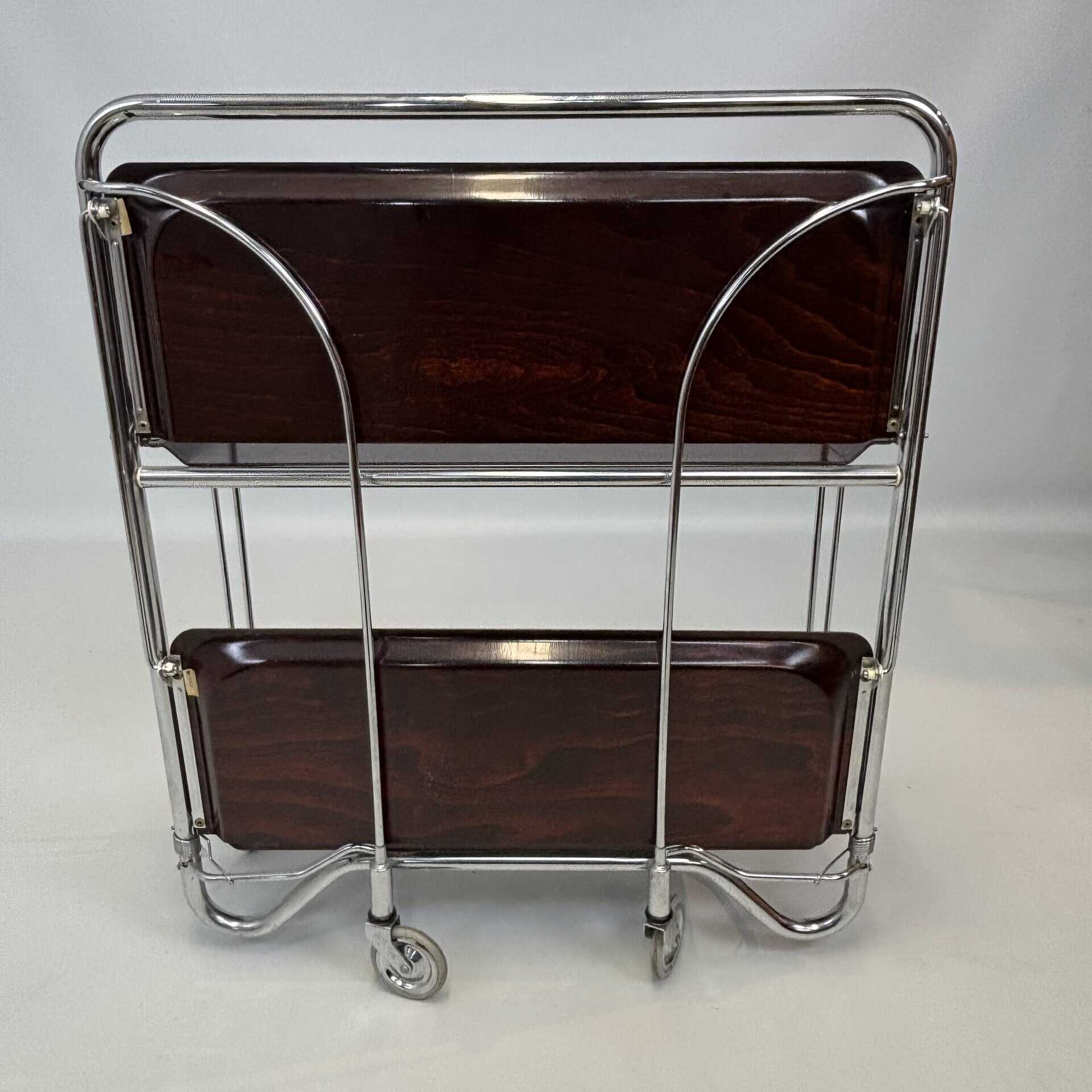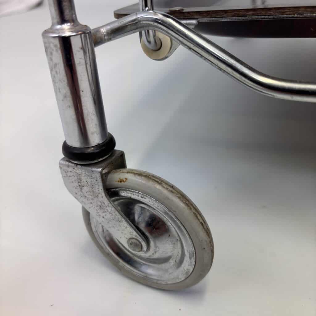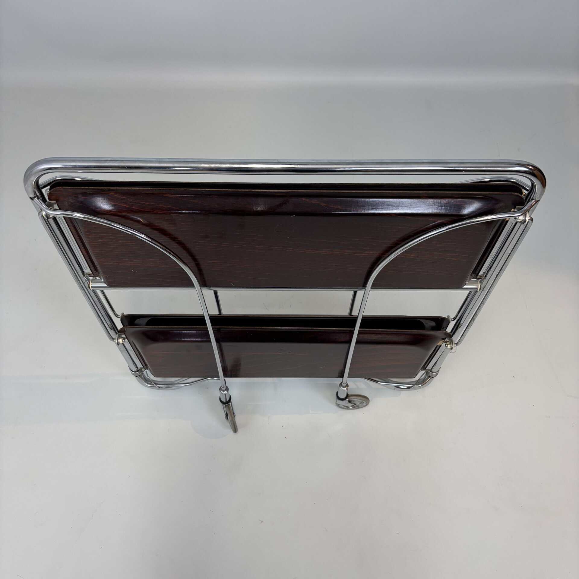 Silver-colored, chromed metal frame with 2 brown/reddish trays
