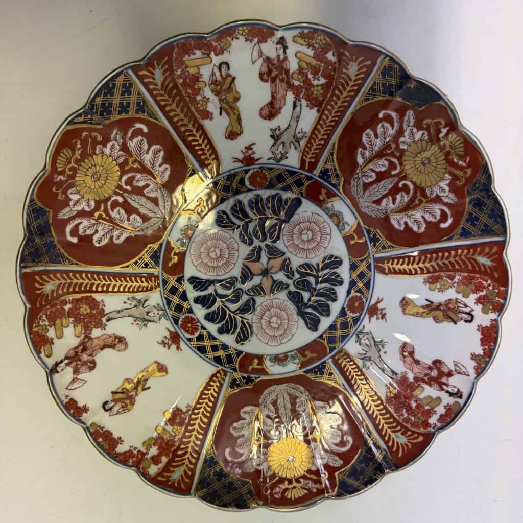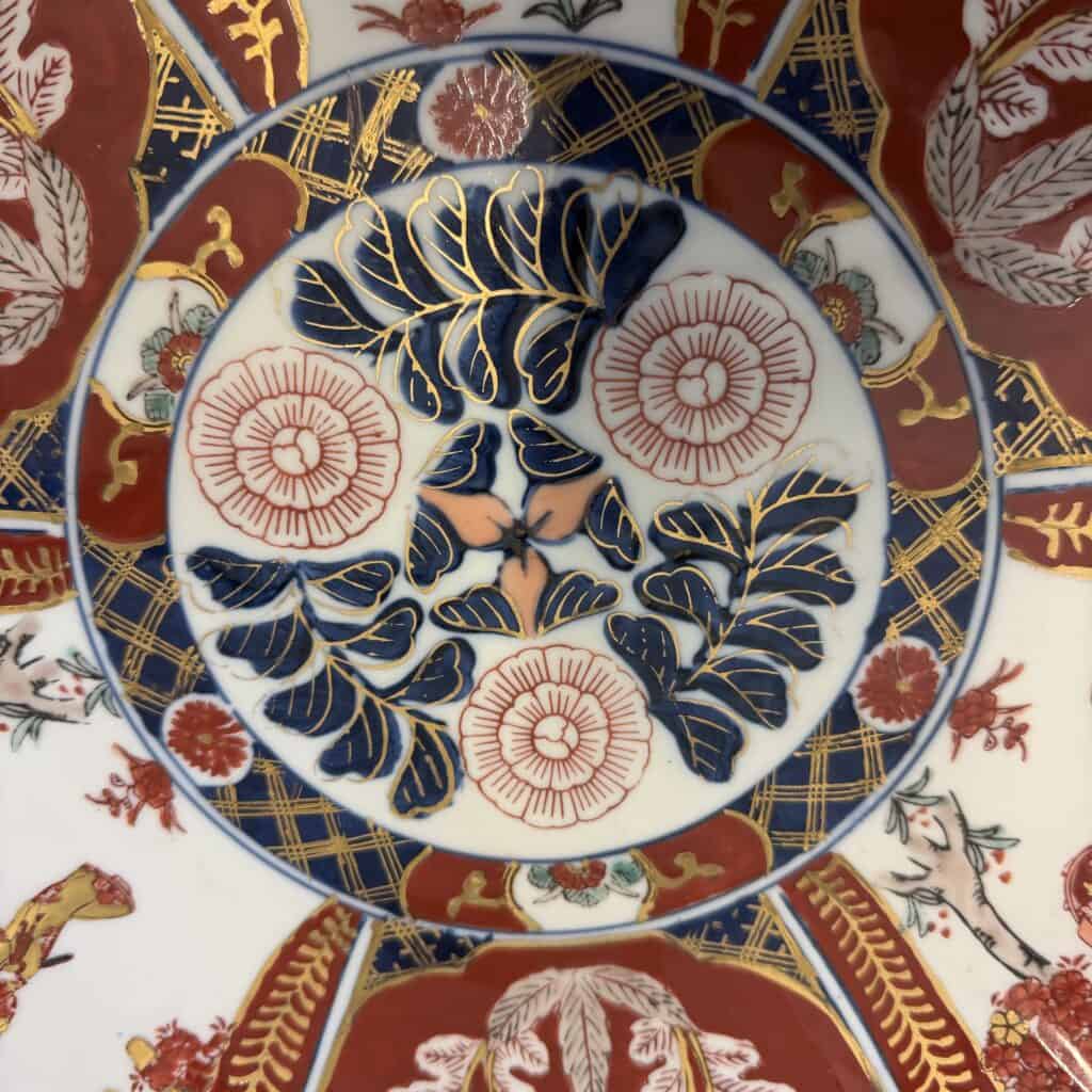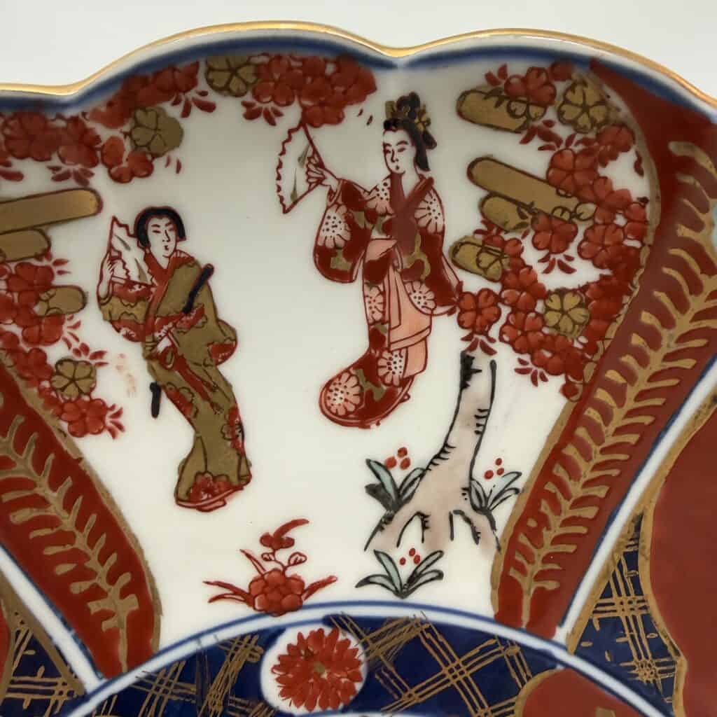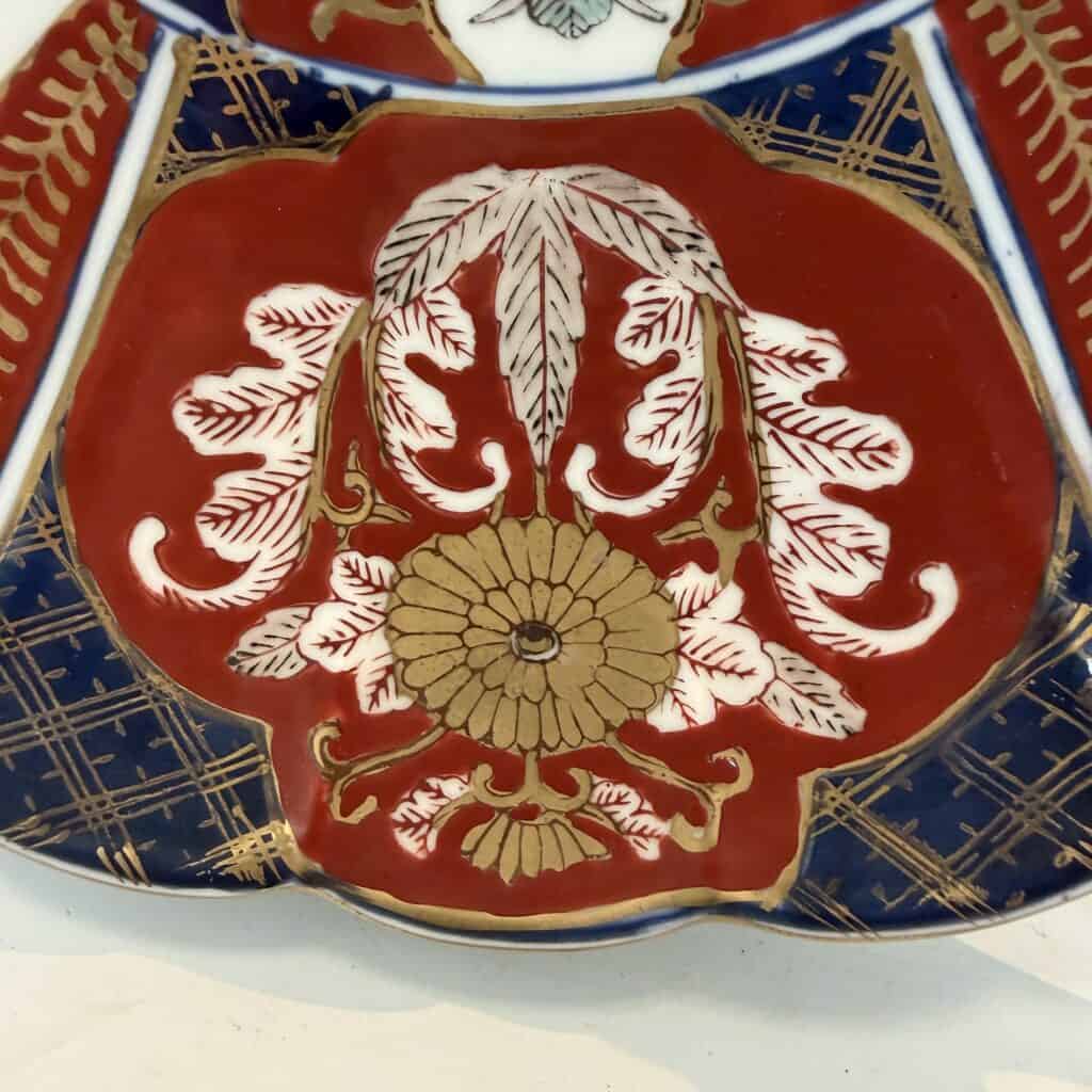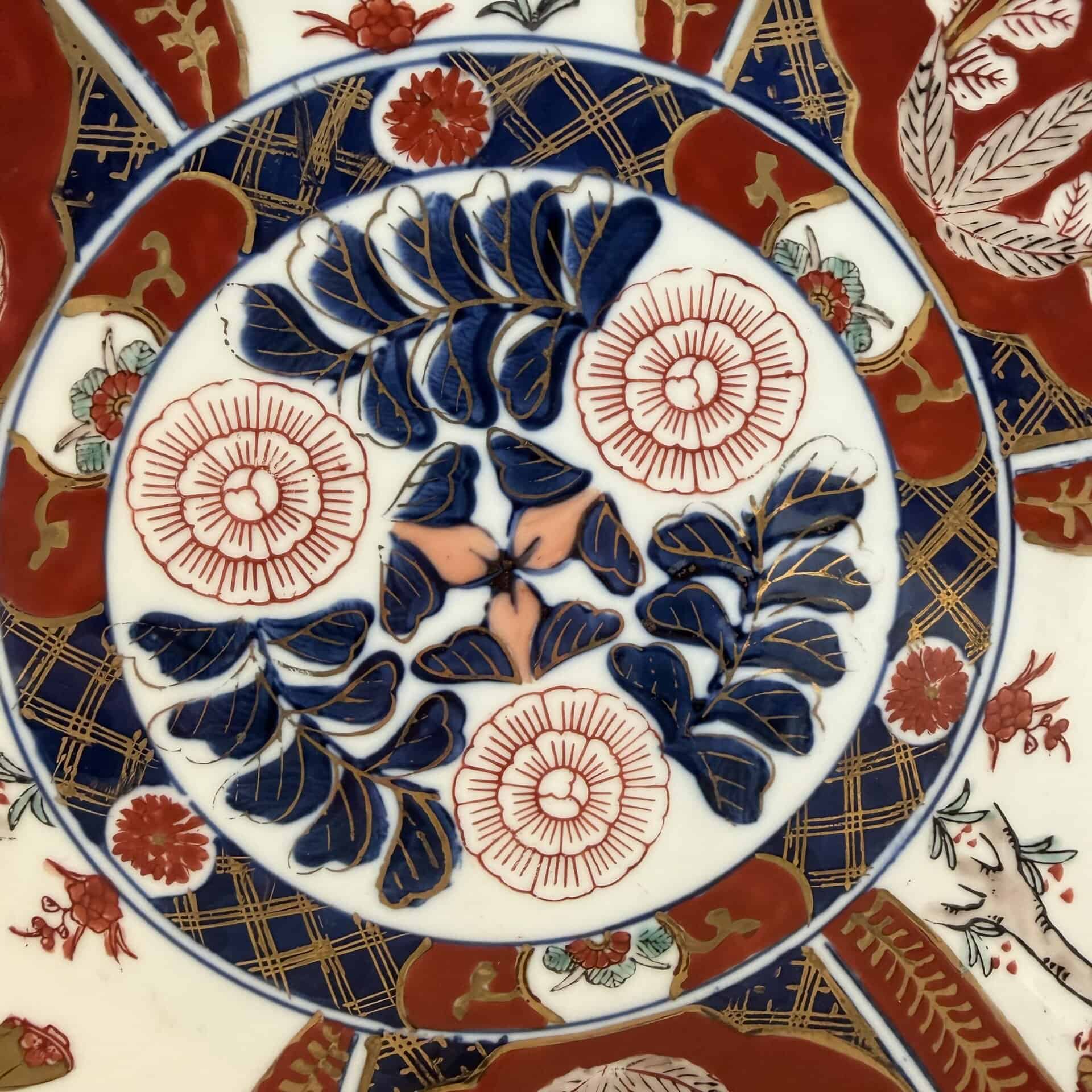 The decoration uses the classic Imari palette of bright cobalt blue underglaze, iron red and gold overglaze, against a white porcelain background.