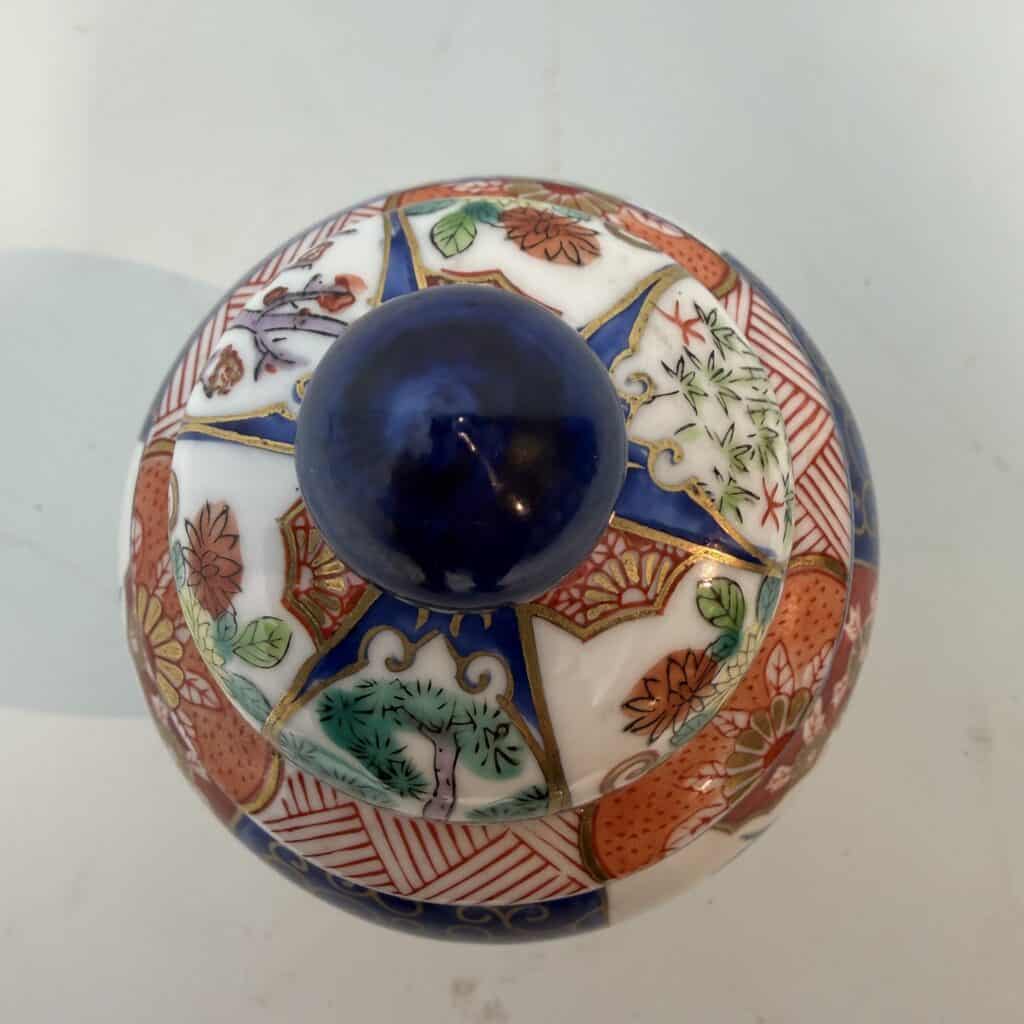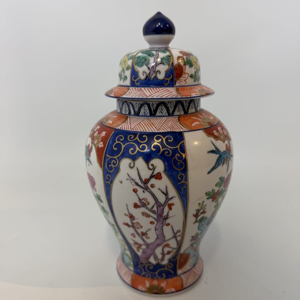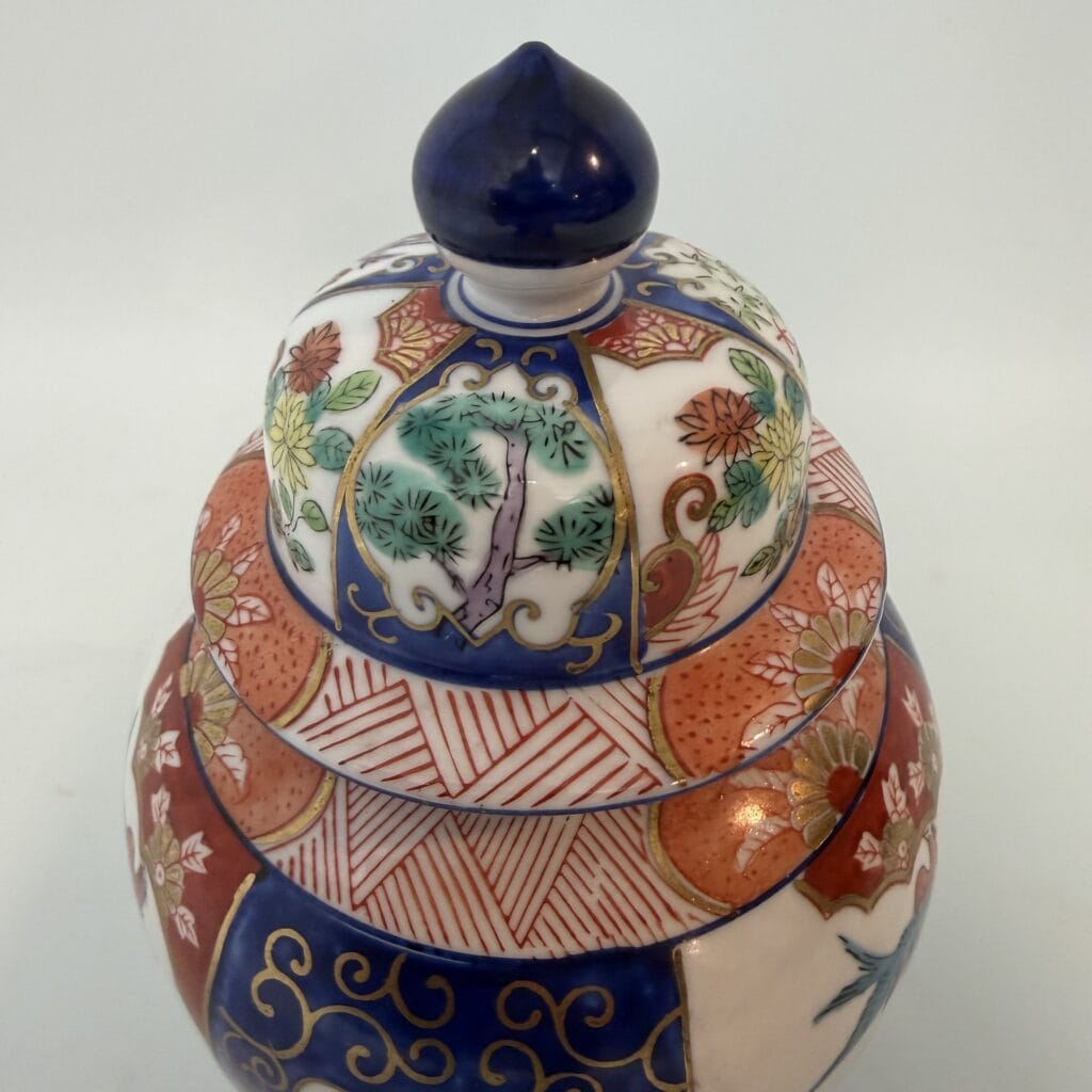 Lidded vase in classic Imari style, the typical combination of cobalt blue, iron red and gold on a white porcelain background creates a beautiful colour palette.