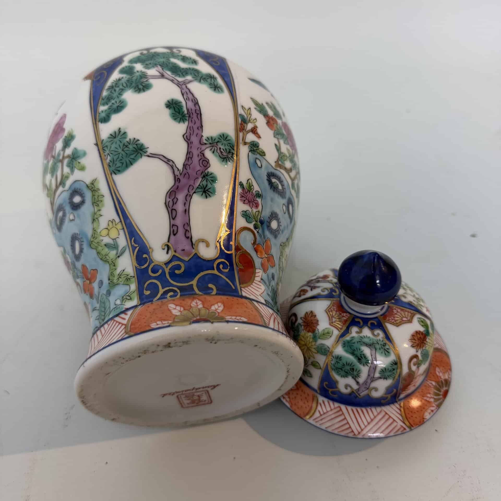 The ginger pot or temple pot is hand-painted with birds and flowers.