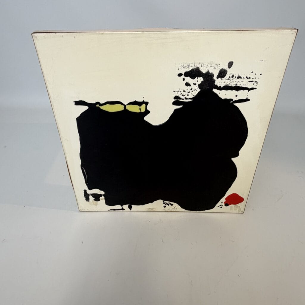 The overall style is abstract and expressive, with small black splatters and drips scattered around the main form, adding a dynamic, energetic quality to the piece