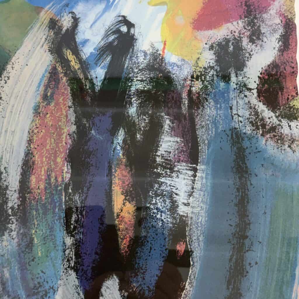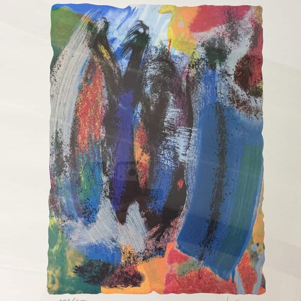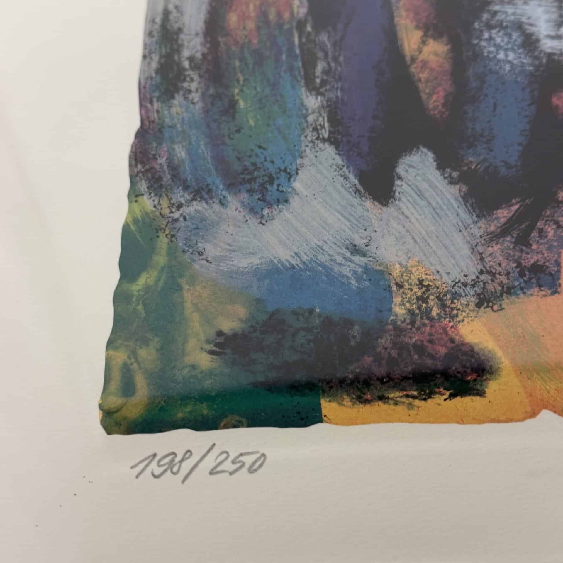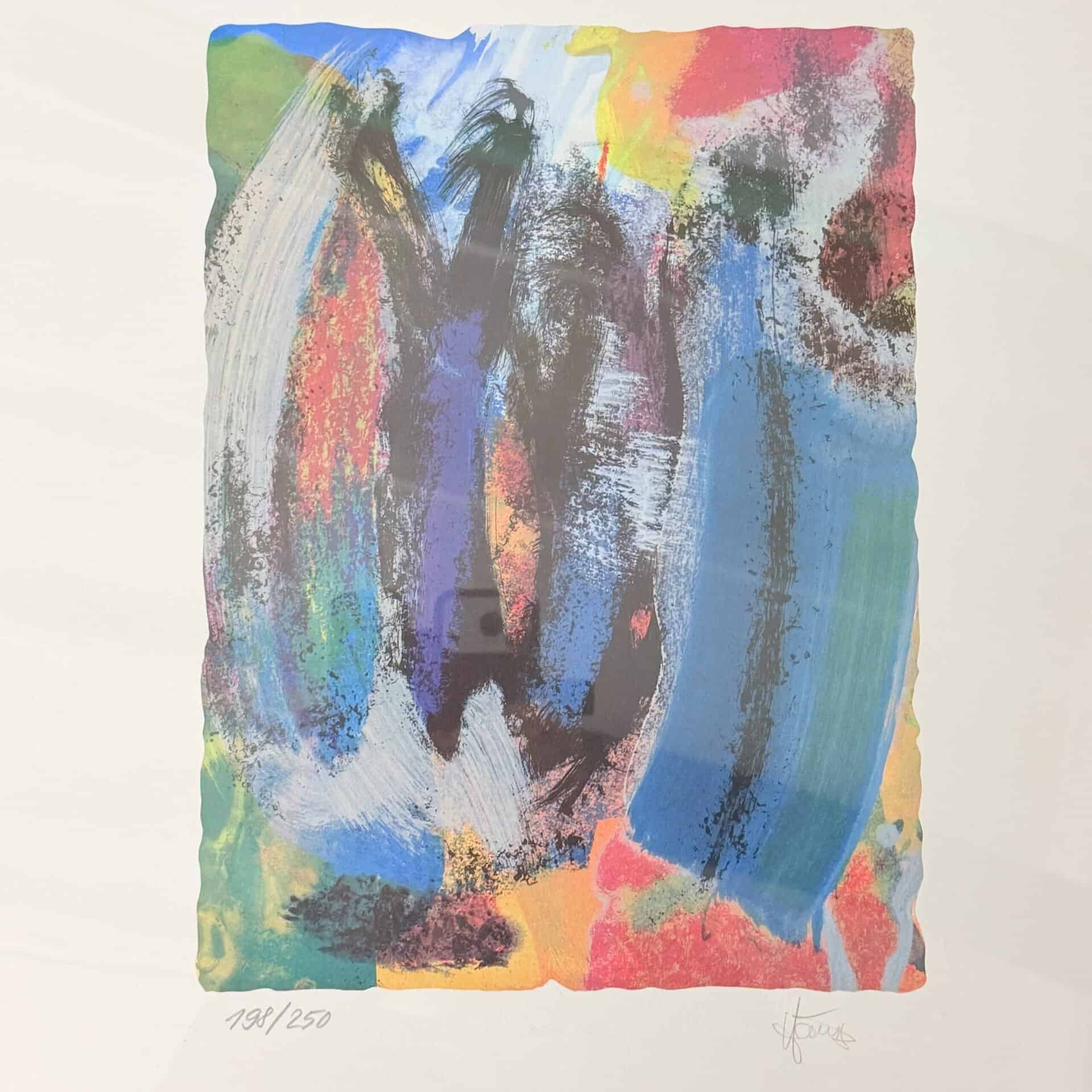 Expressionistic lithography characterized by a dynamic, vibrant composition in vivid colours