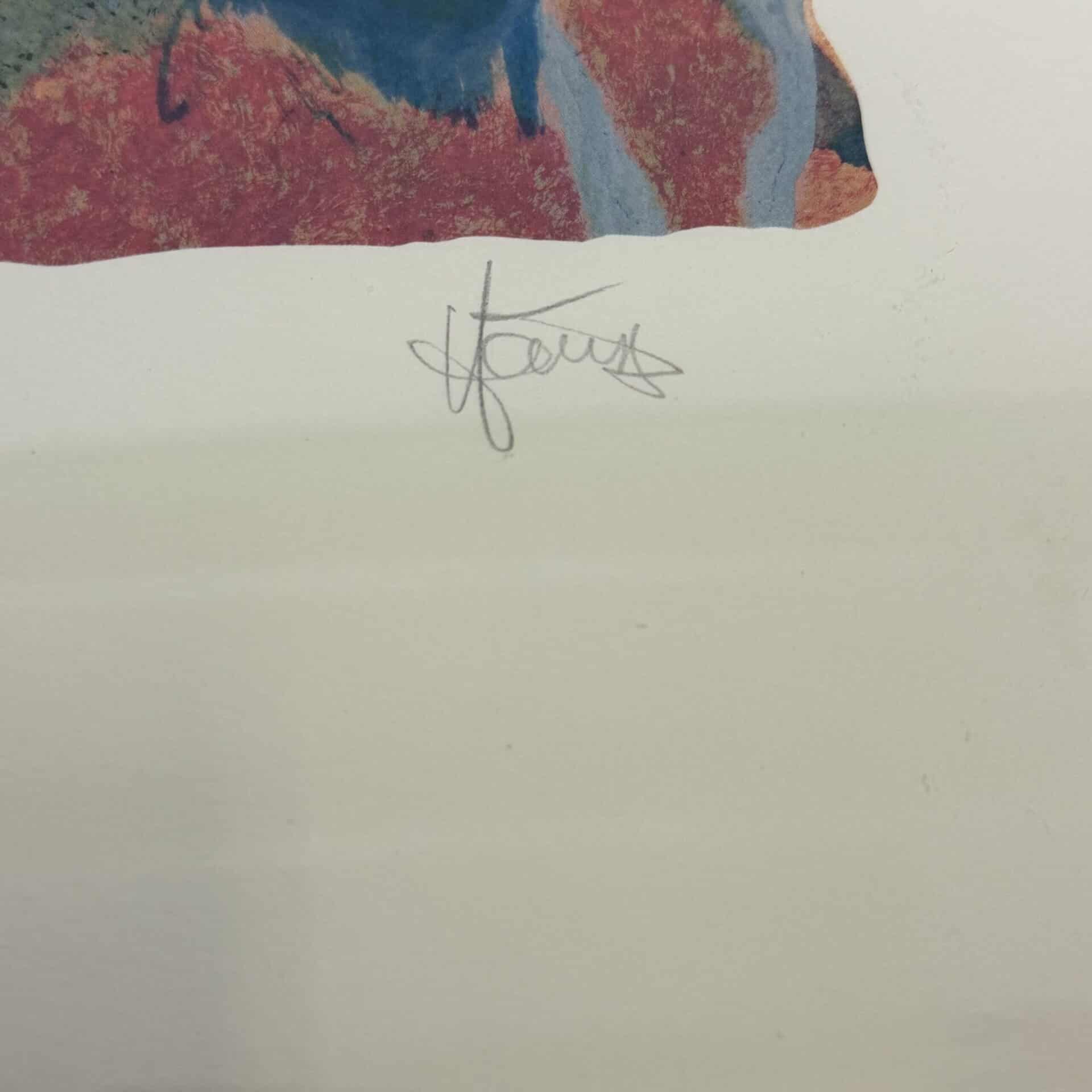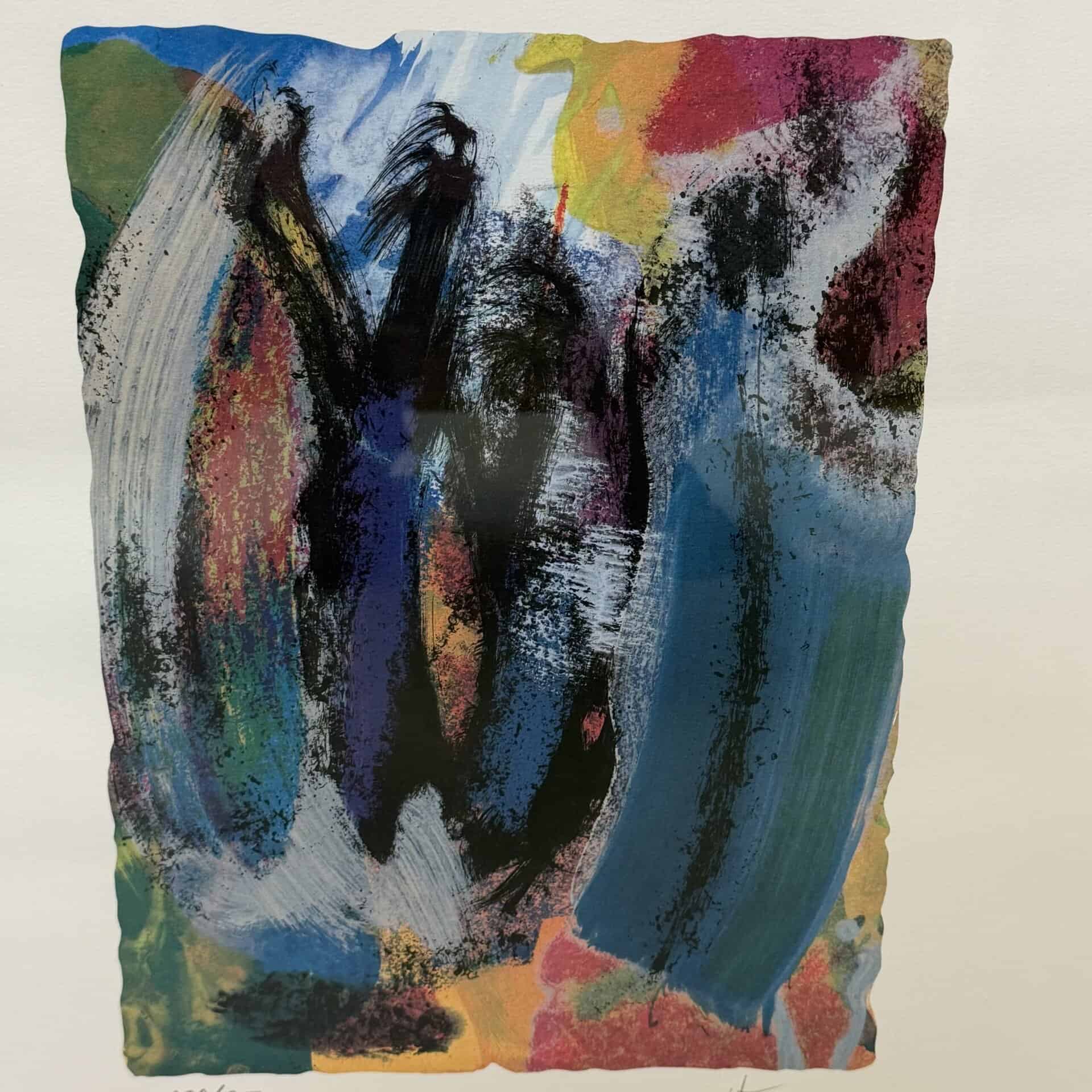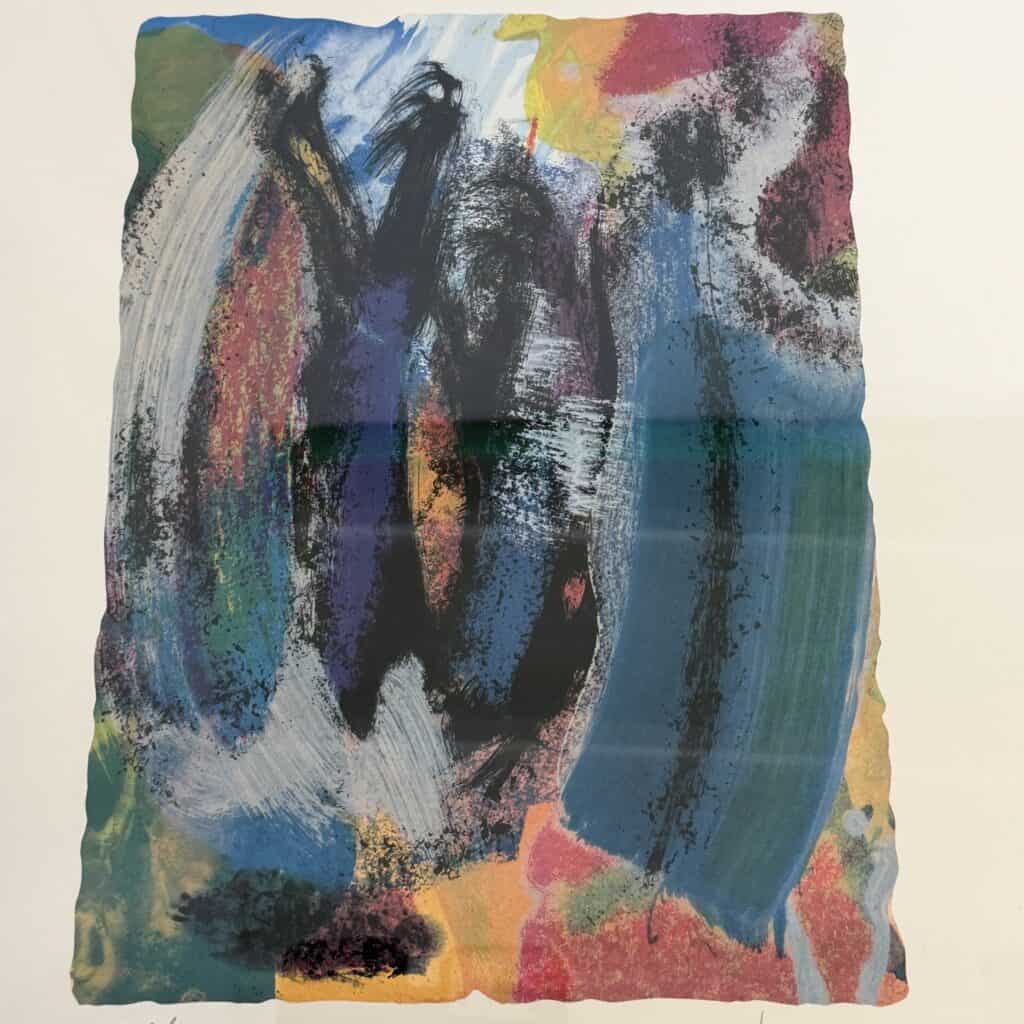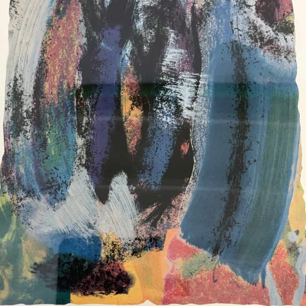 Expressionistic lithography characterized by a dynamic, vibrant composition in vivid colours