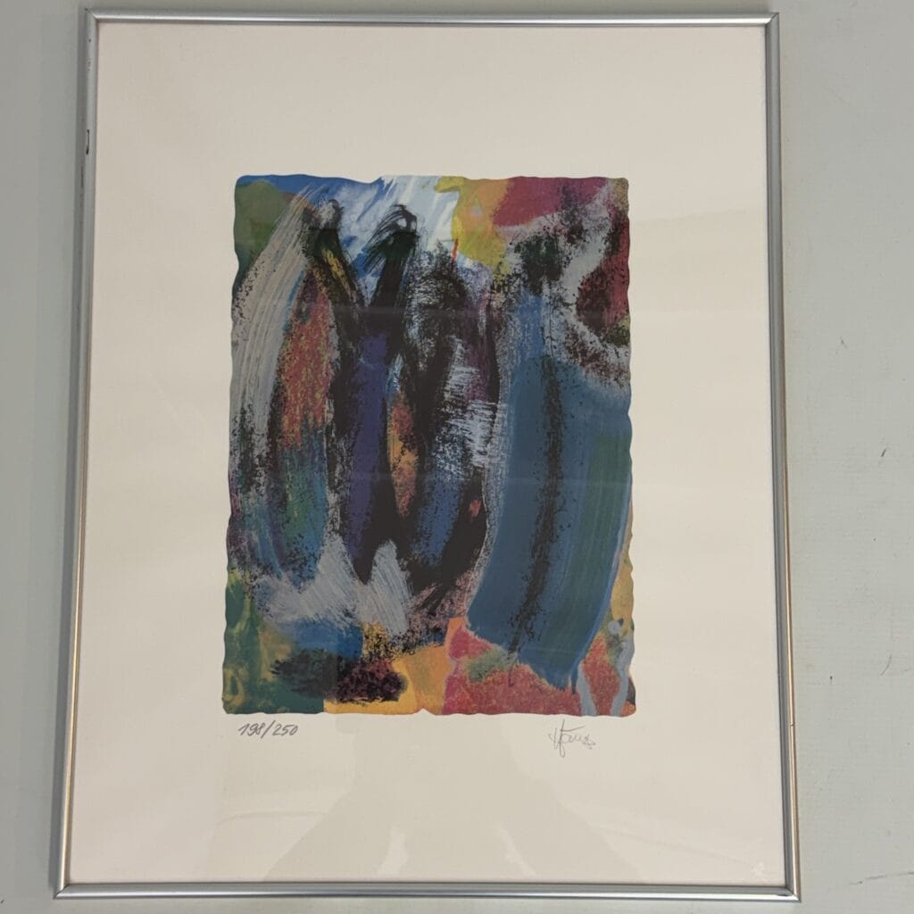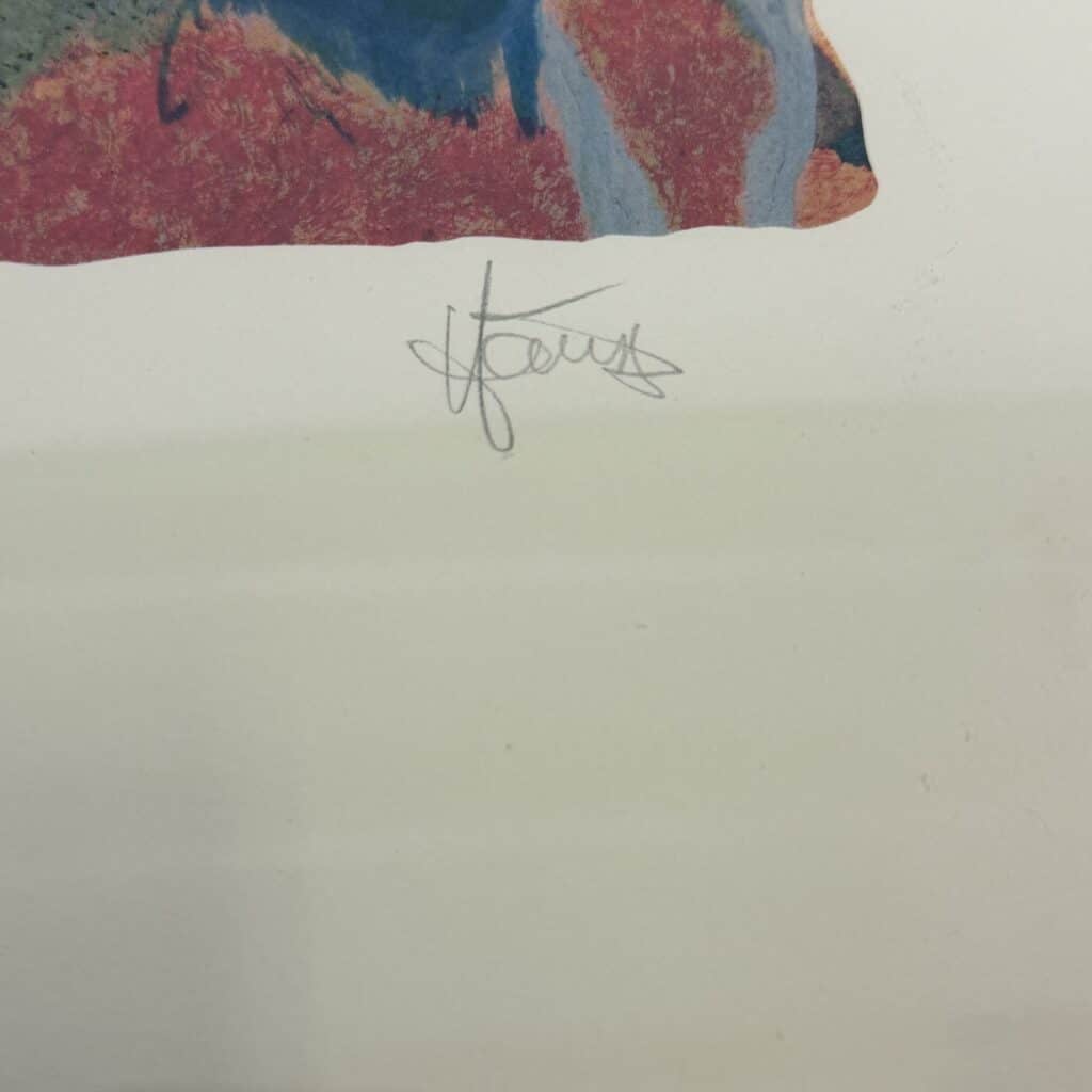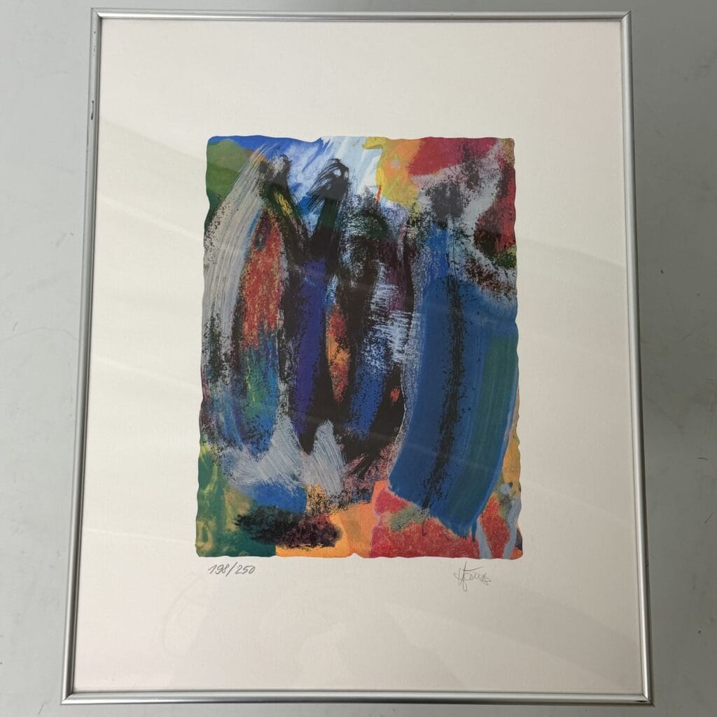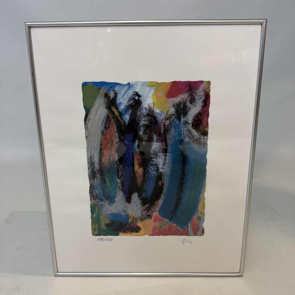 Expressionistic lithography characterized by a dynamic, vibrant composition in vivid colours