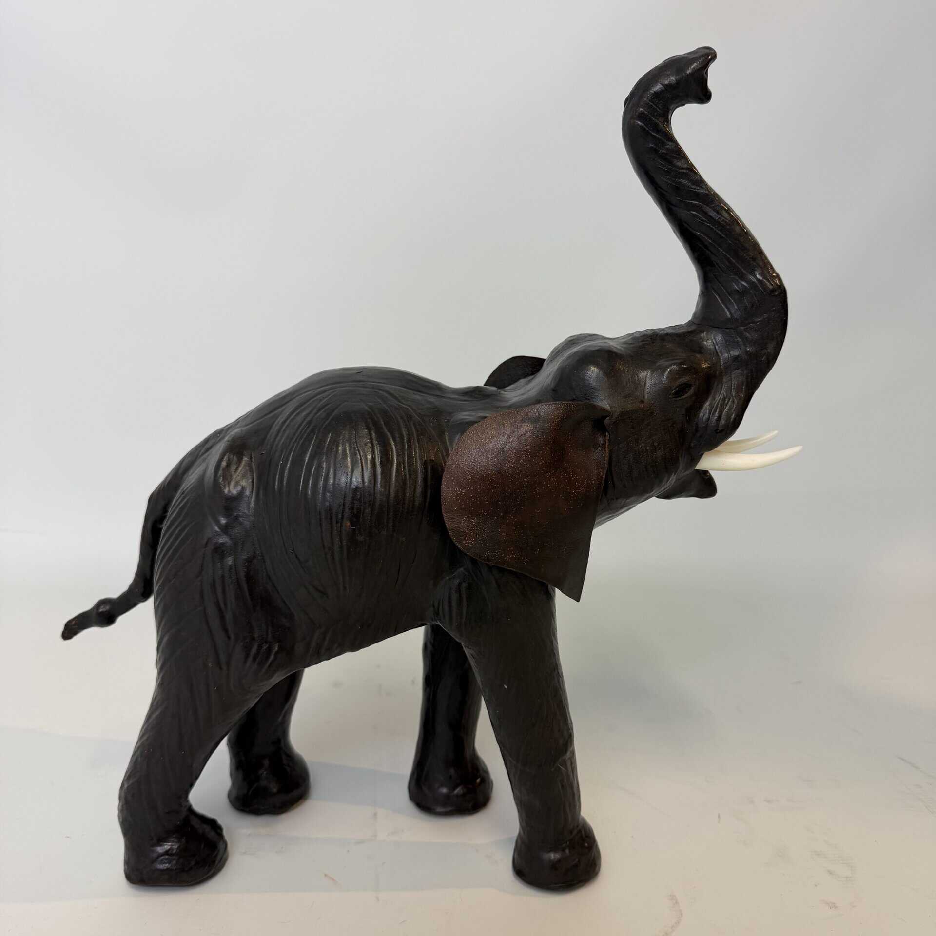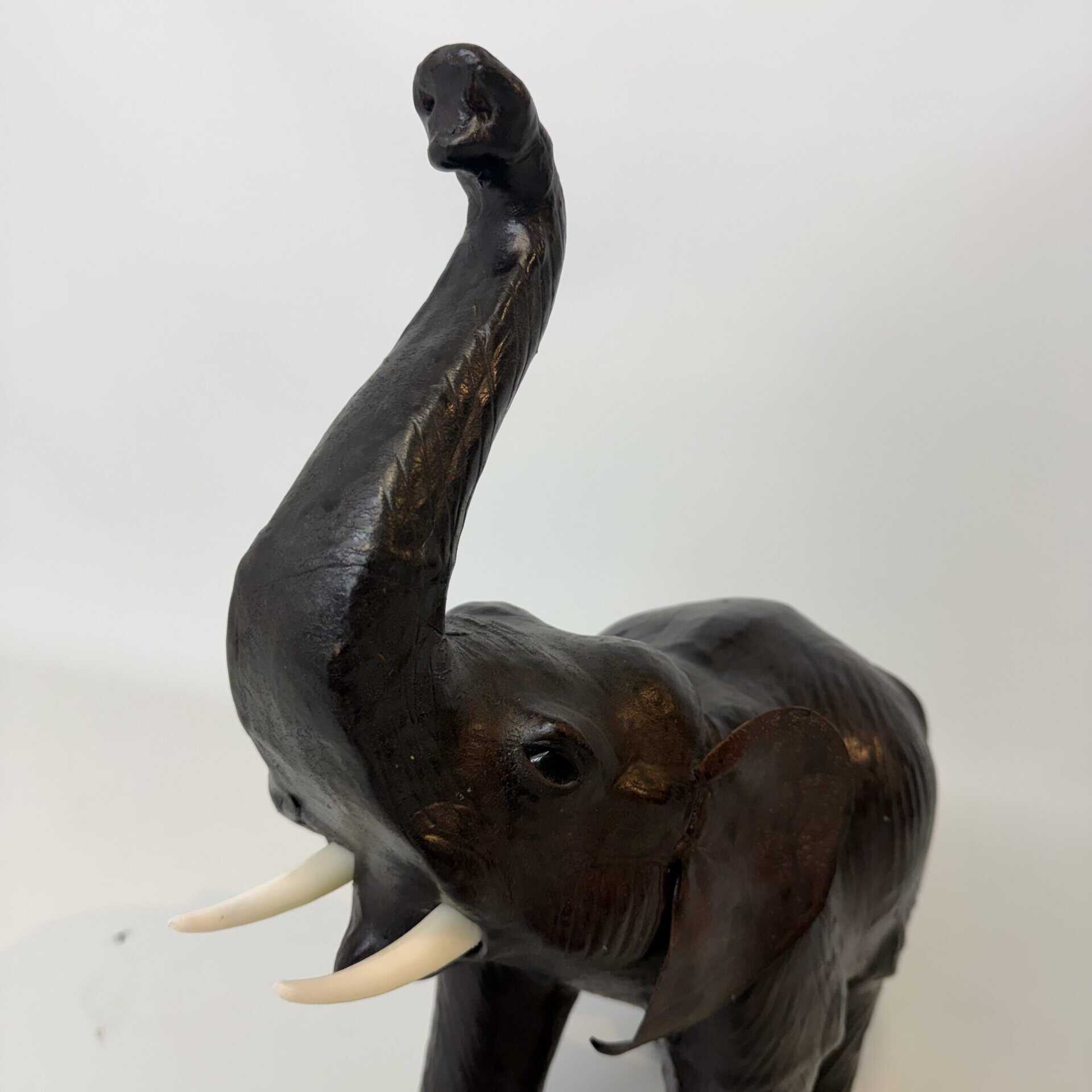 Modelled and detailed sculpture of striding elephant model with trunk raised and original faux tusks. the inside is probably made out of paier-maché or straw and covered with a quality brown leather with a desirable patina and plastic tusks