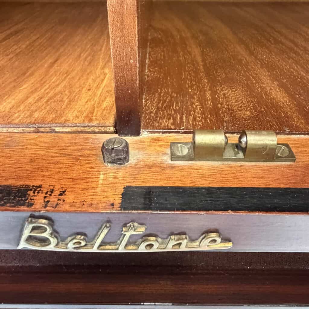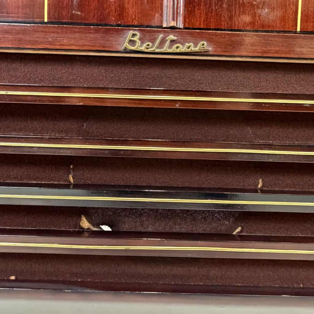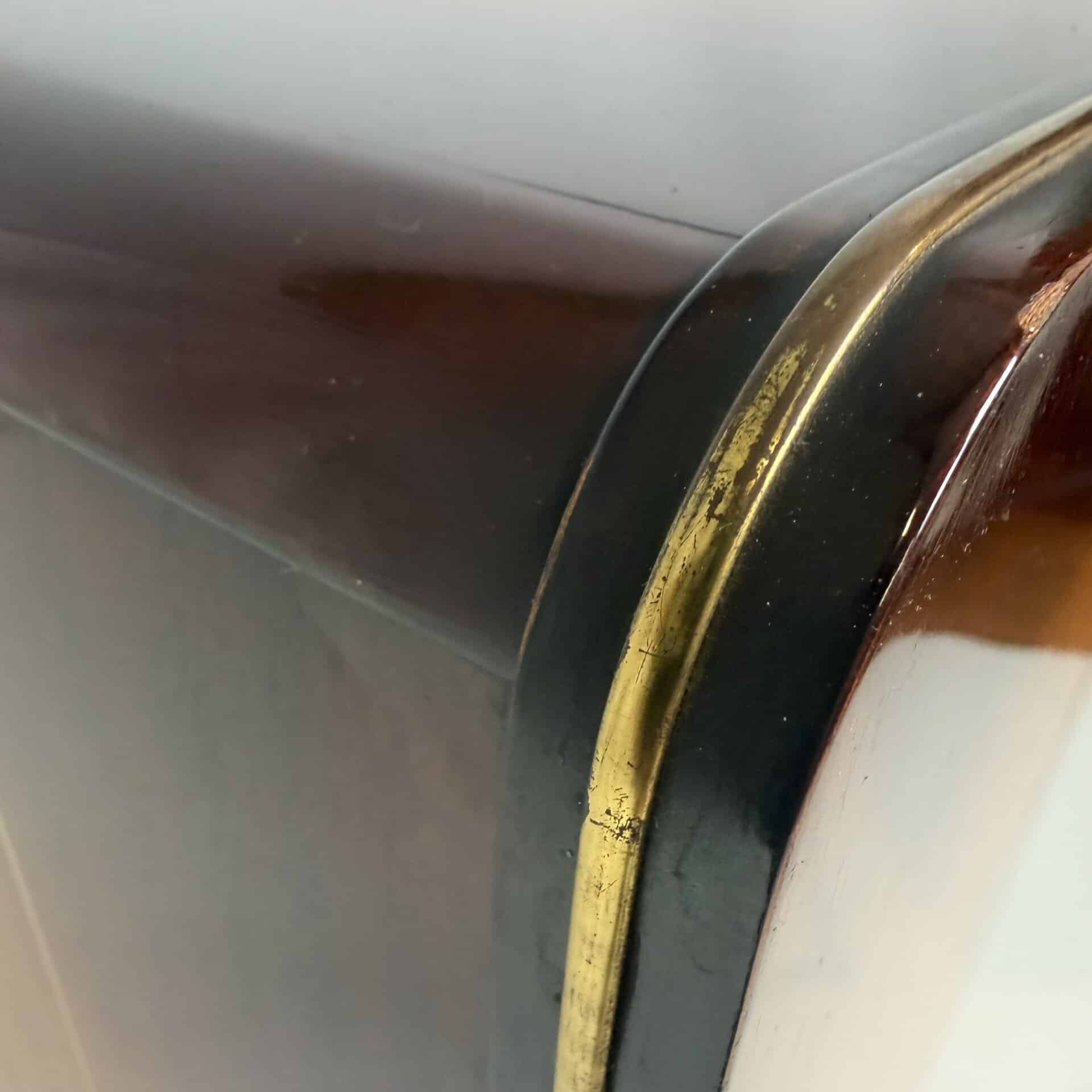 The distinctive horizontal brass lines at the bottom cover the soundbox