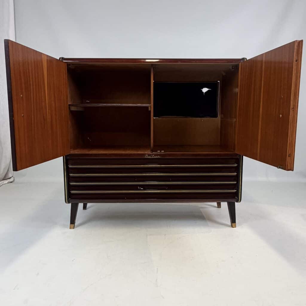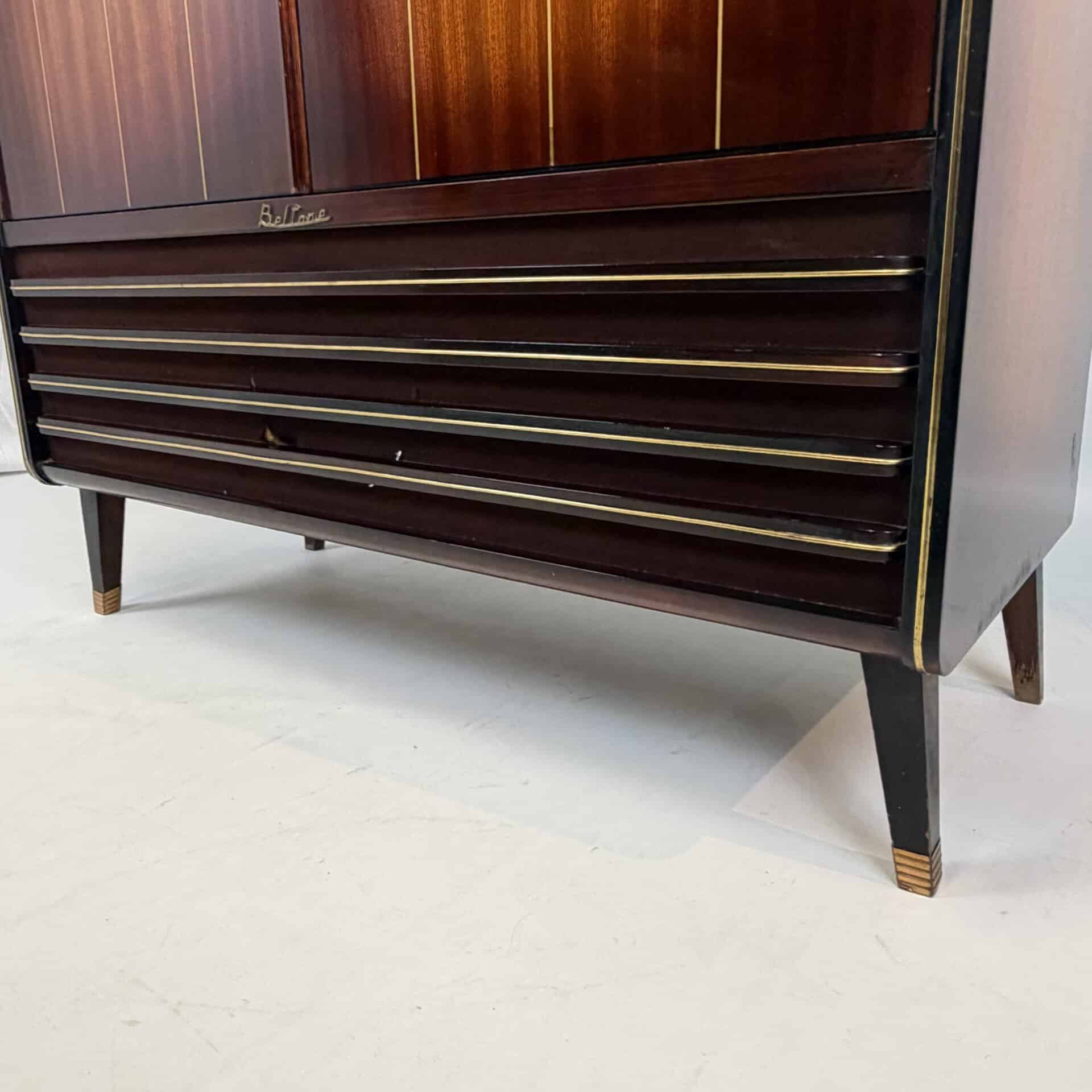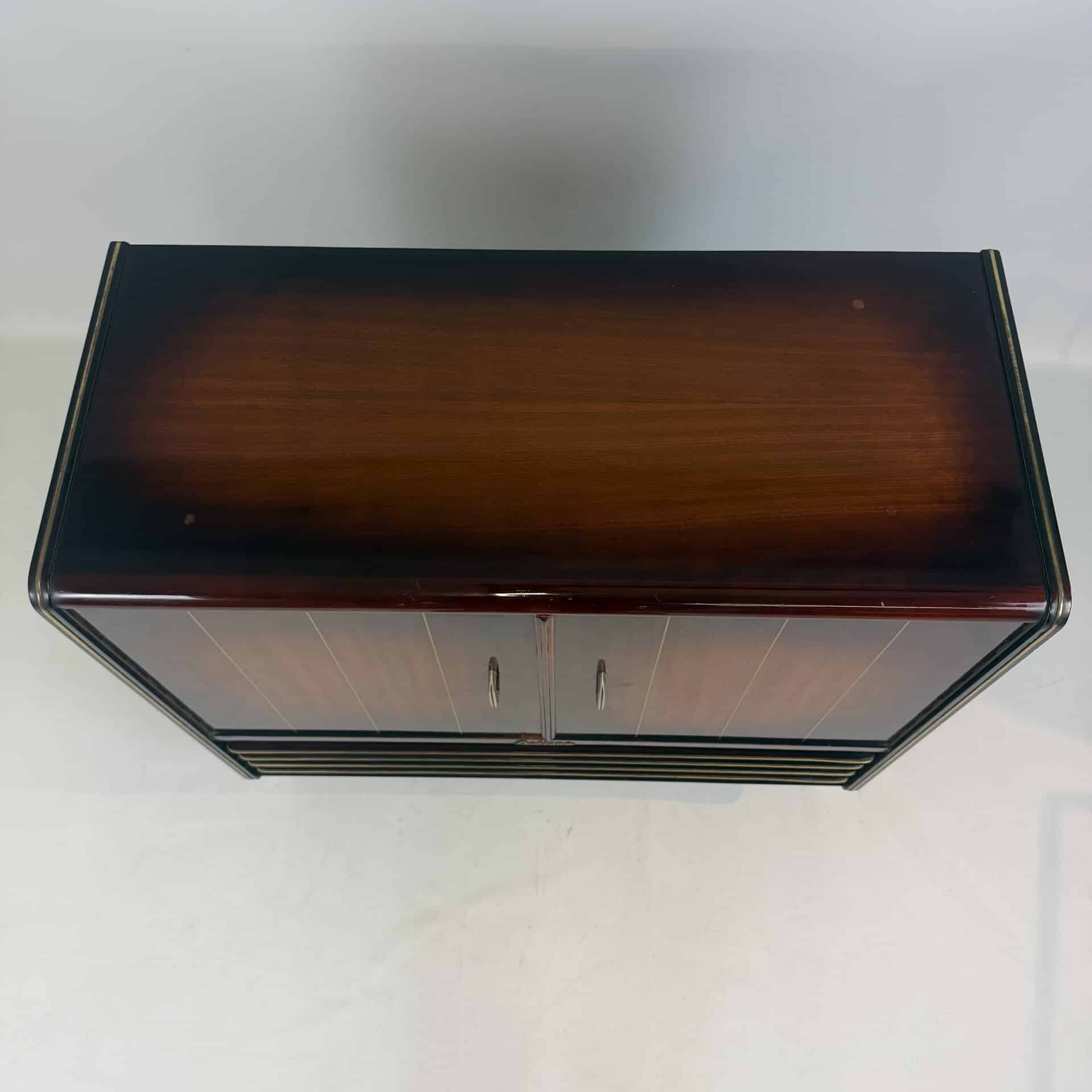 The cabinet is made of flamed, flat-sawn wood veneer with brass accents