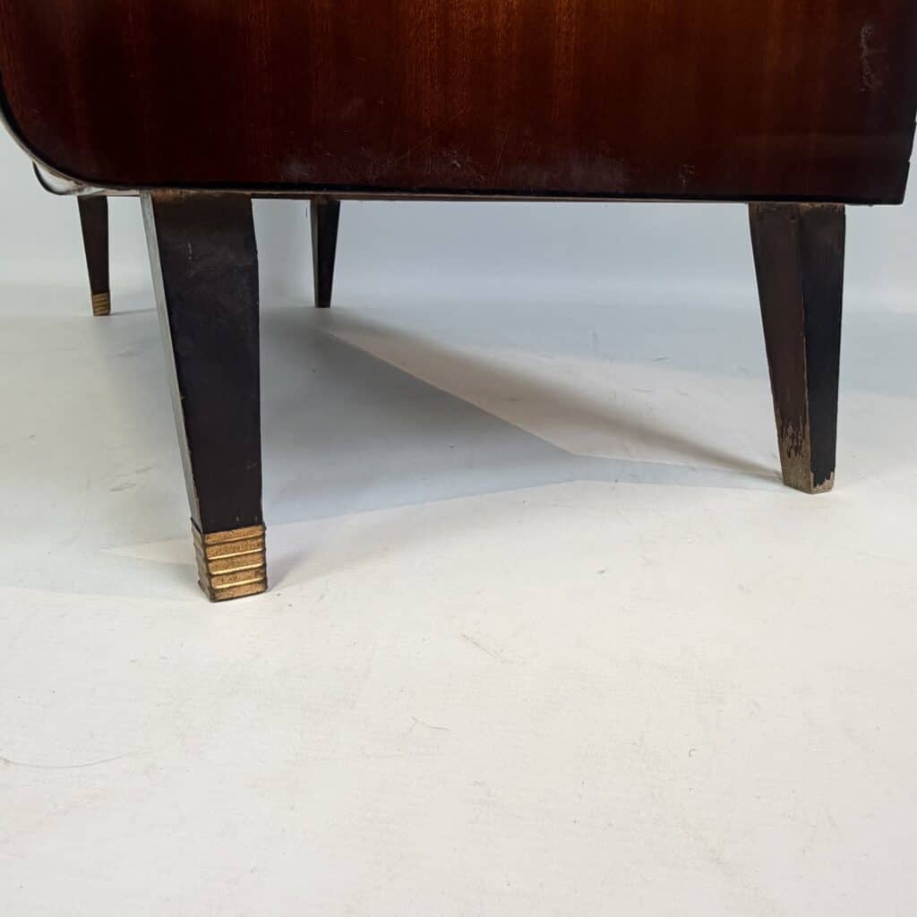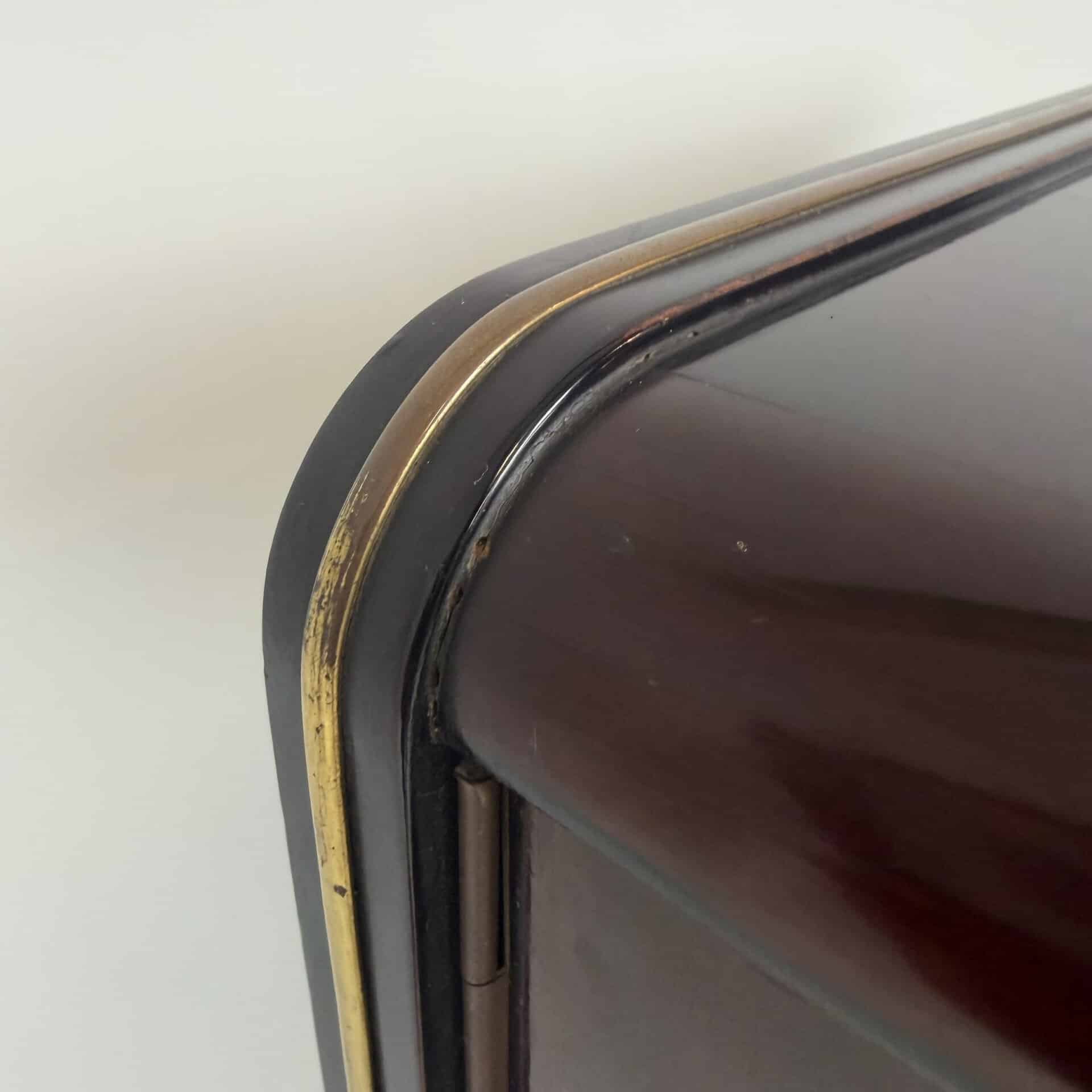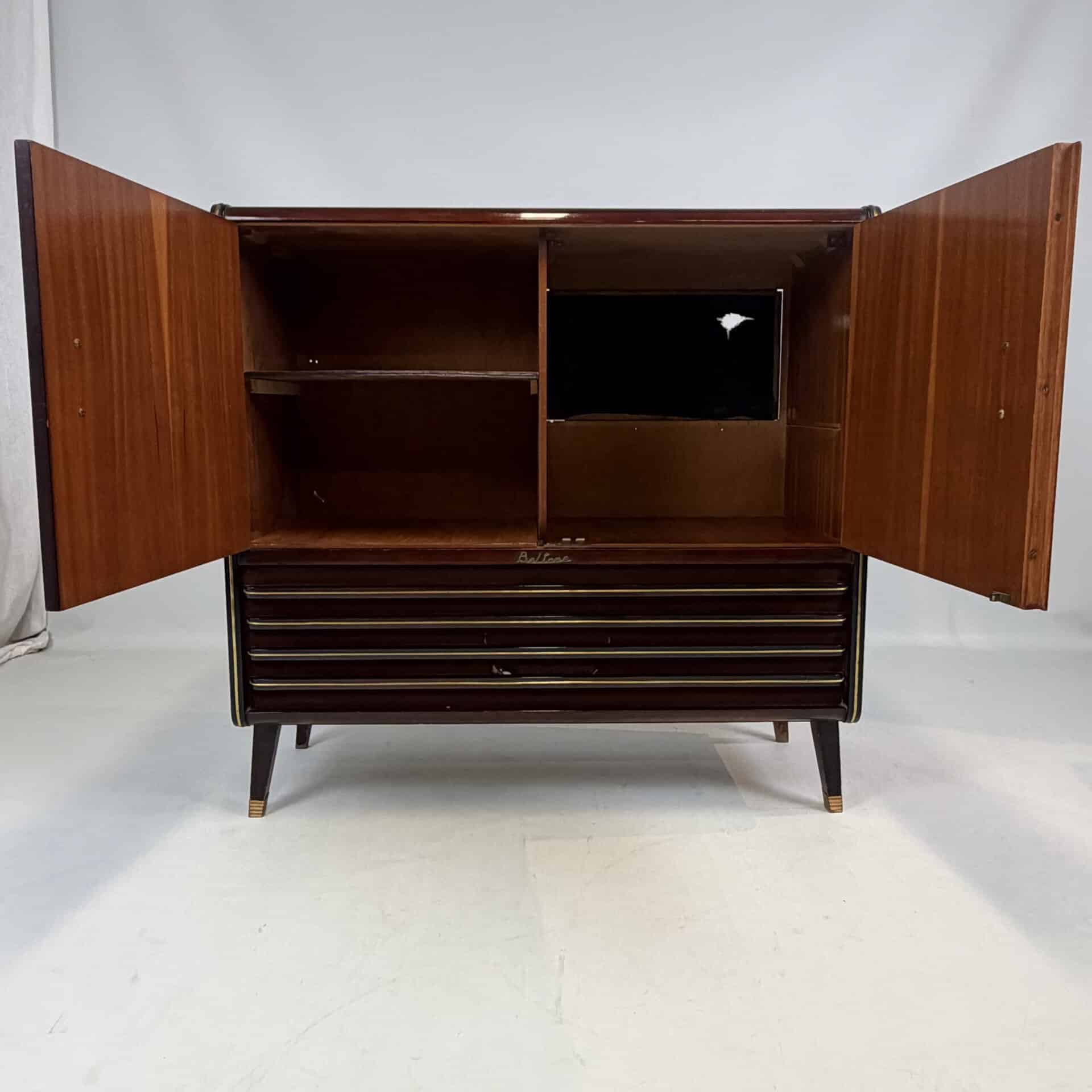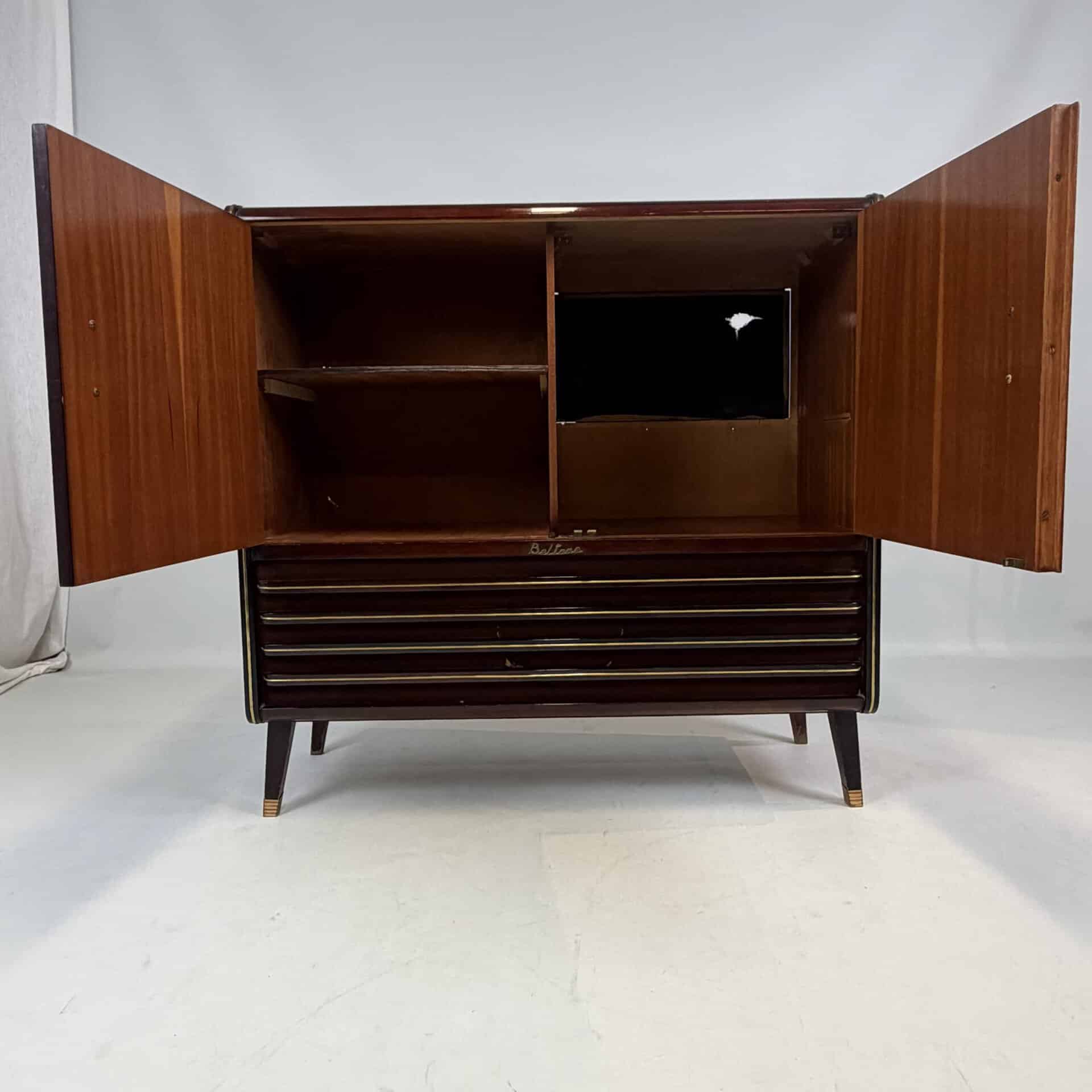 The cabinet is made of flamed, flat-sawn wood veneer with brass accents