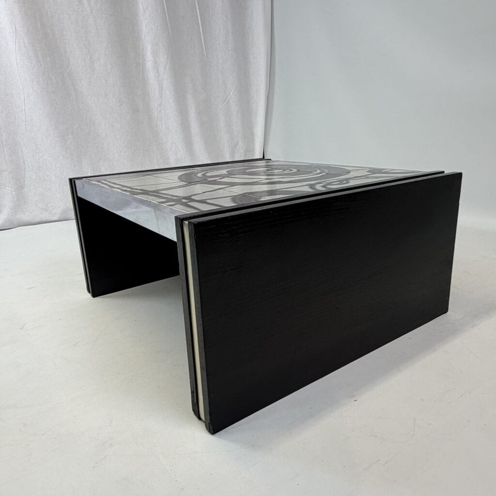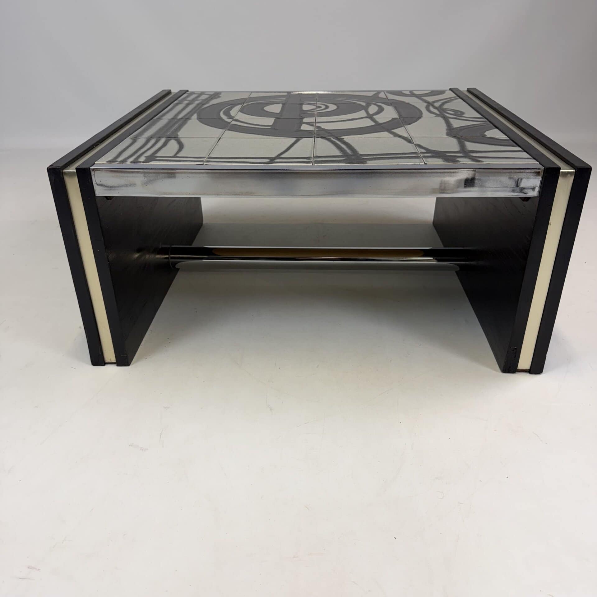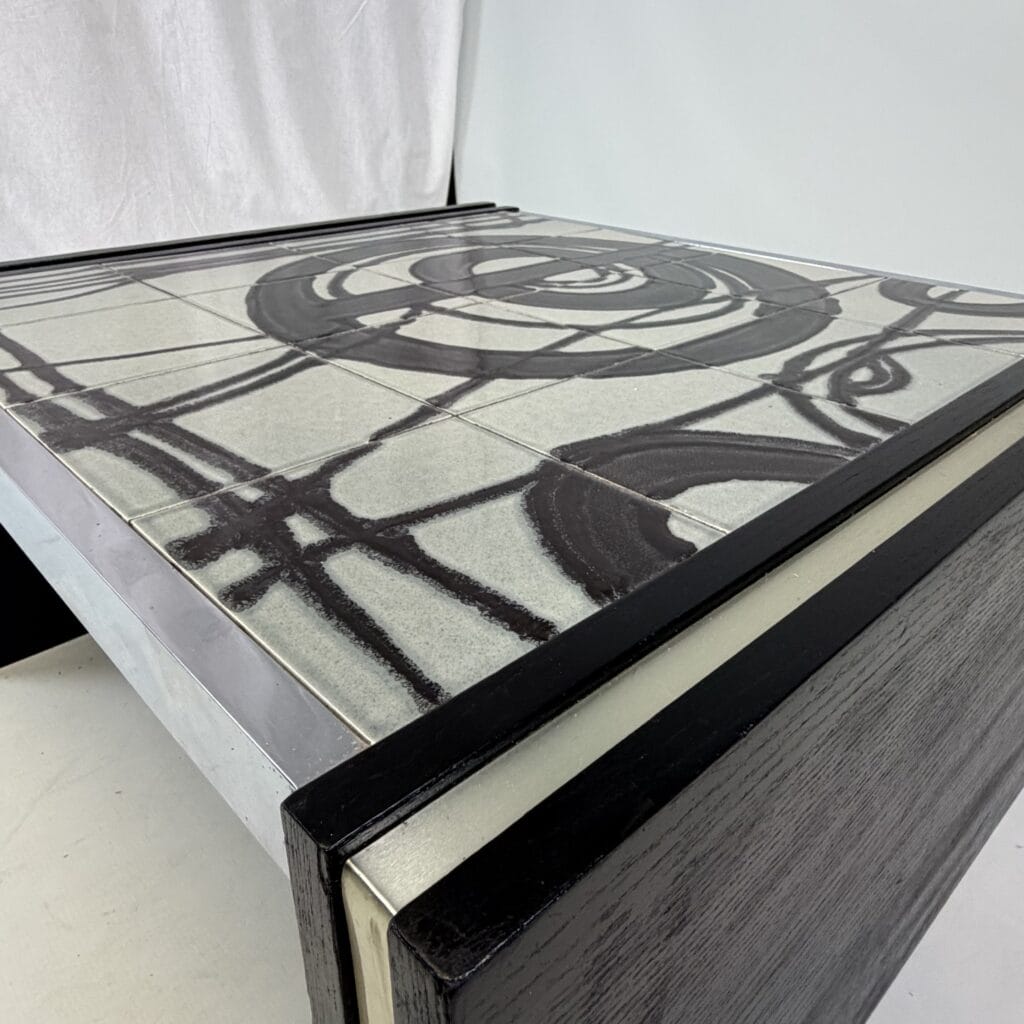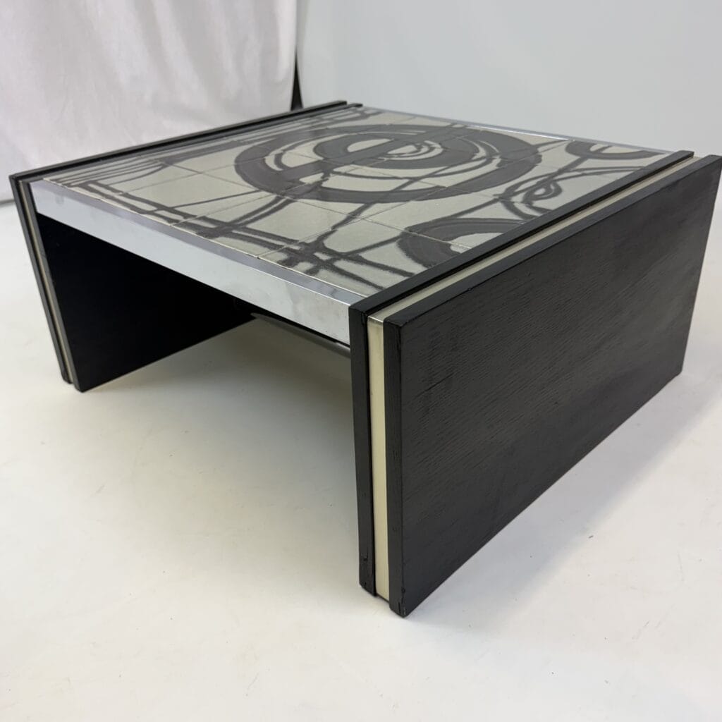 Coffee table with a sleek chrome frame and black wooden legs, complemented by a striking grey ceramic tile top