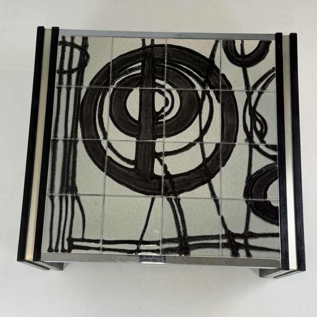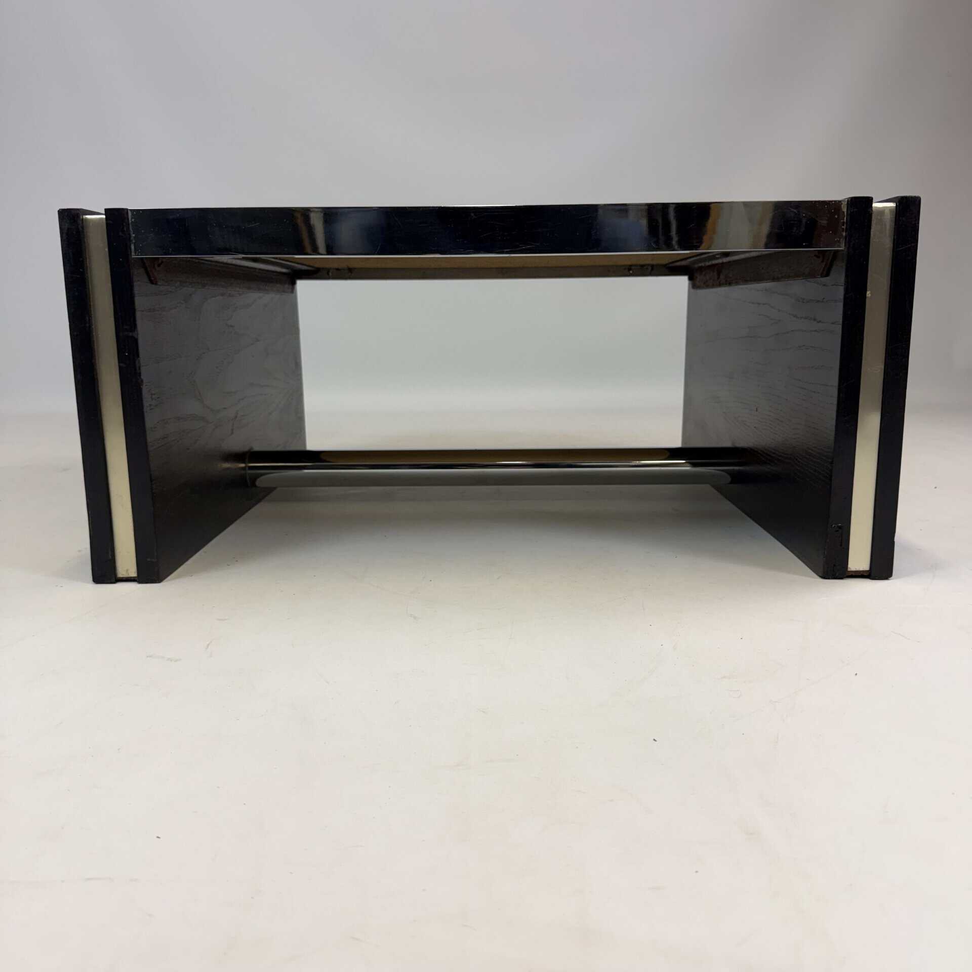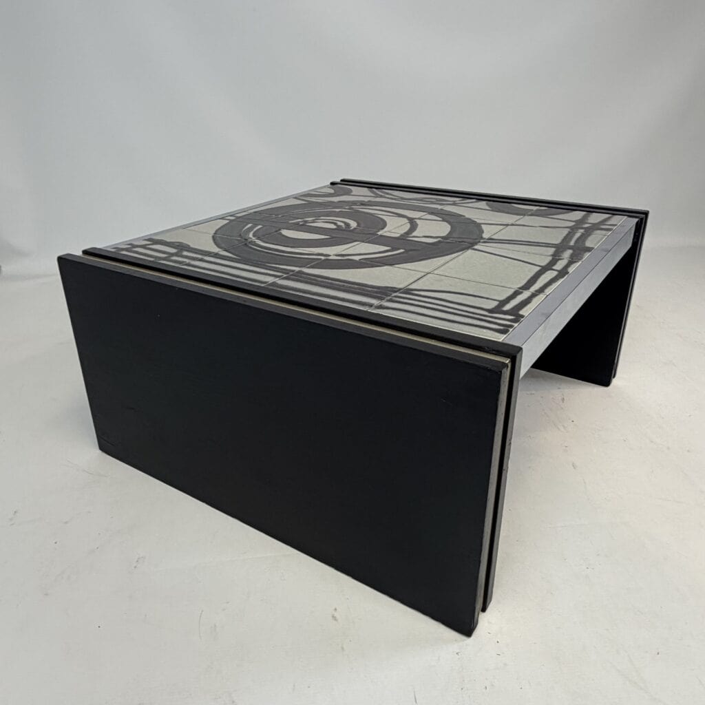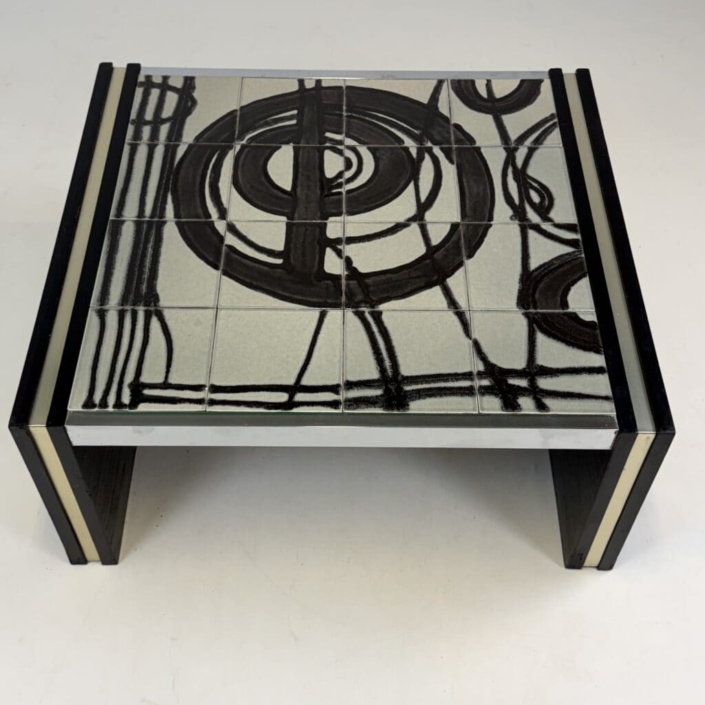 Coffee table with a sleek chrome frame and black wooden legs, complemented by a striking grey ceramic tile top