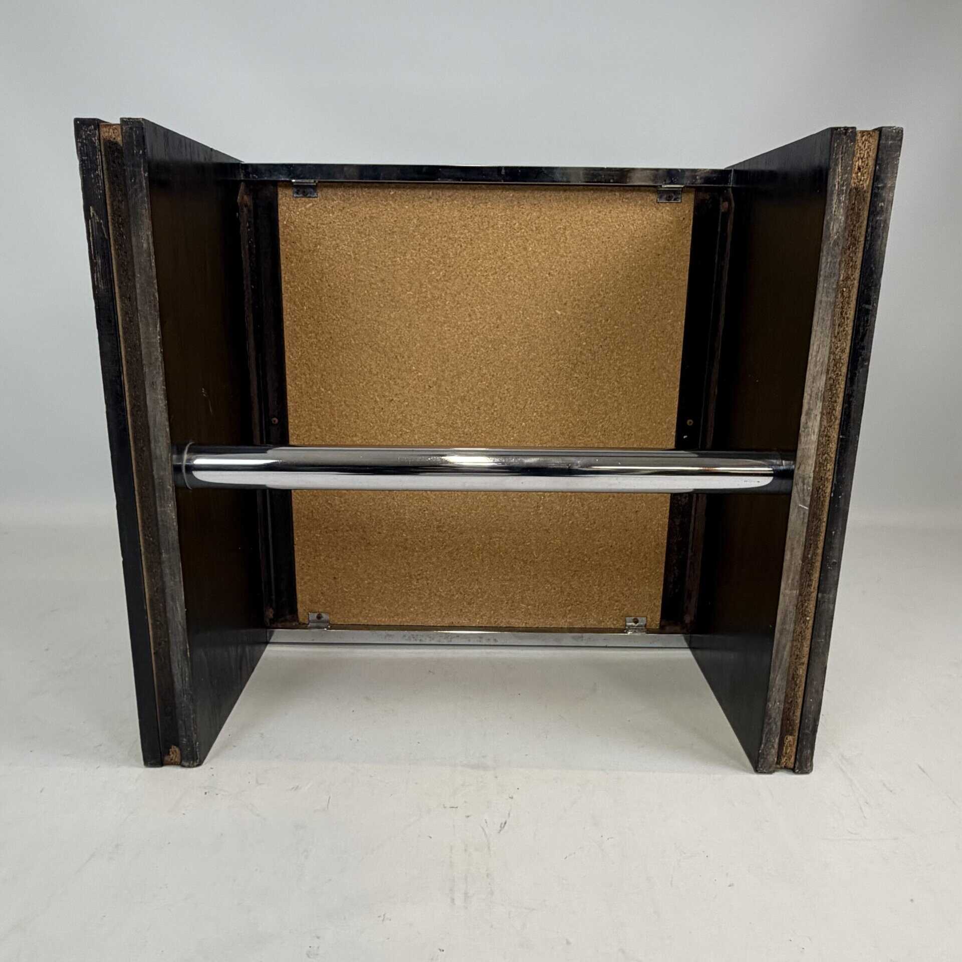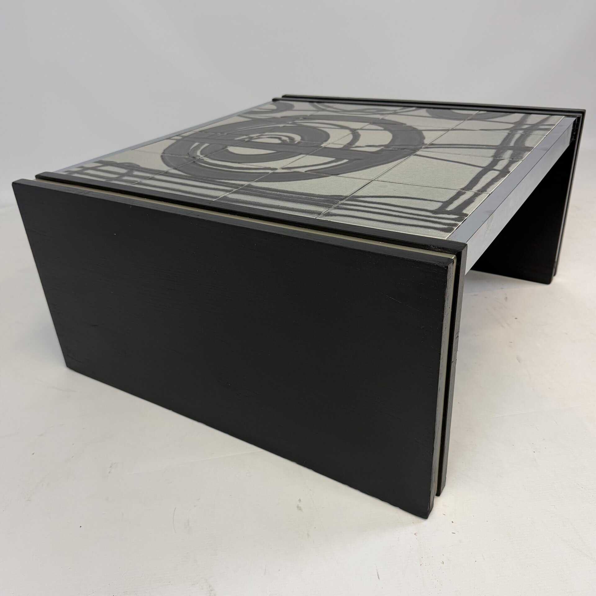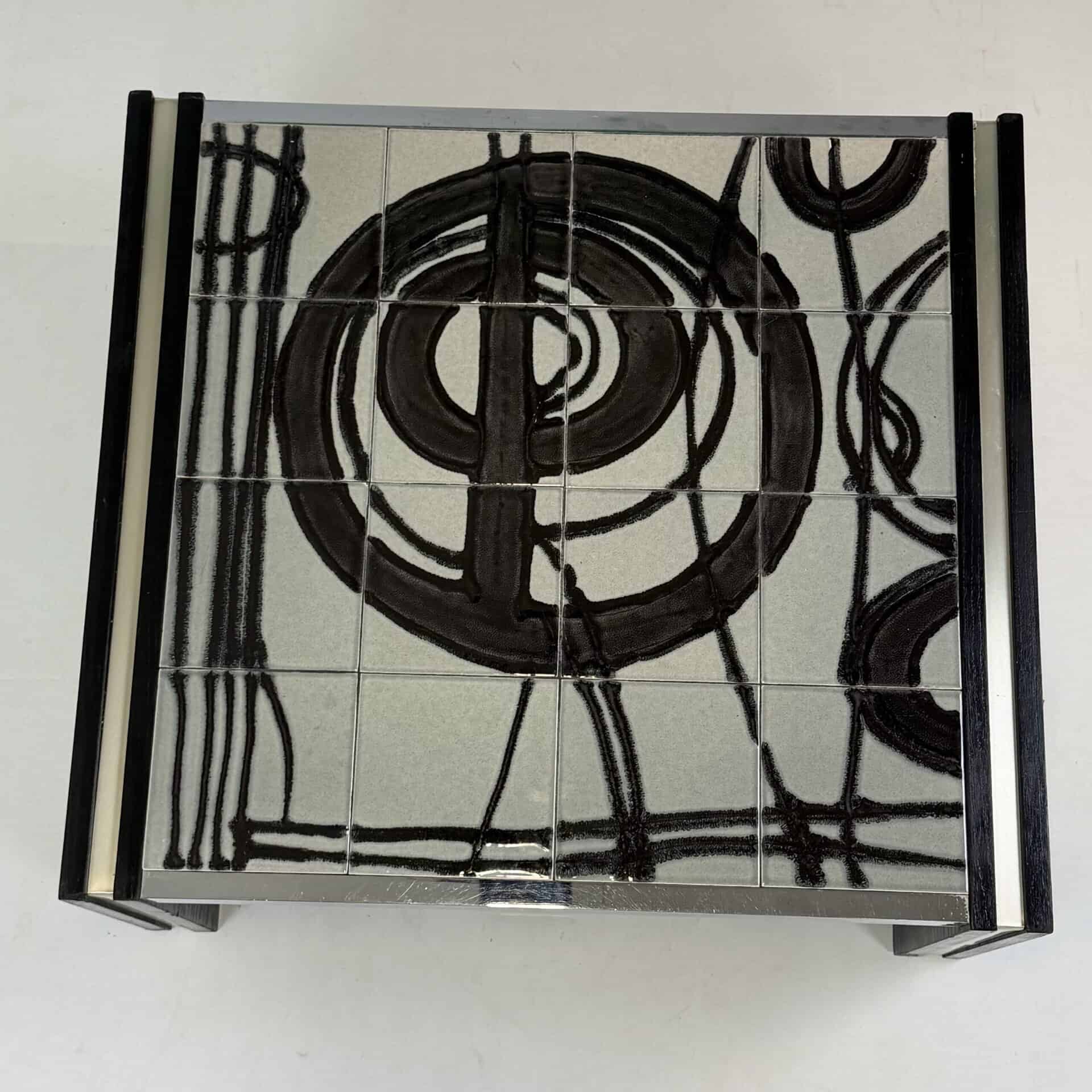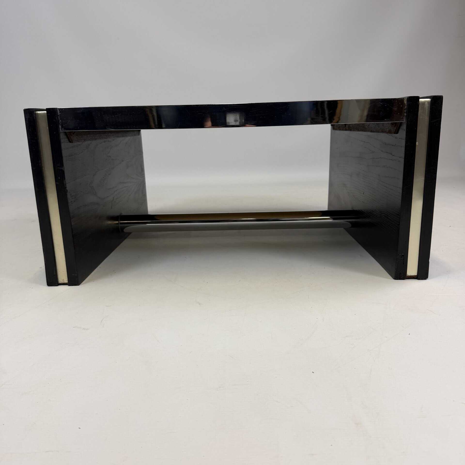 Coffee table with a sleek chrome frame and black wooden legs, complemented by a striking grey ceramic tile top