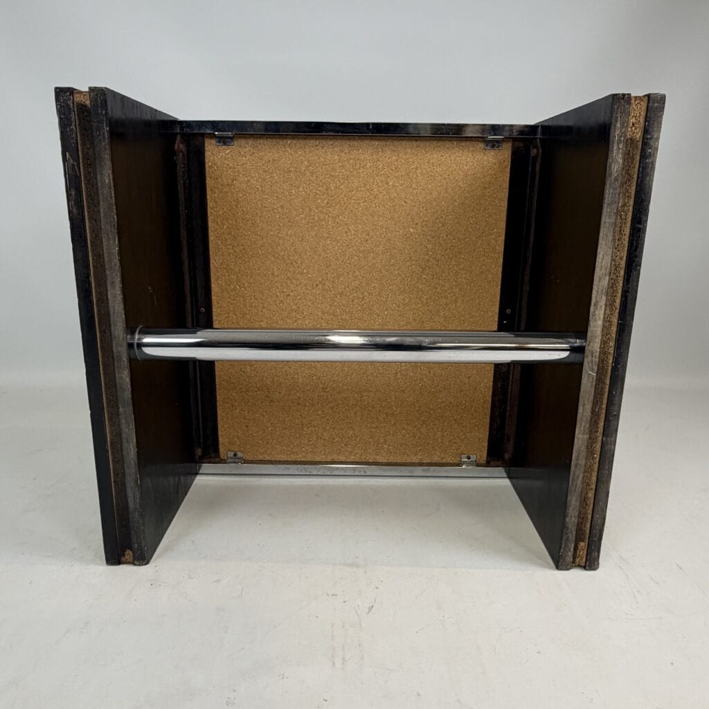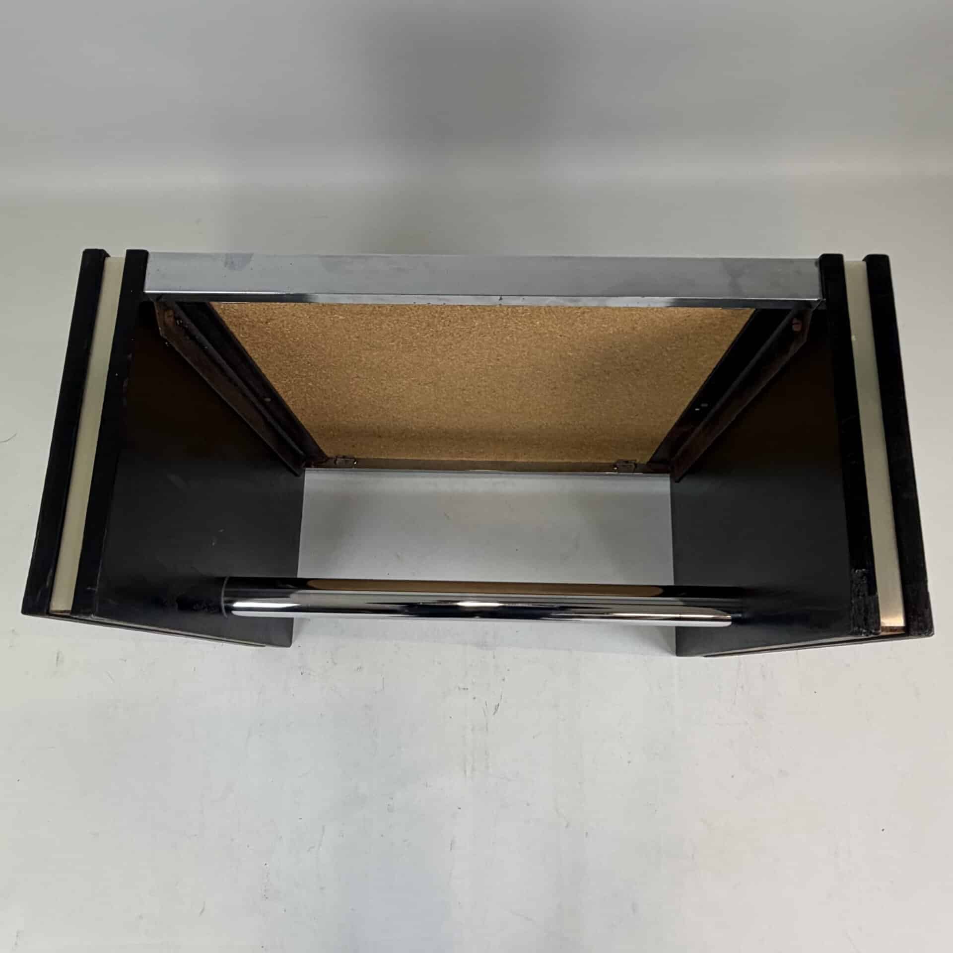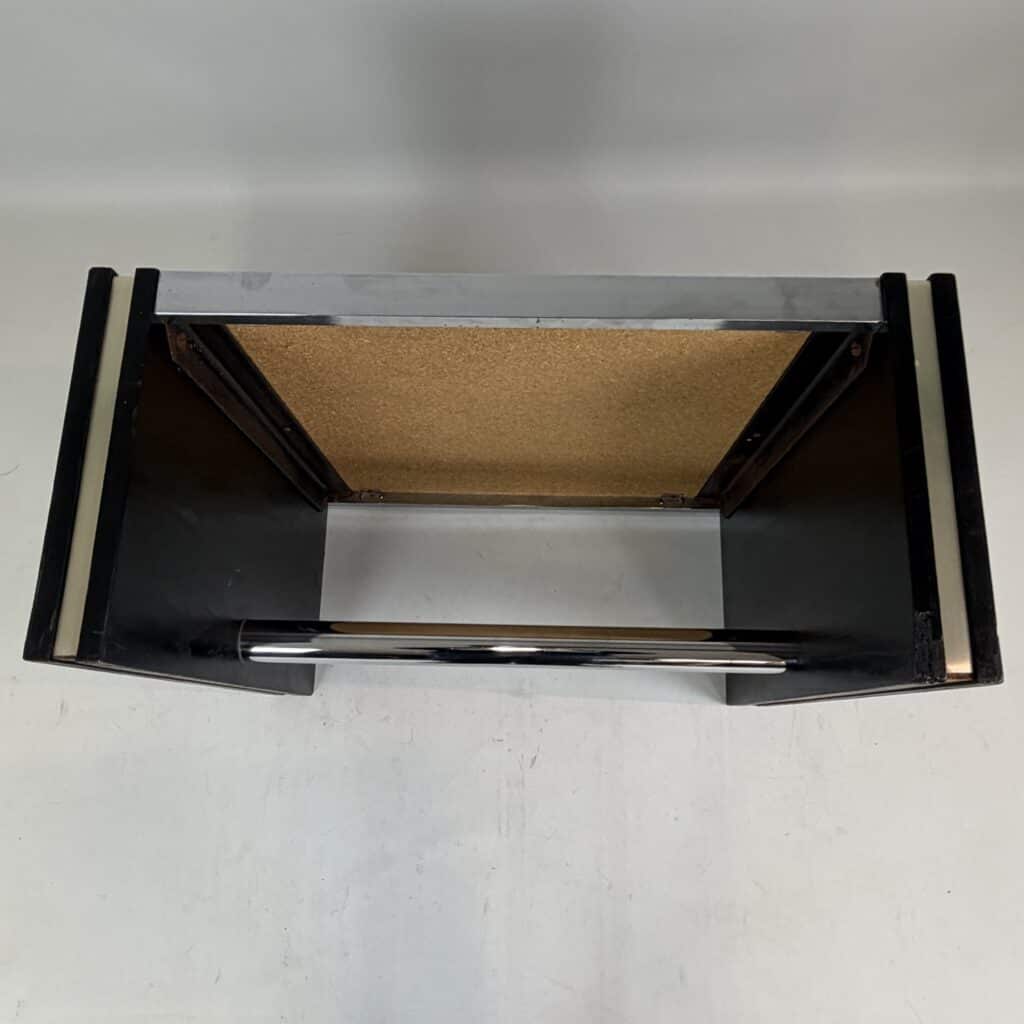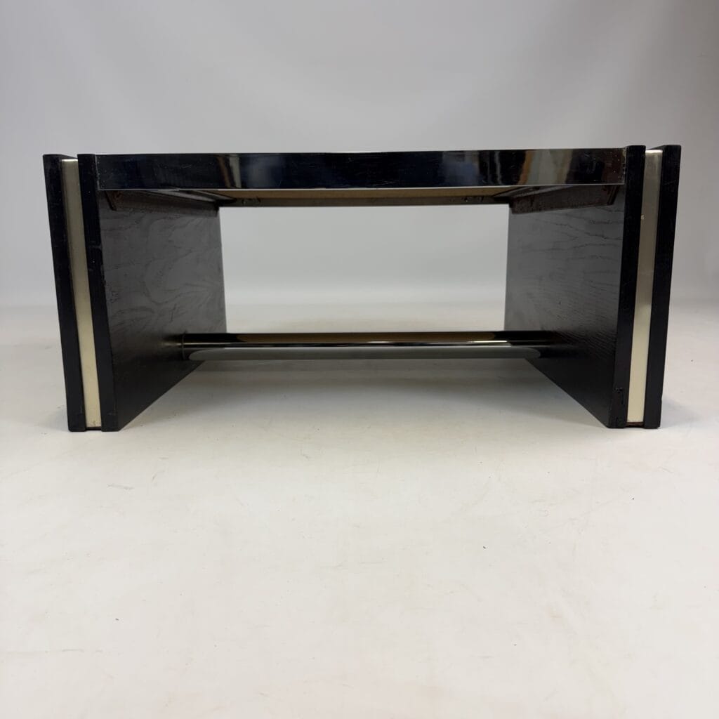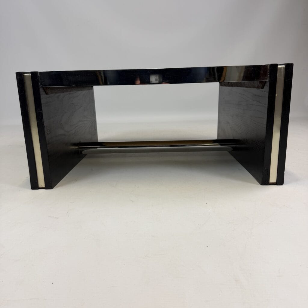 Vertical chrome-plated steel strips are inlaid into the outer edges of the black legs, creating a high-contrast, “sandwich” effect