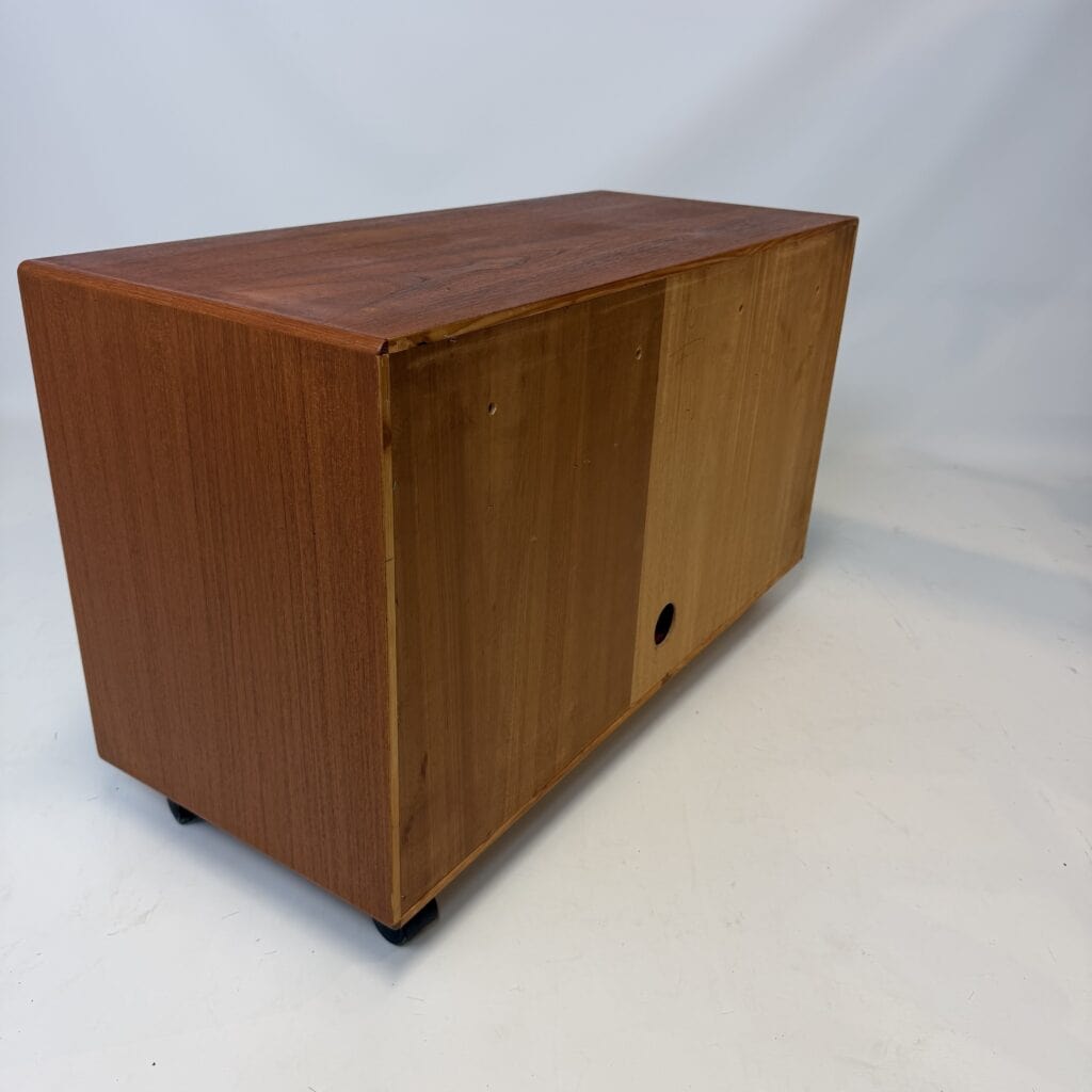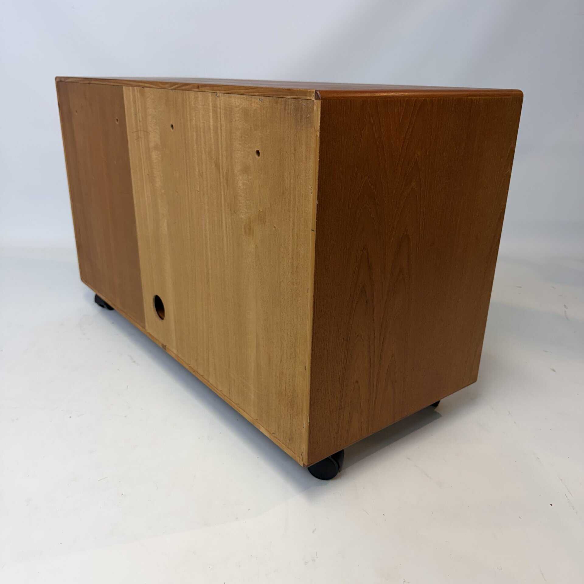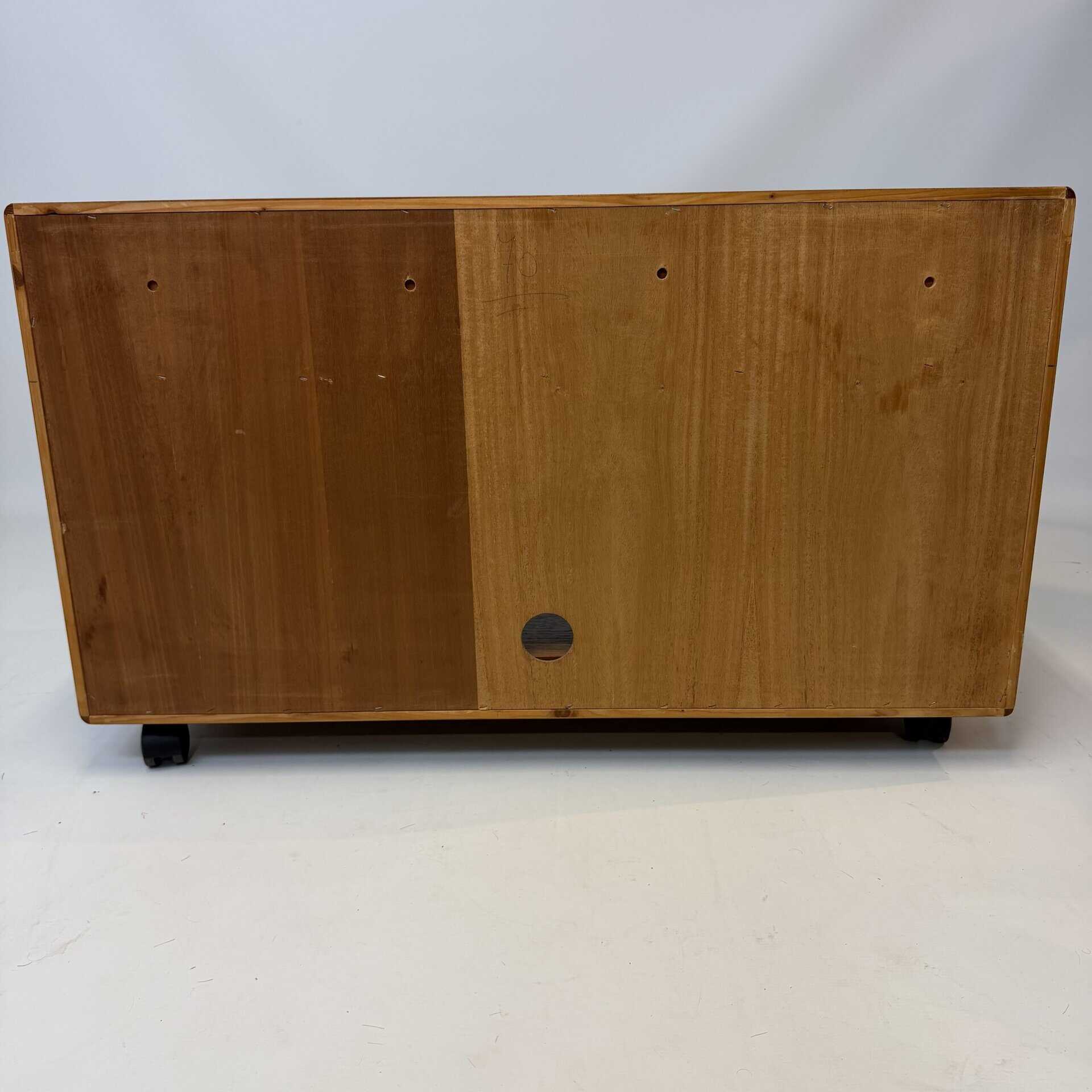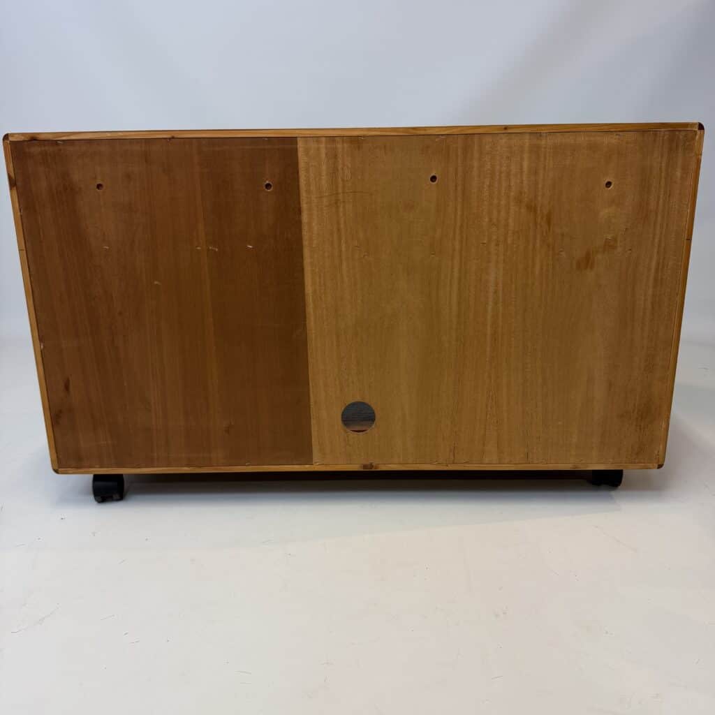 The cabinet sits on casters, another feature common in mid-century Hi-Fi furniture so users could pull the unit out to access wiring