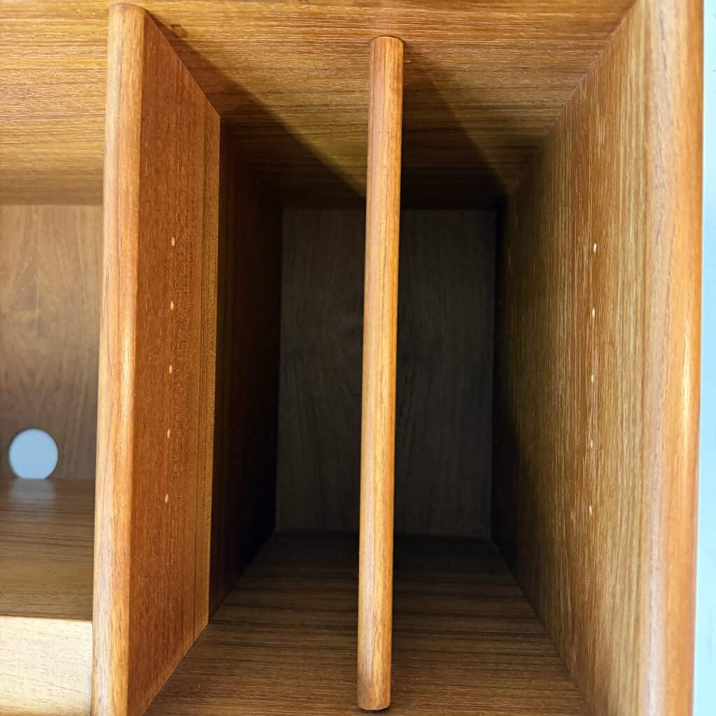 Vinyl record storage in the vertical slots on the right