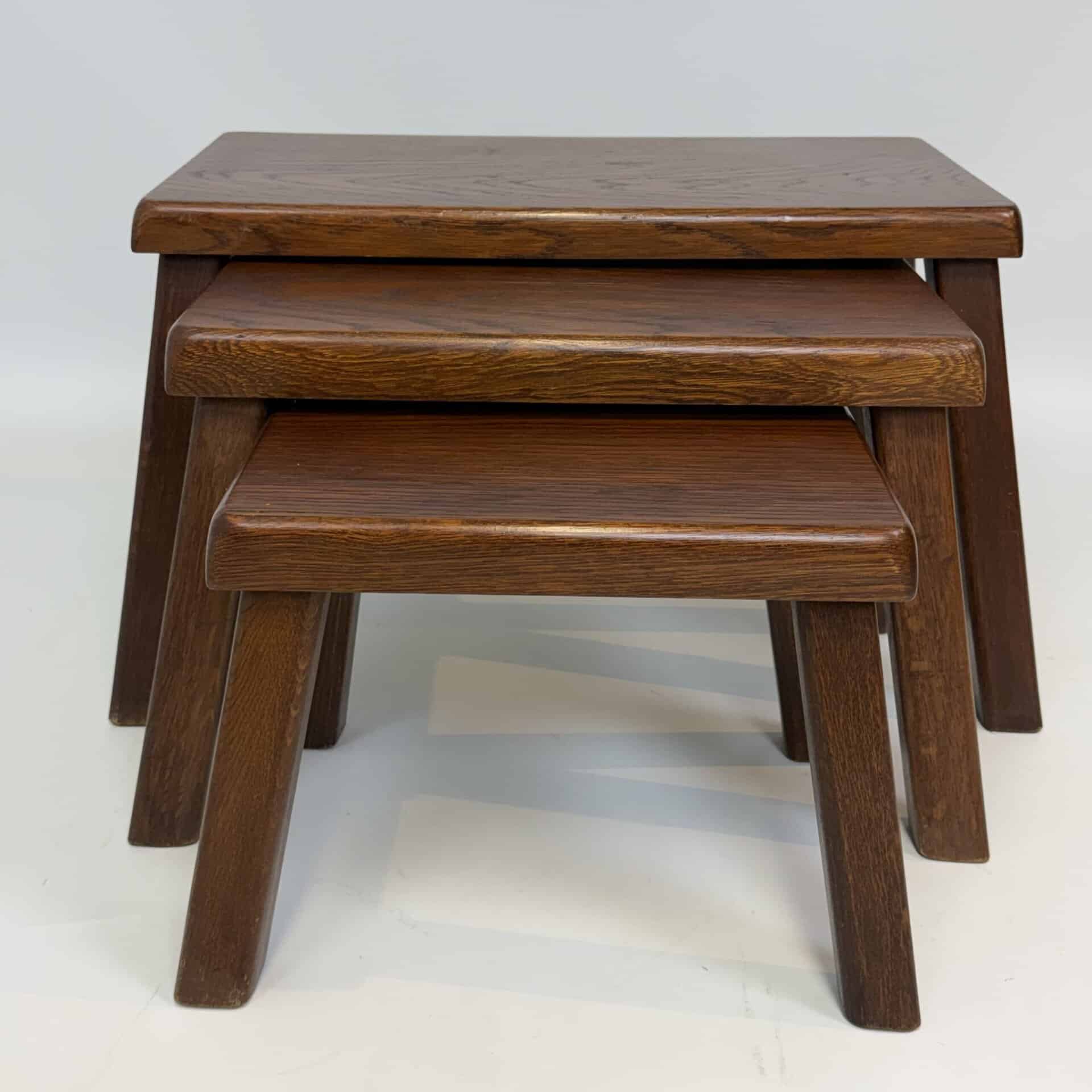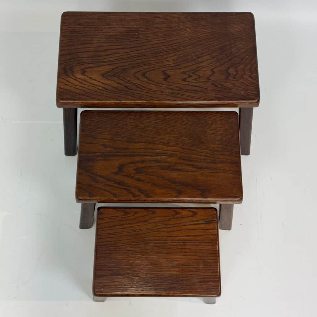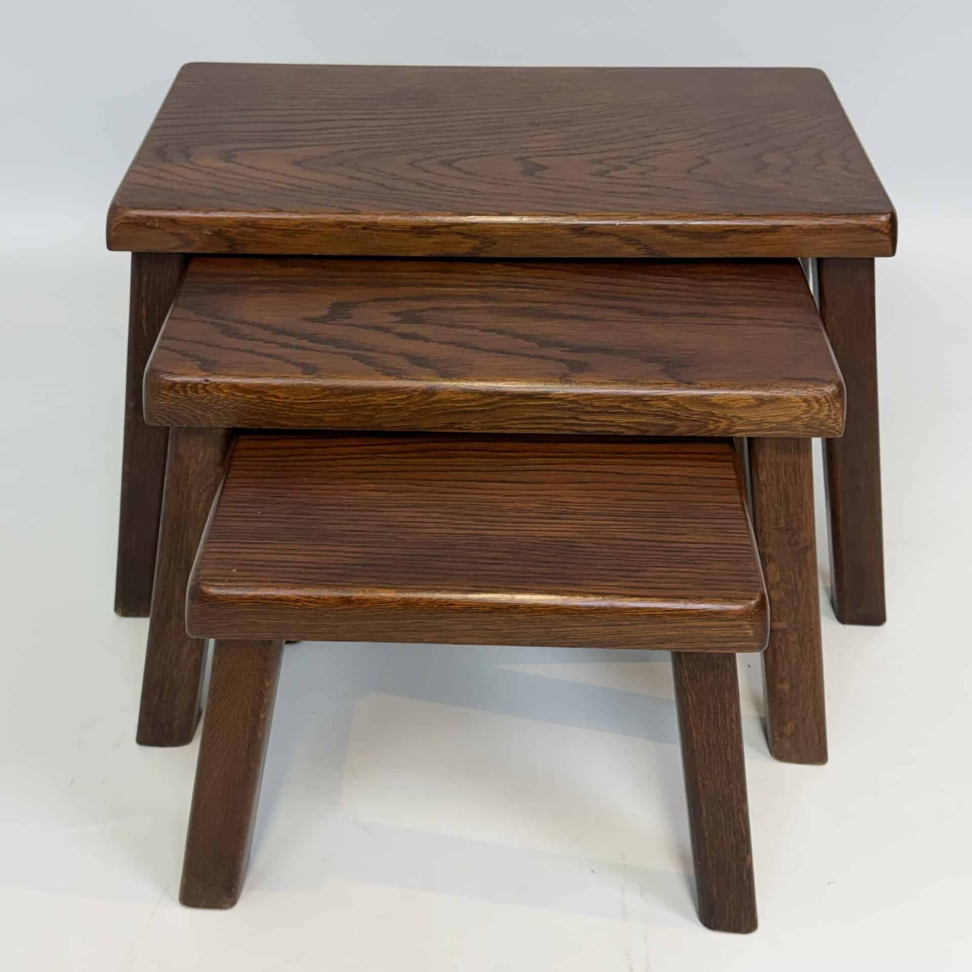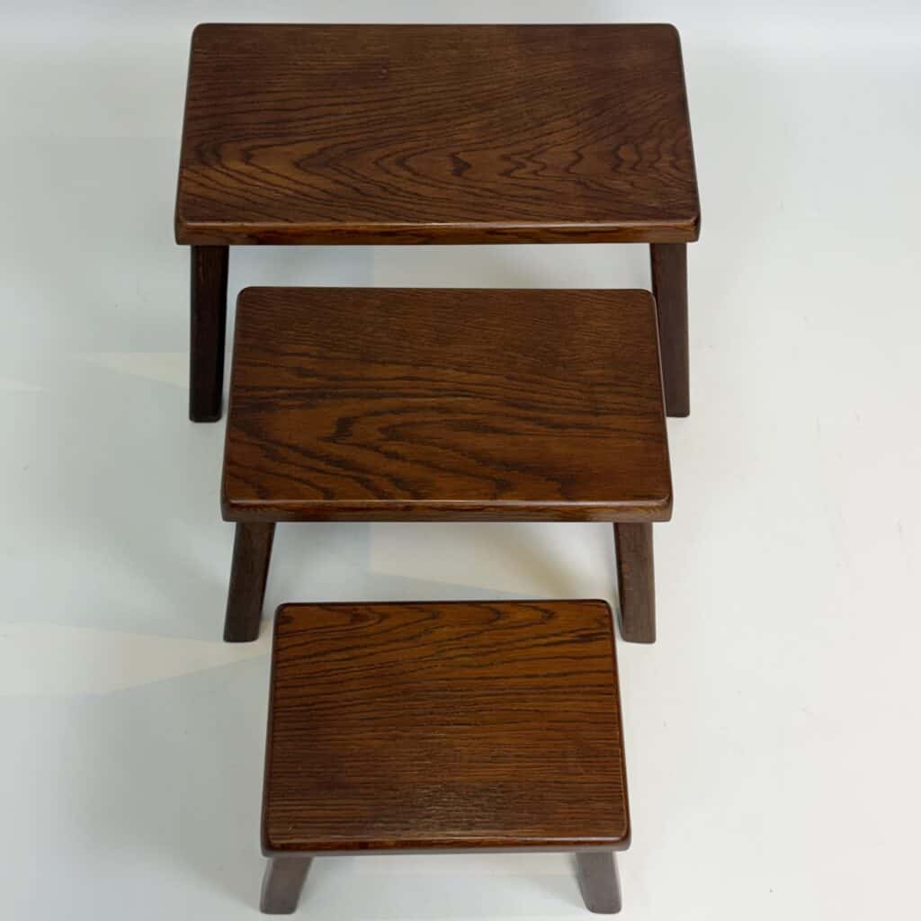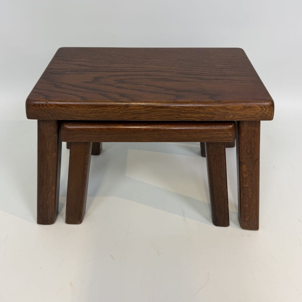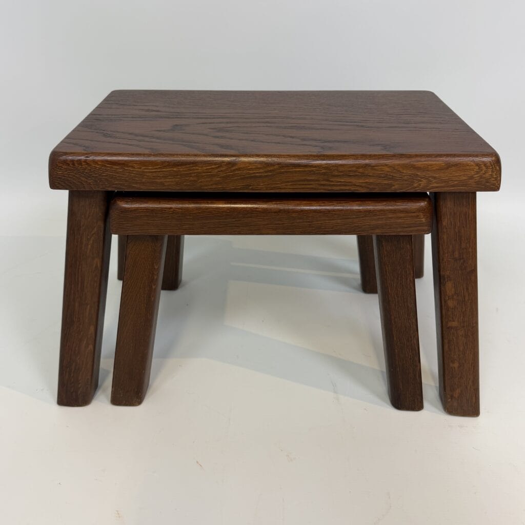 These oak side tables with rectangular tops rest on sturdy, slightly outward-sloping legs, creating a stable and timeless, warm, and authentic look