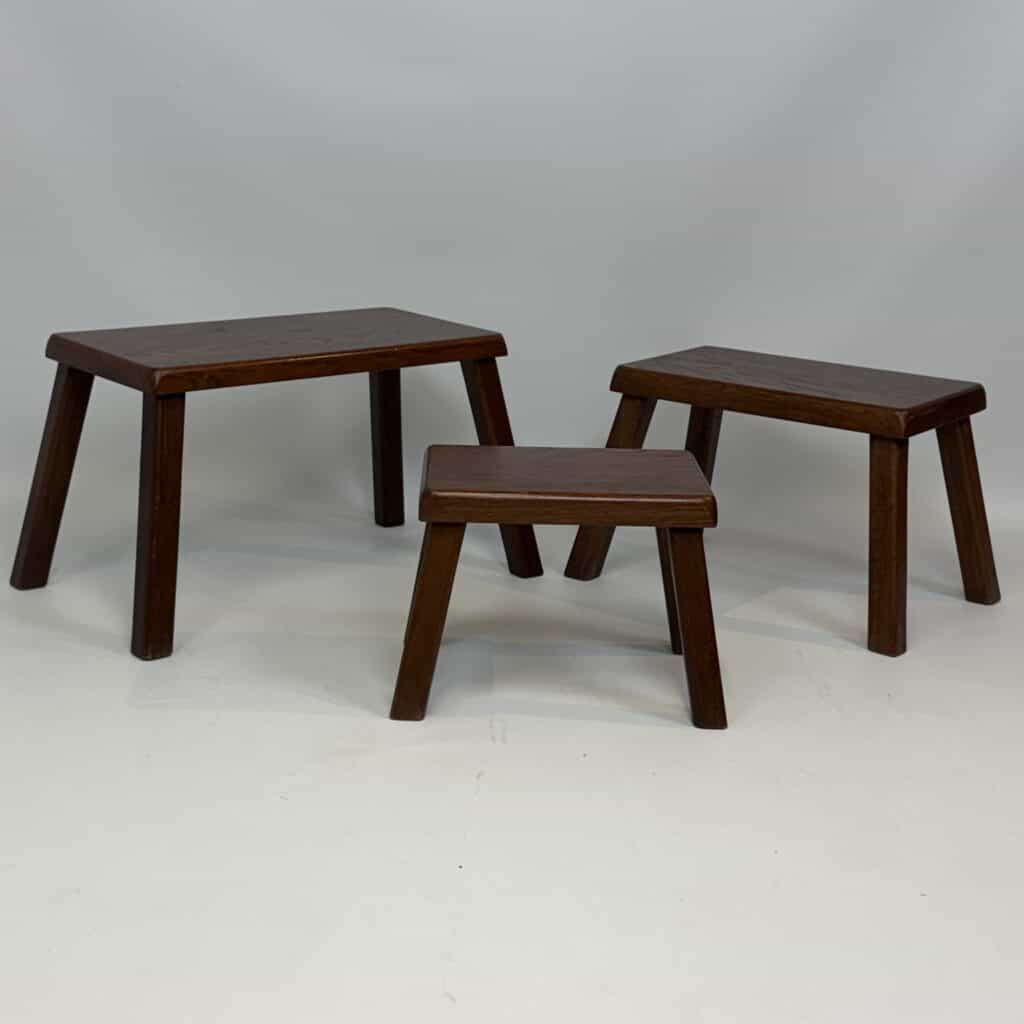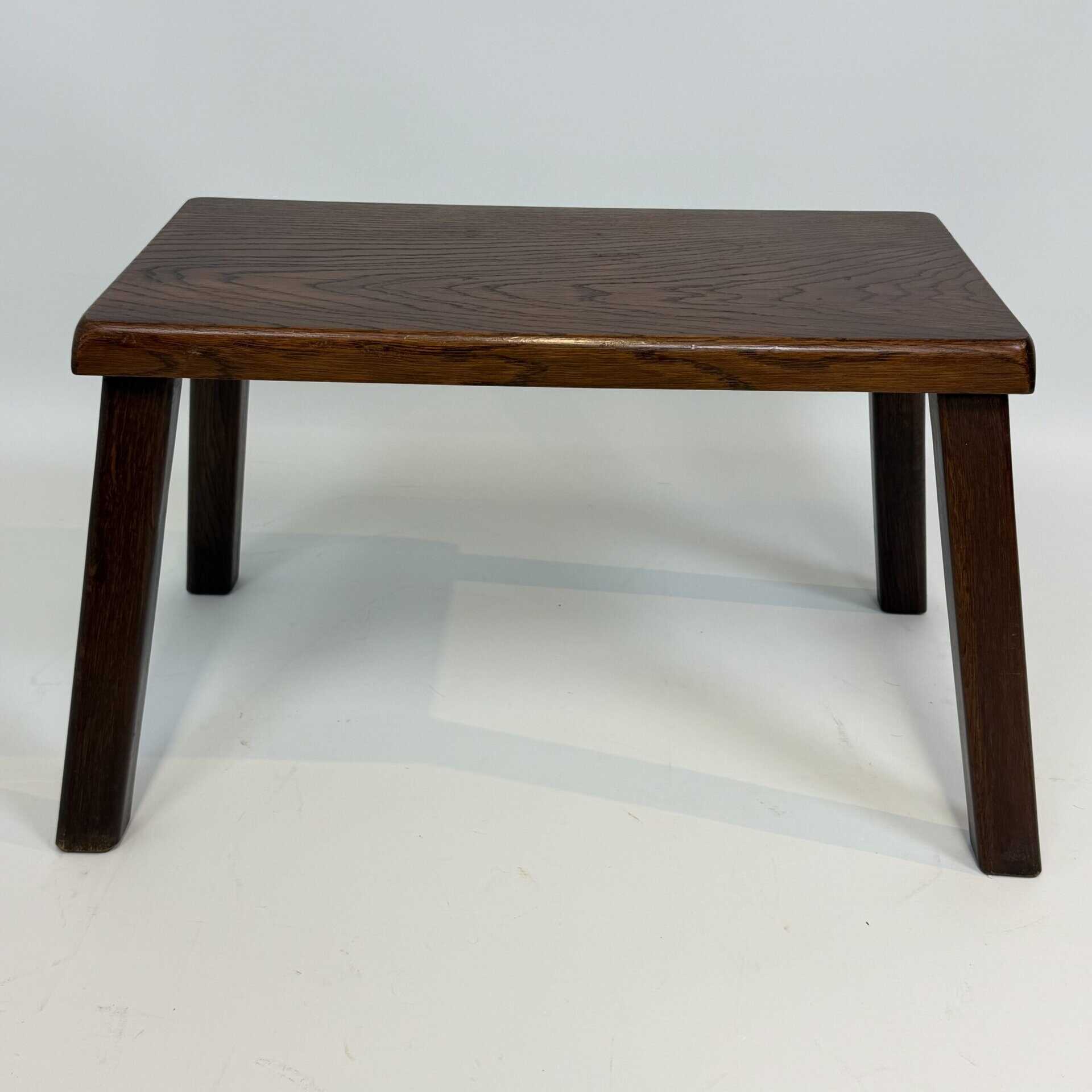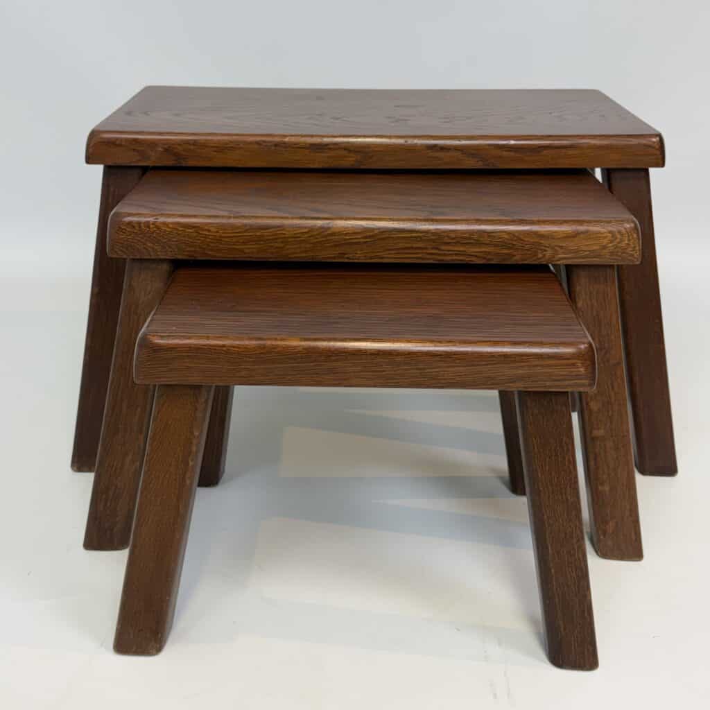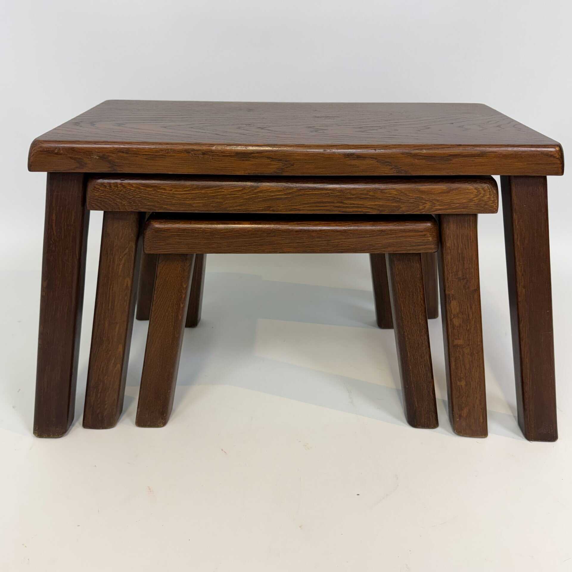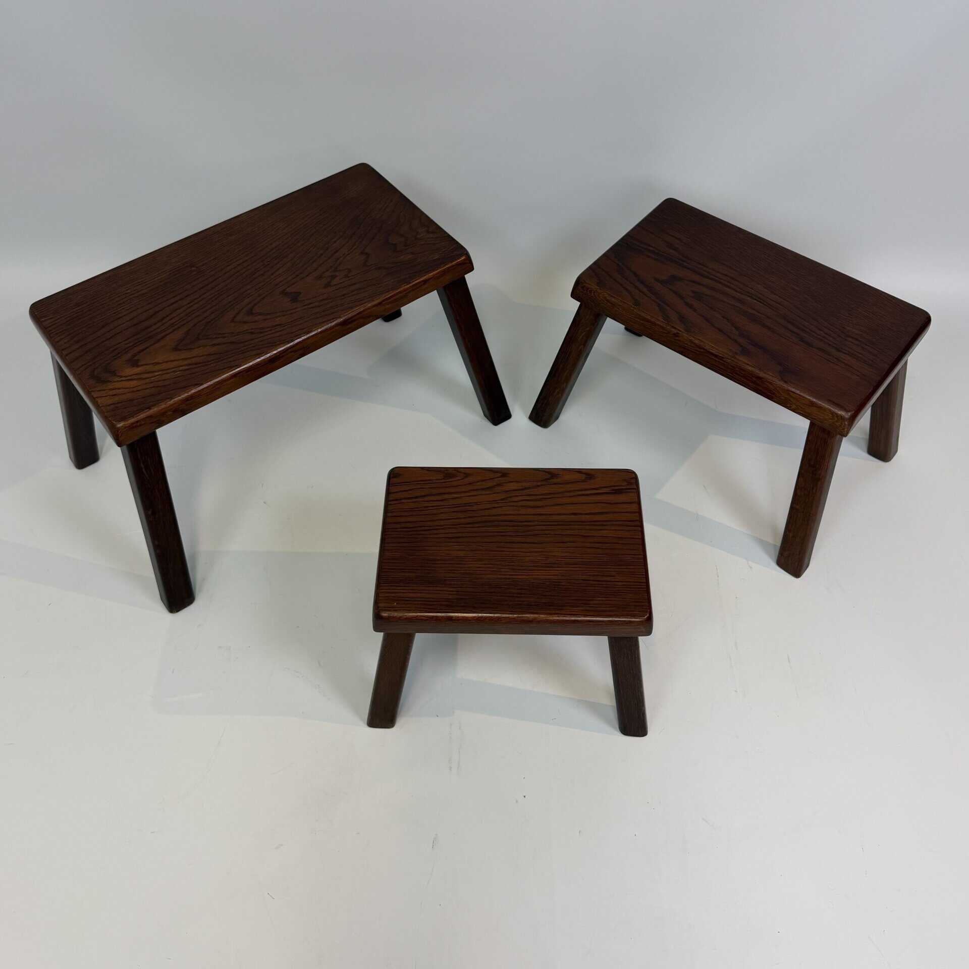 These oak side tables with rectangular tops rest on sturdy, slightly outward-sloping legs, creating a stable and timeless, warm, and authentic look