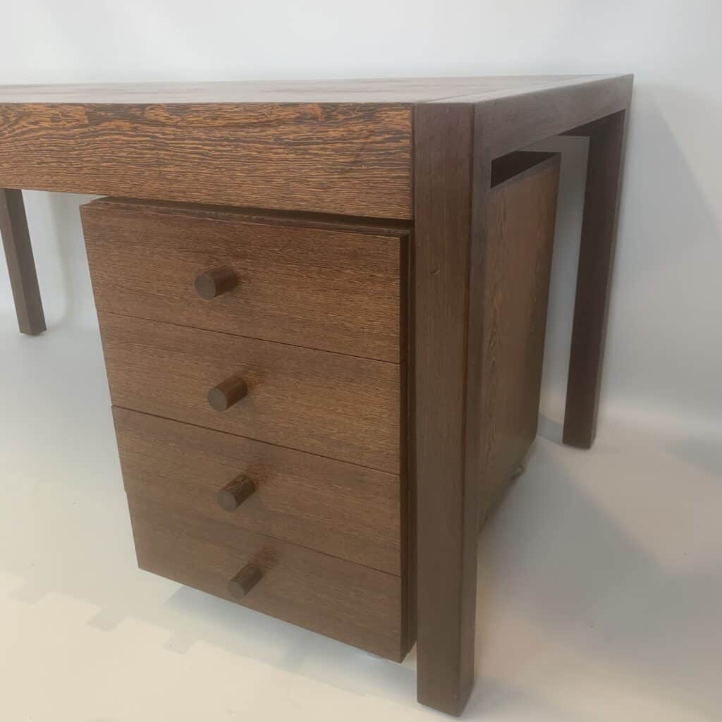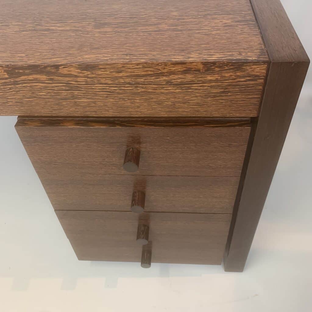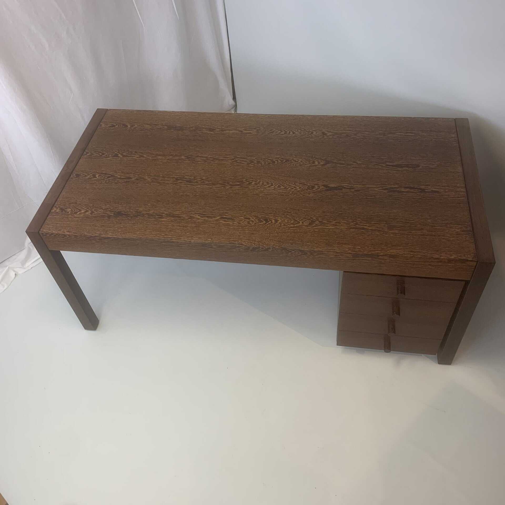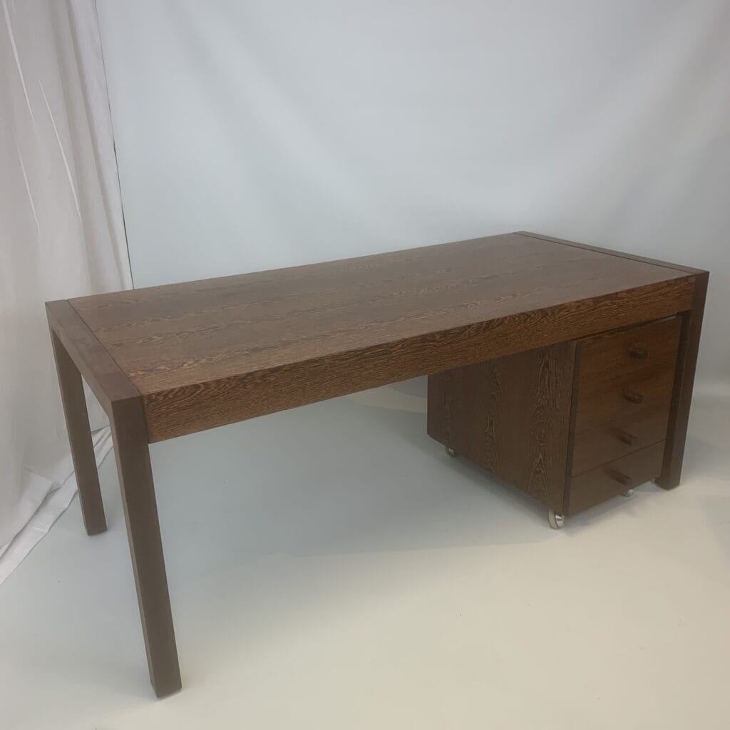 Desk with modernist lines and veneered top in quarter-sawn oak (also called tiger oak)