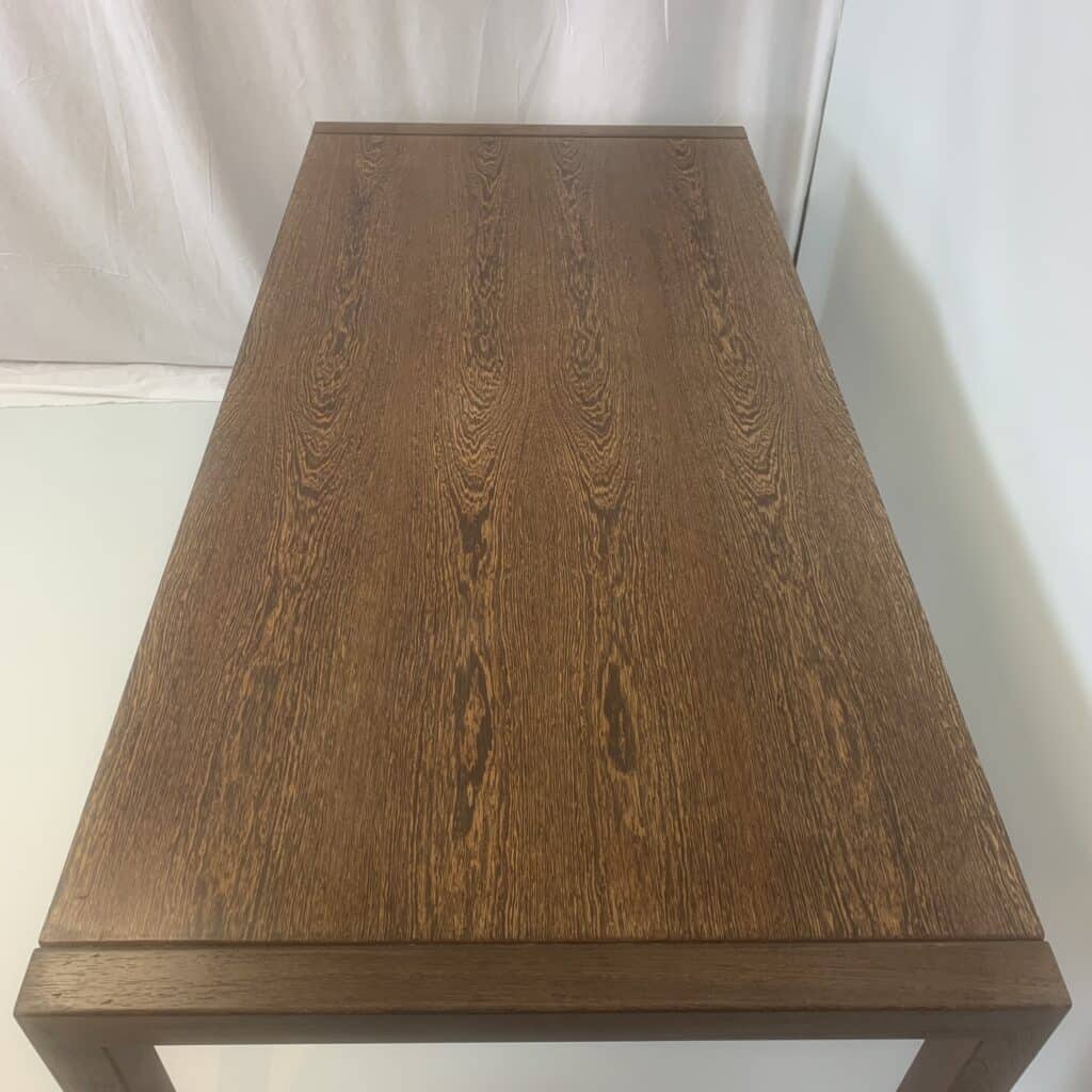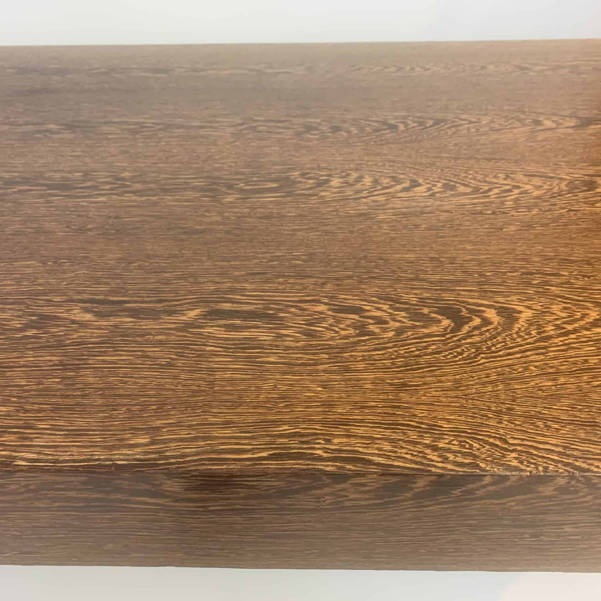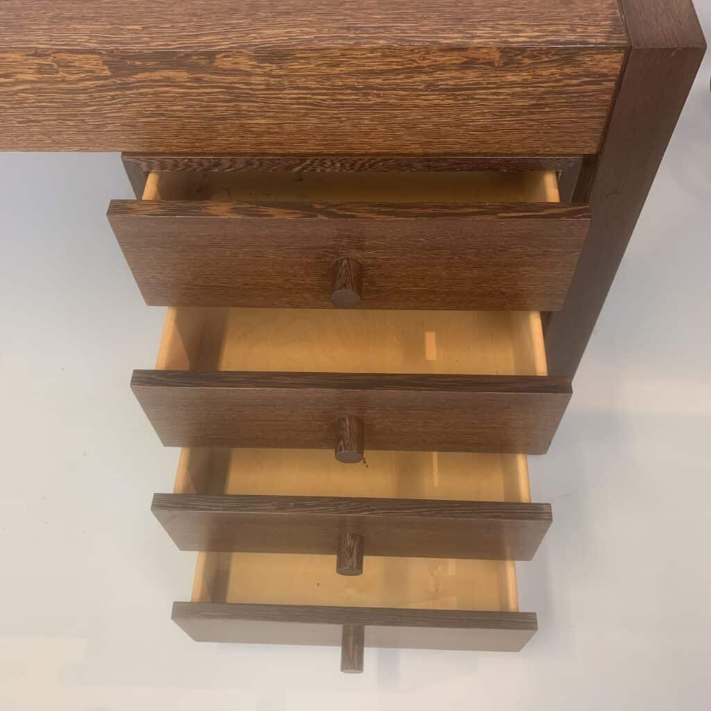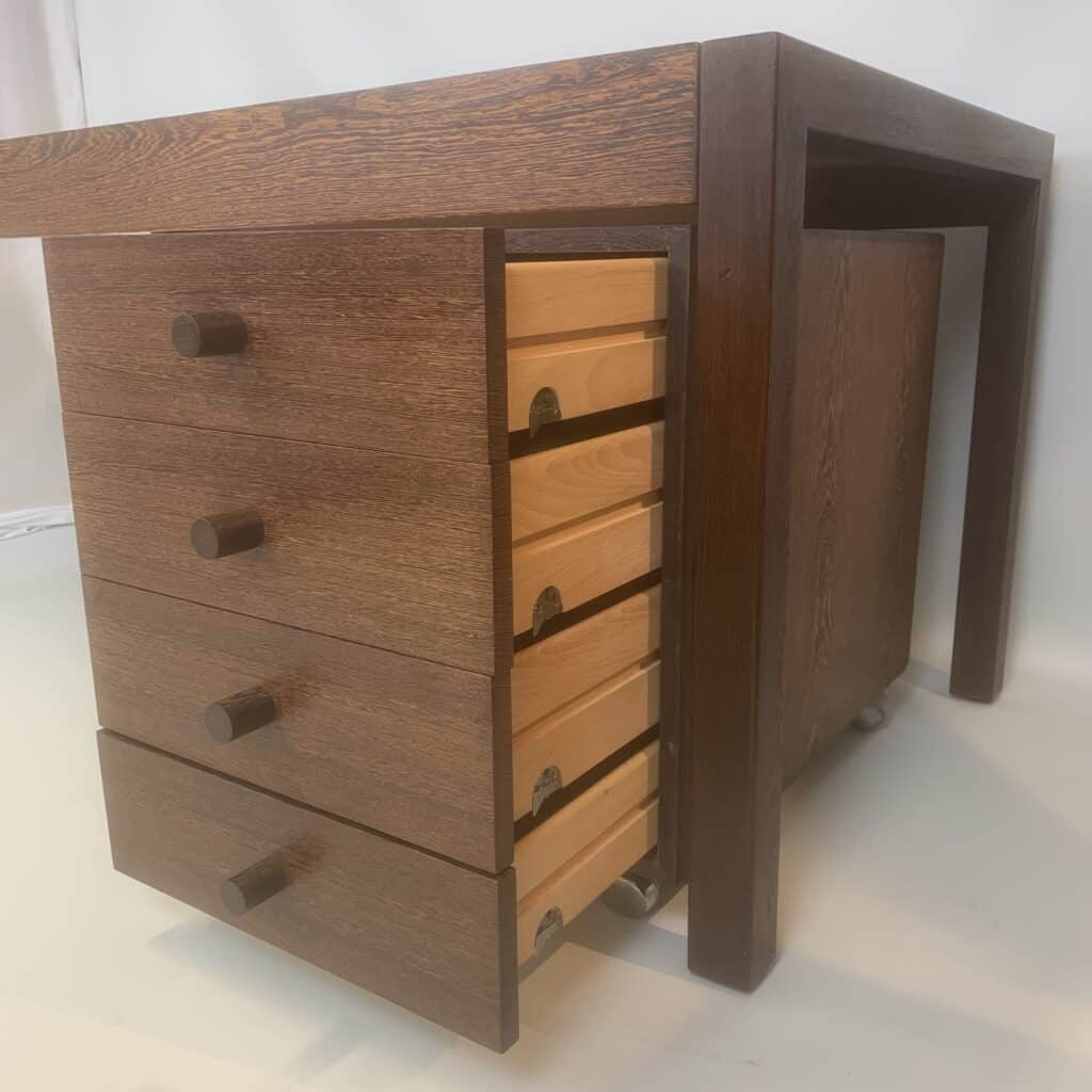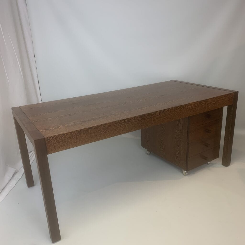 Desk with modernist lines and veneered top in quarter-sawn oak (also called tiger oak)