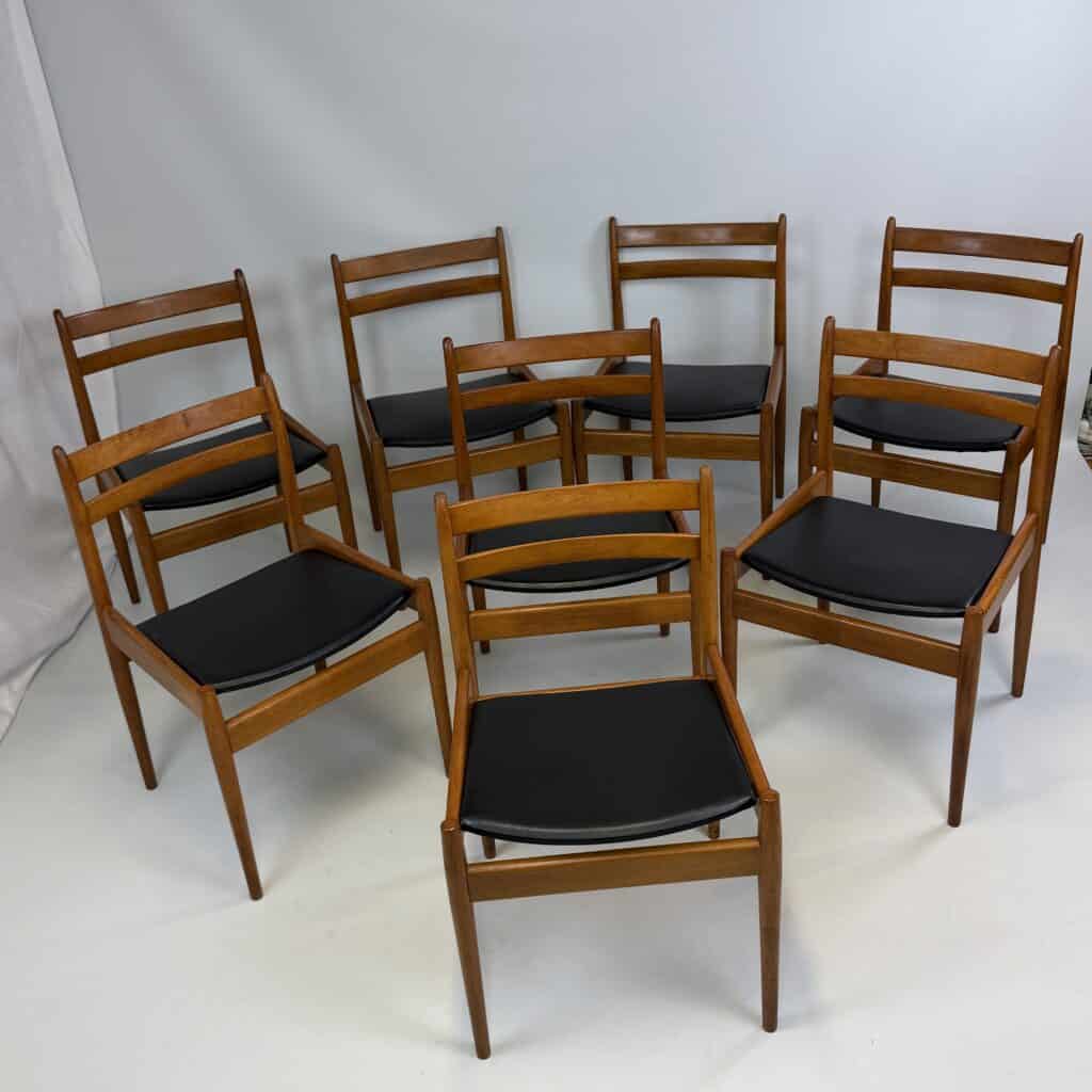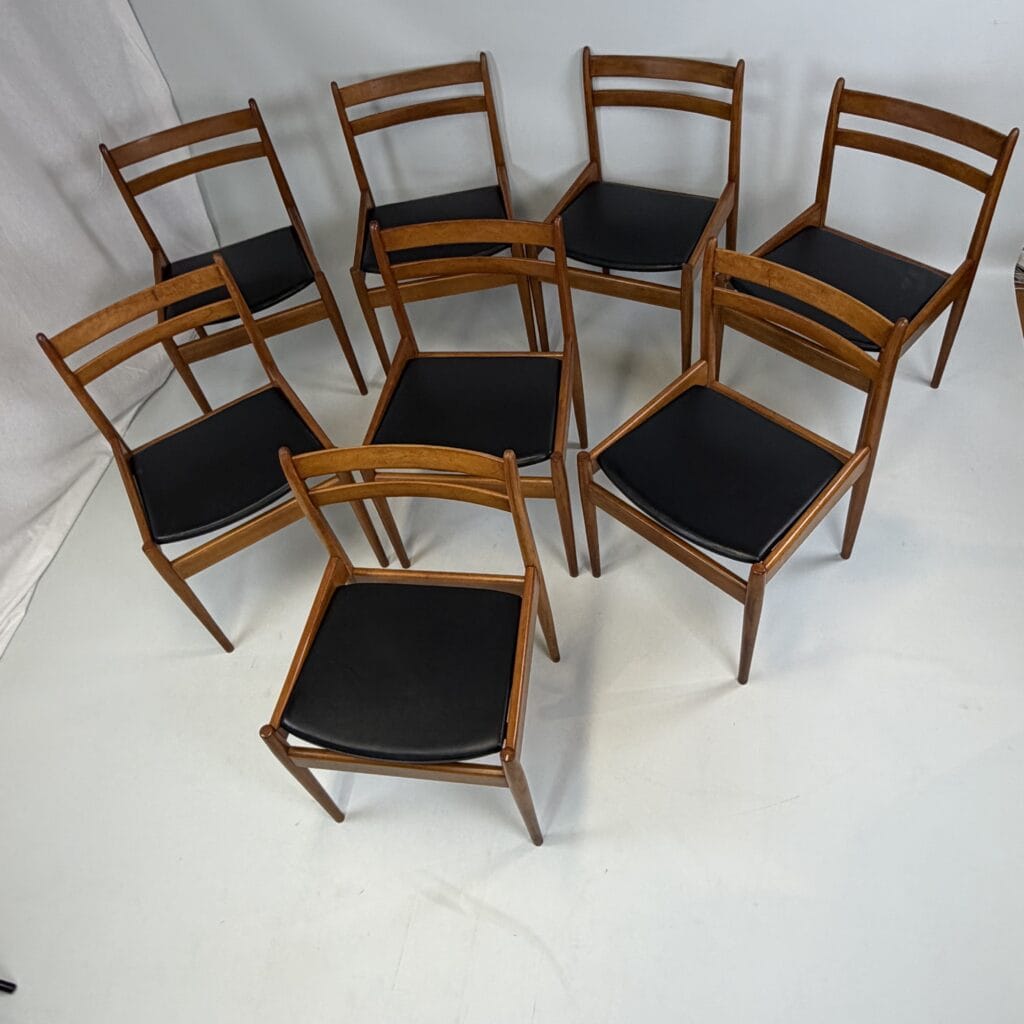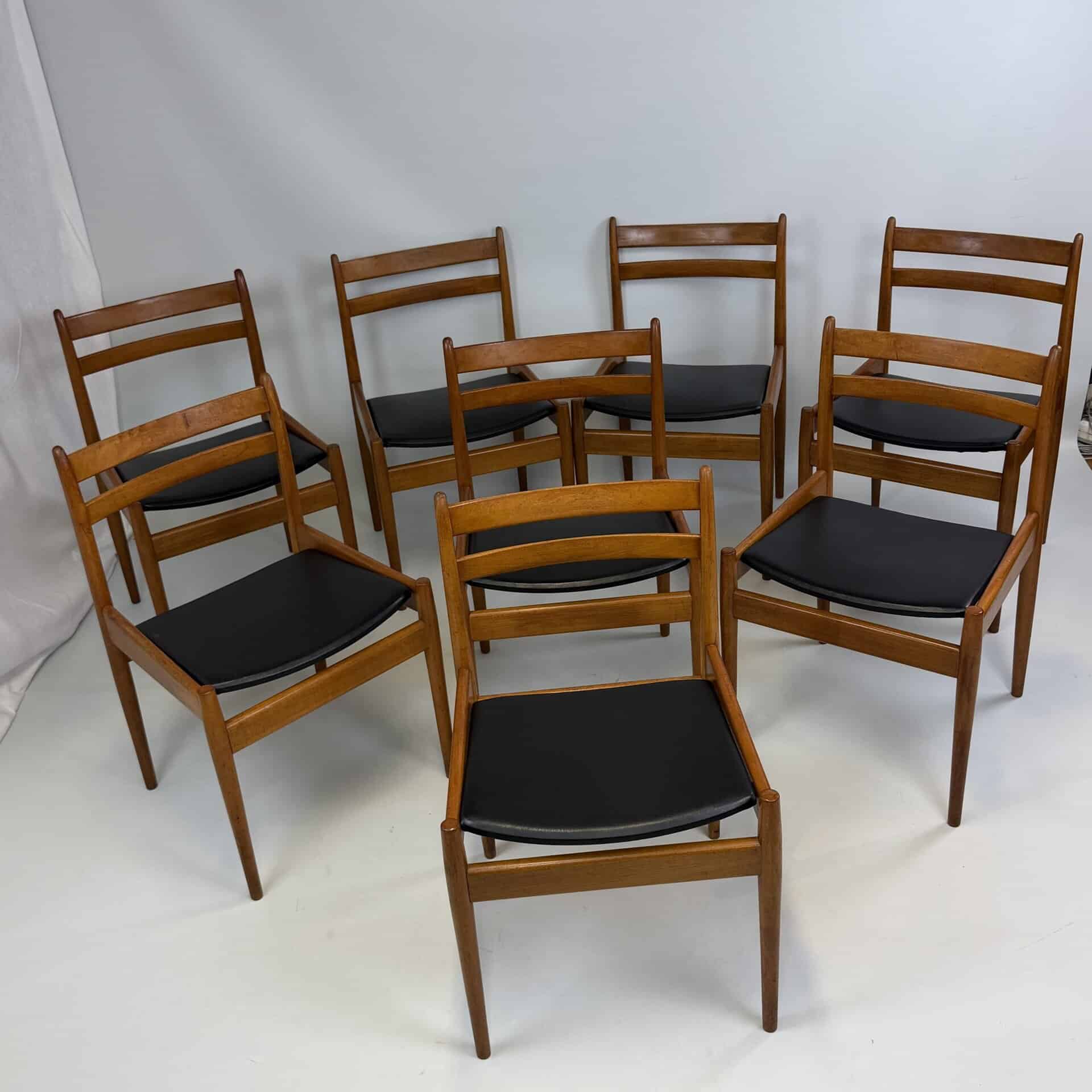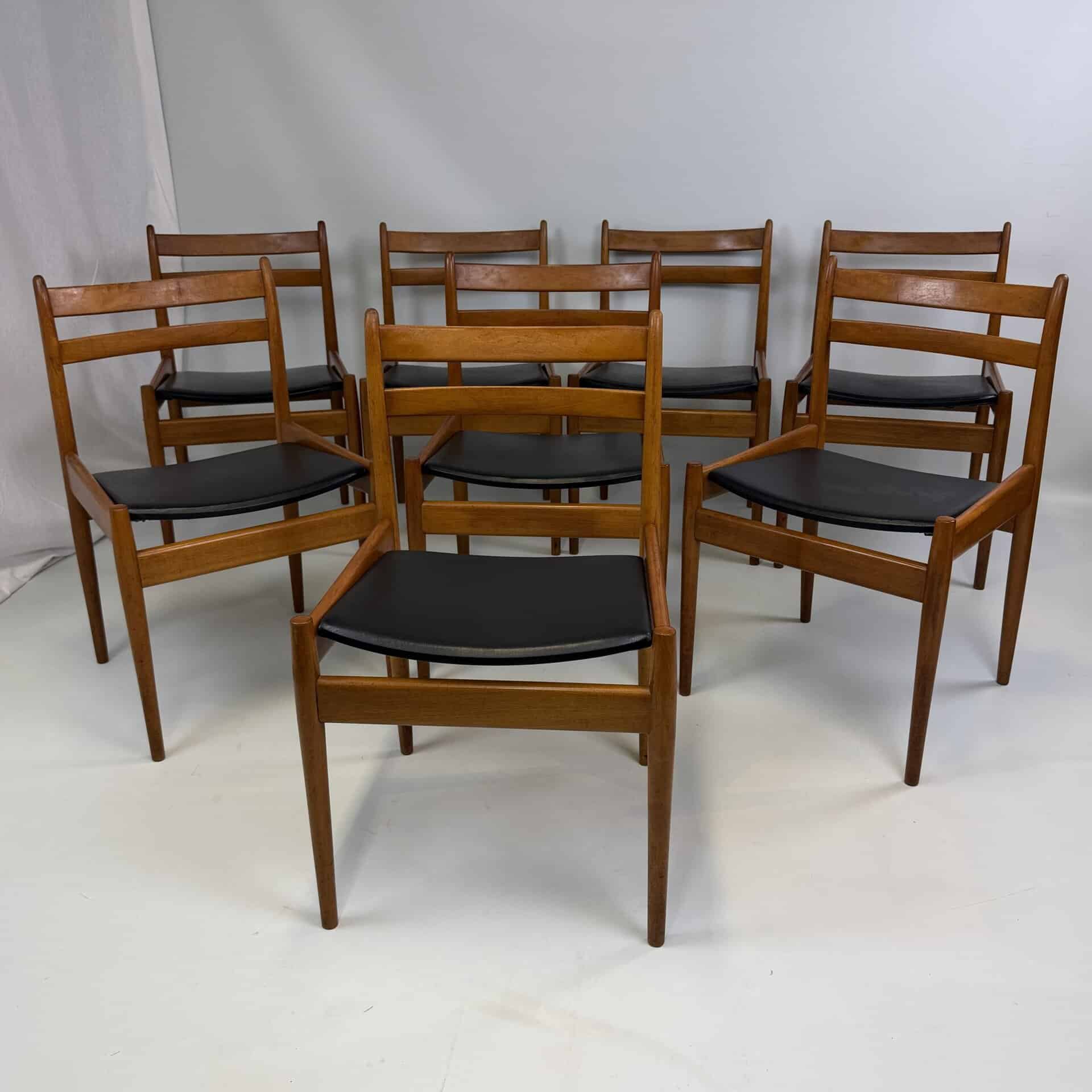 Set of 8 walnut wooden chairs with desirable patina, upholstered in black imitation leather on the sloping seat