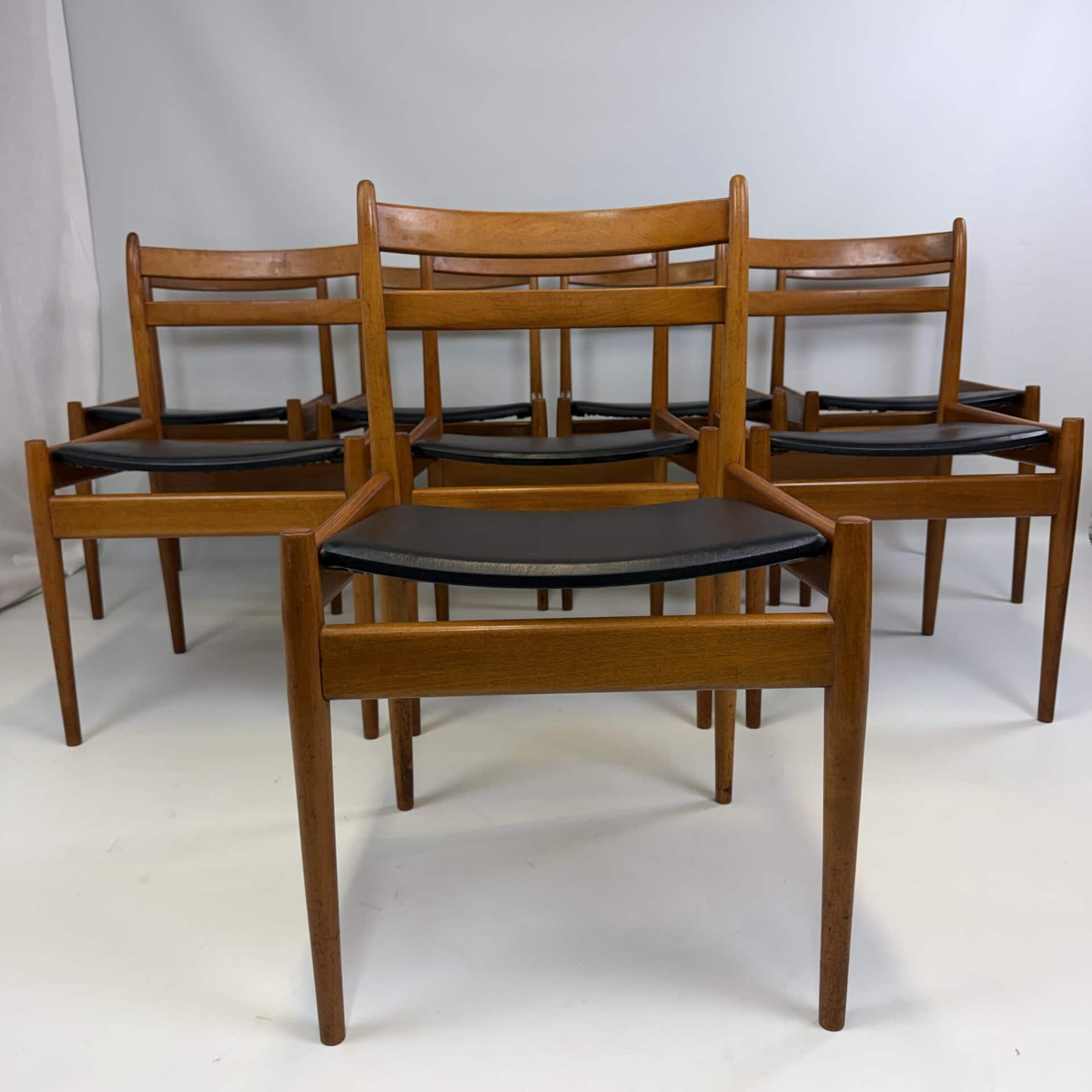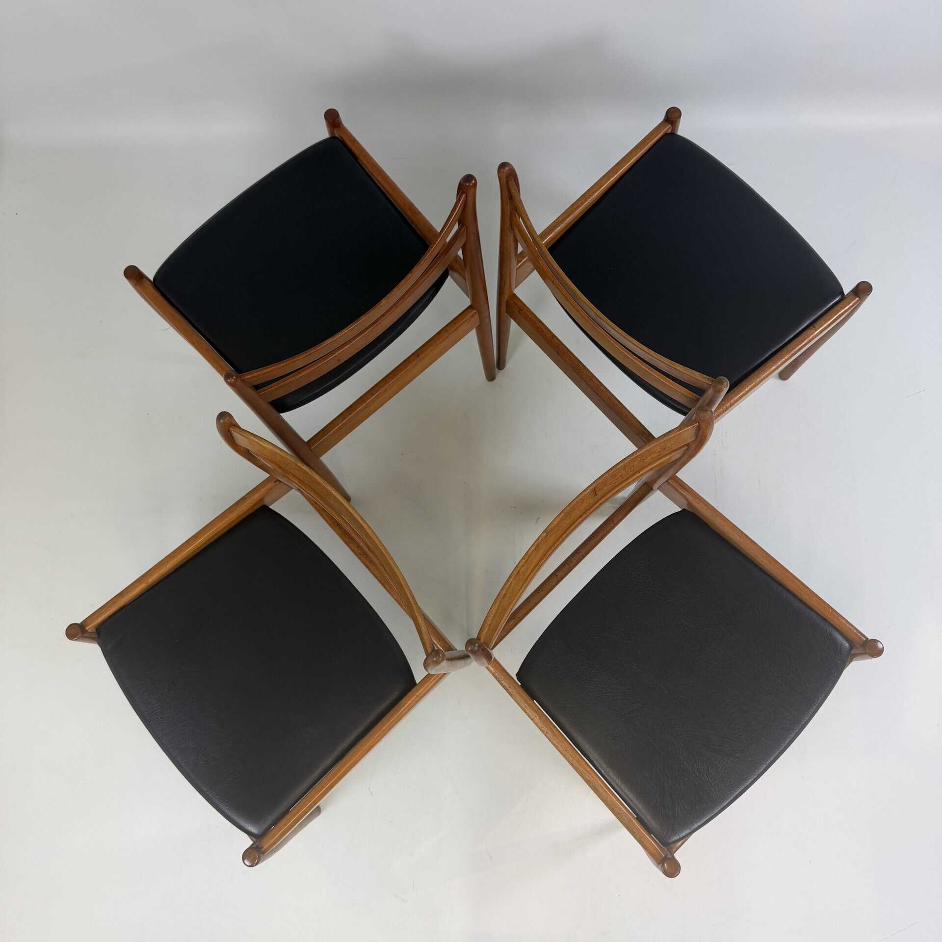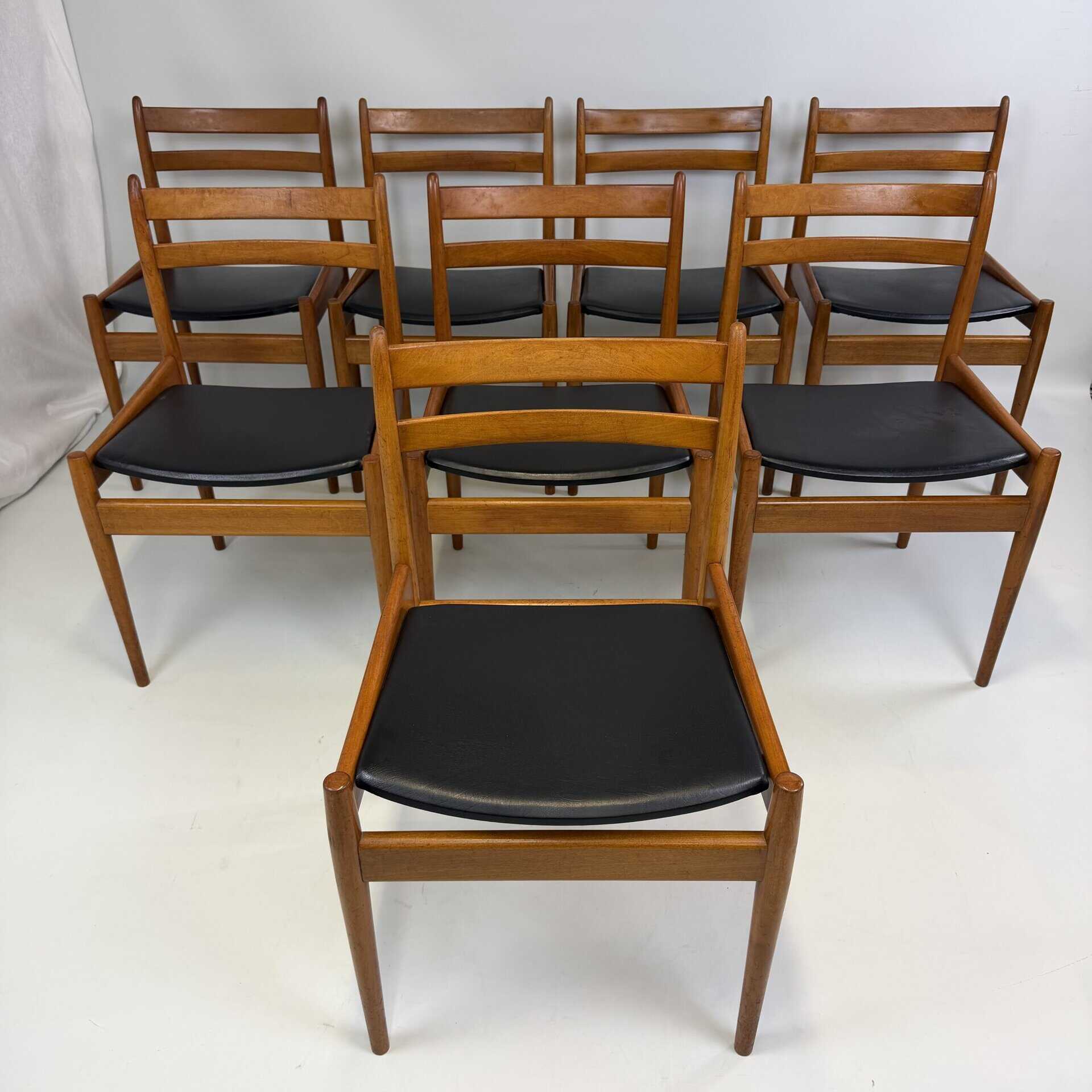 Set of 8 walnut wooden chairs with desirable patina, upholstered in black imitation leather on the sloping seat