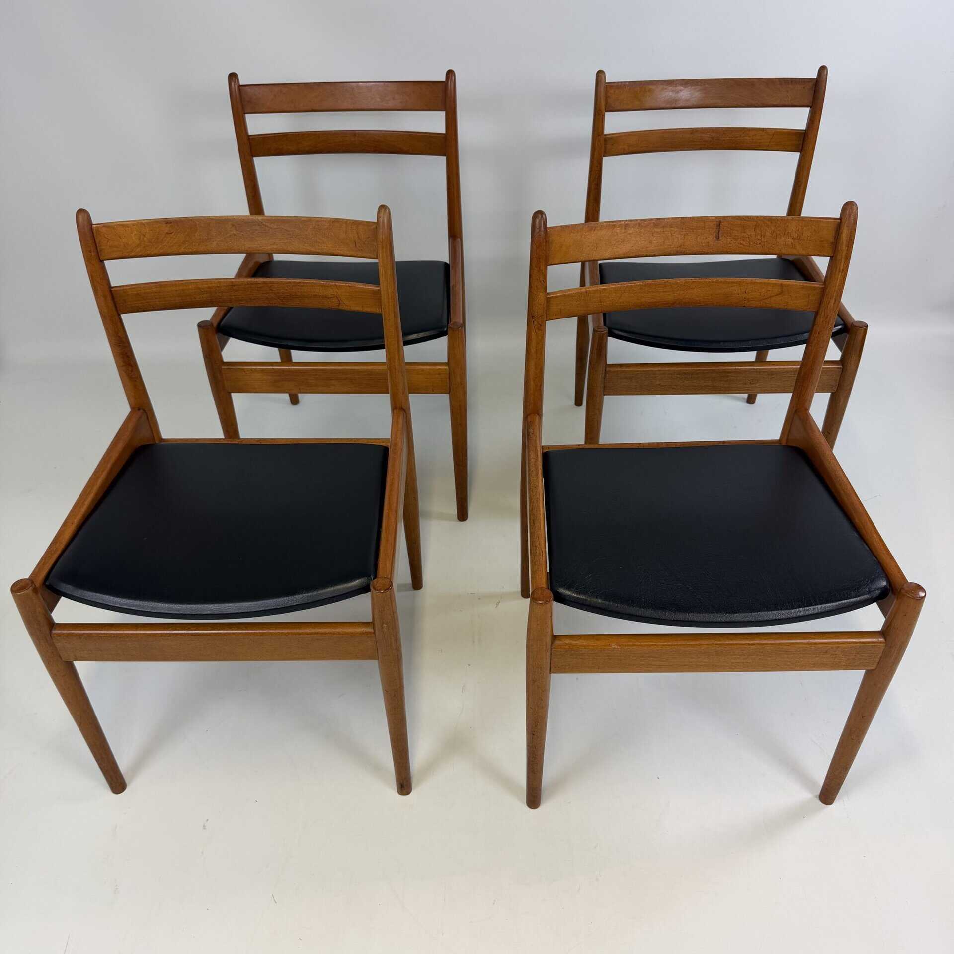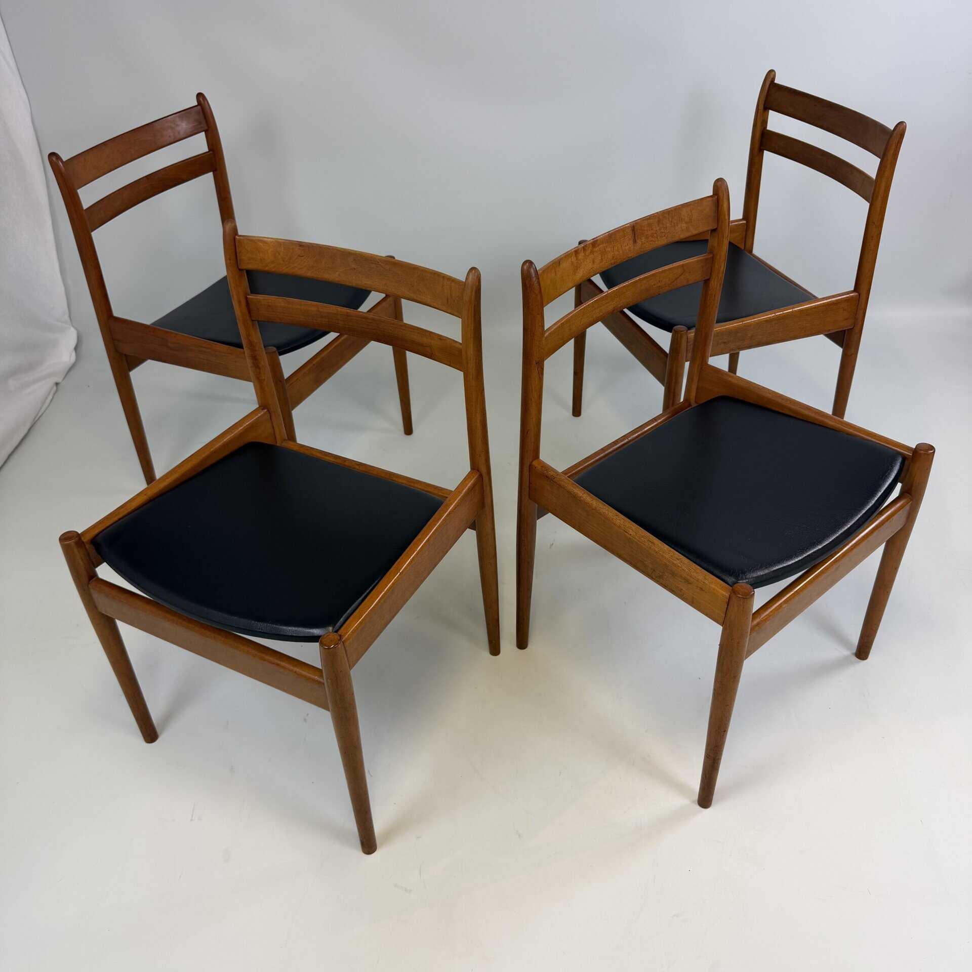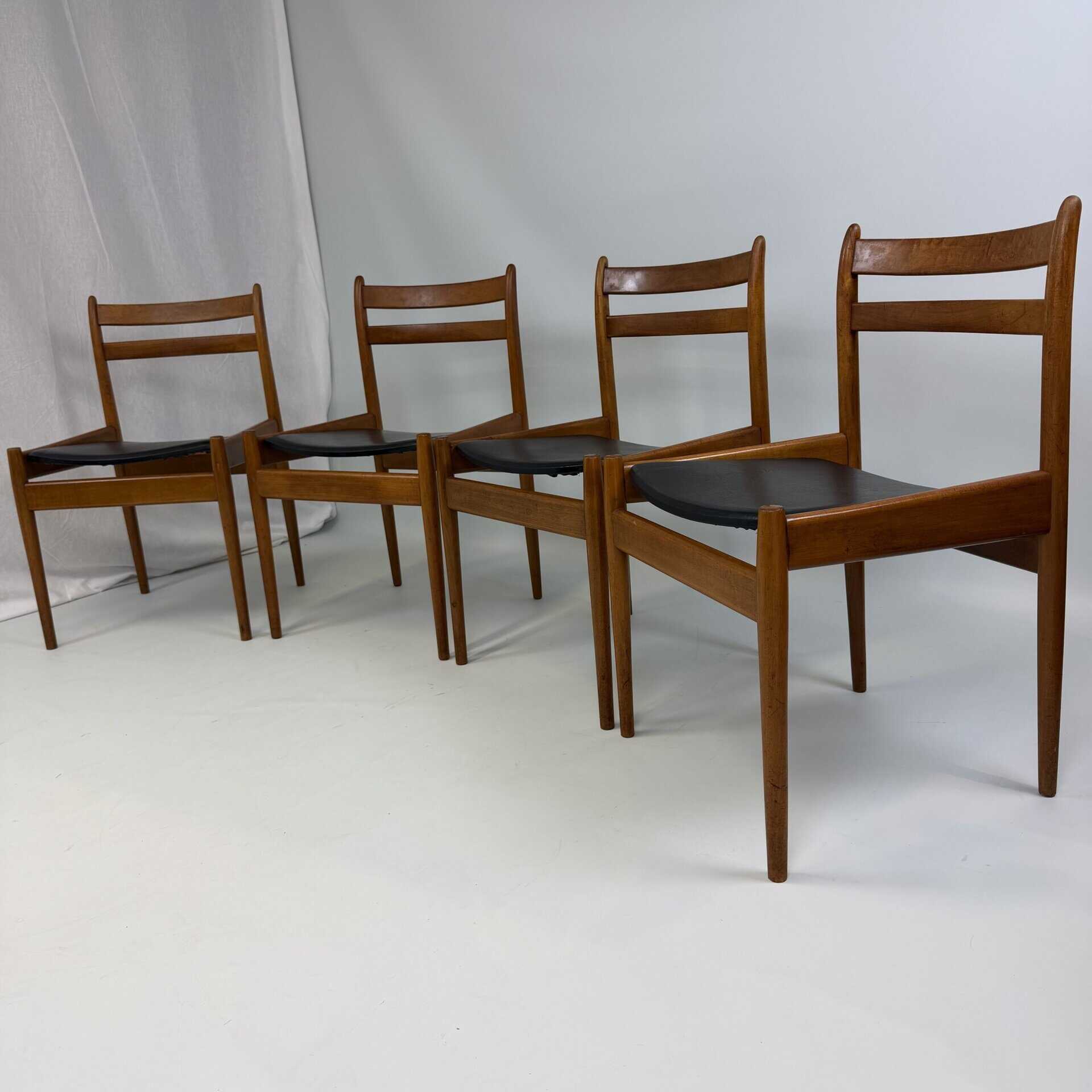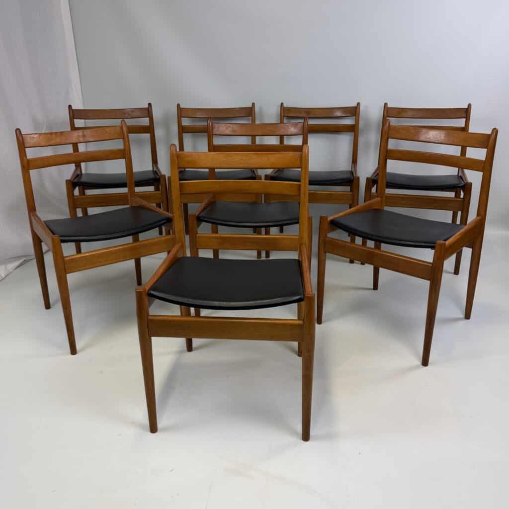 Set of 8 walnut wooden chairs with desirable patina, upholstered in black imitation leather on the sloping seat