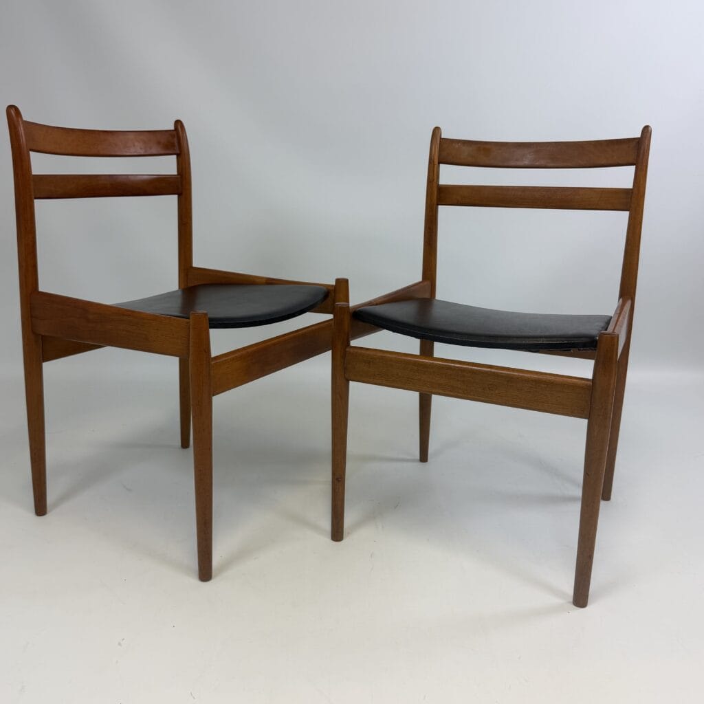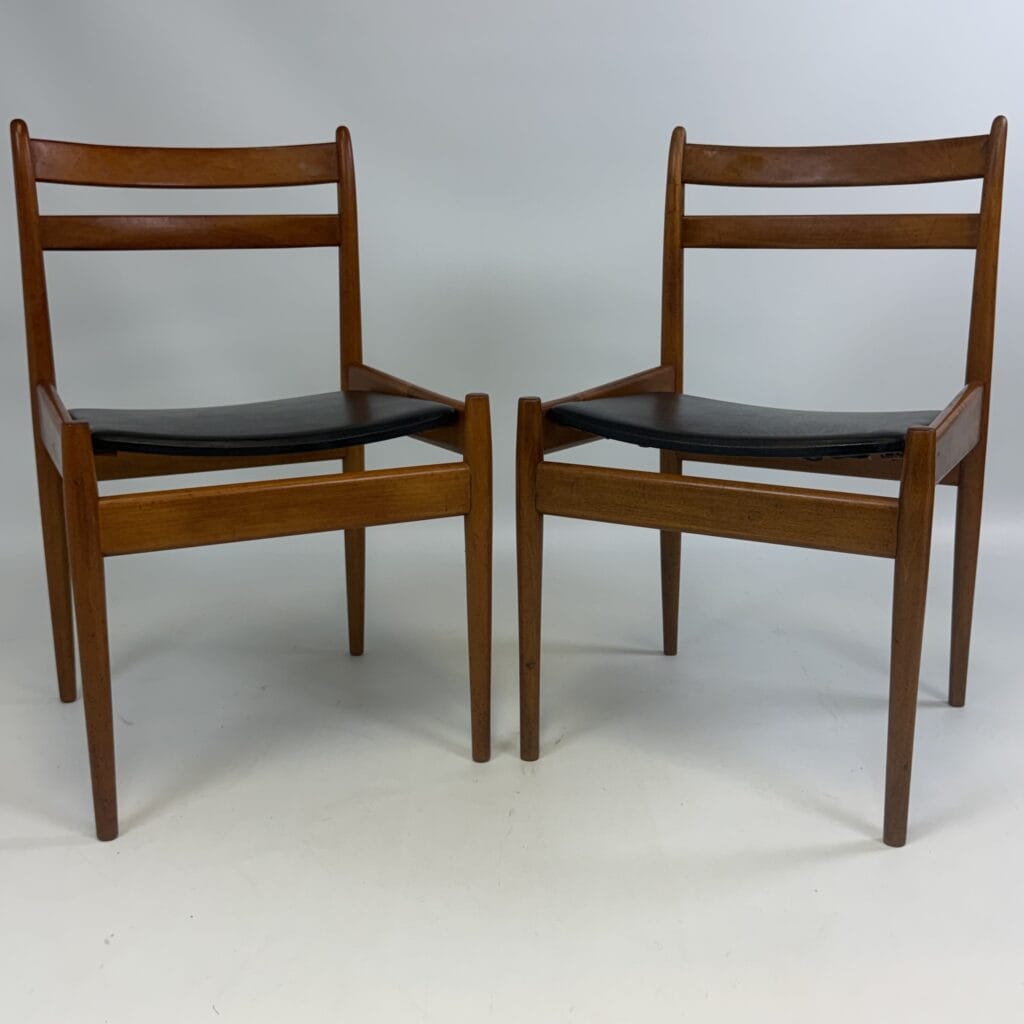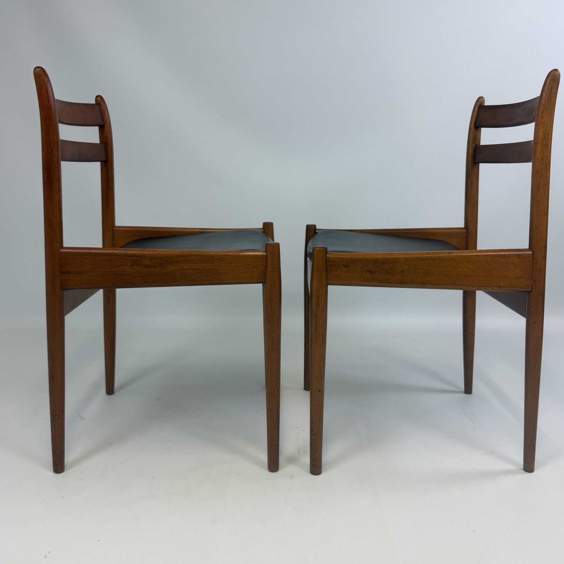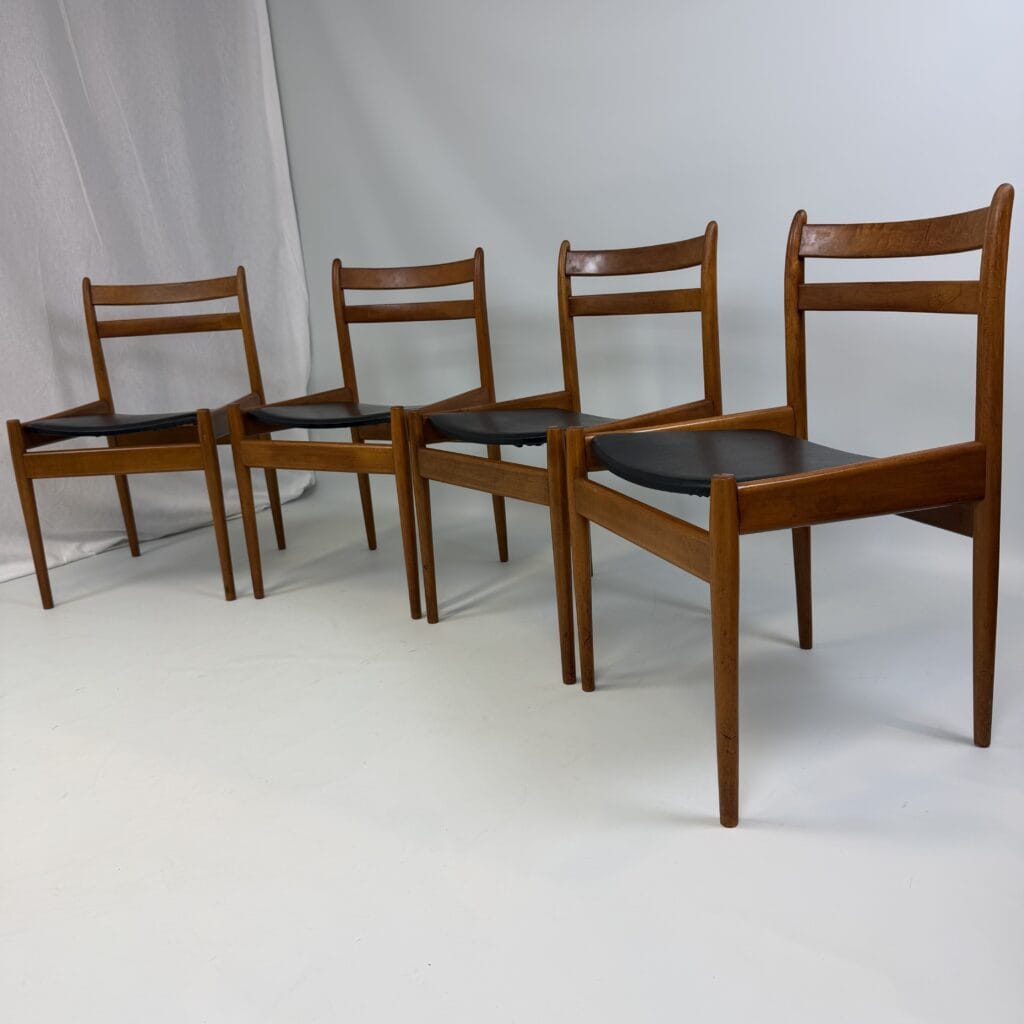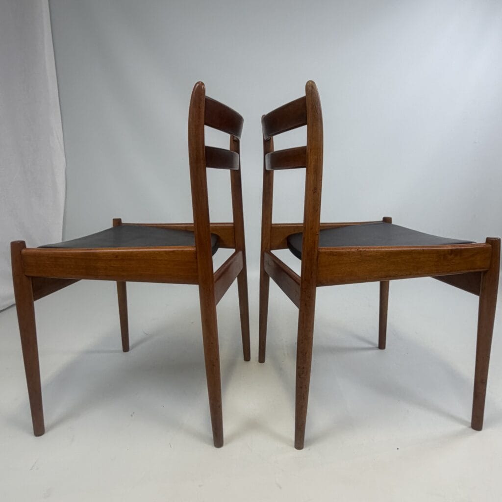 The chairs are characterised by slender, tapered legs and an open, curved backrest with horizontal slats.