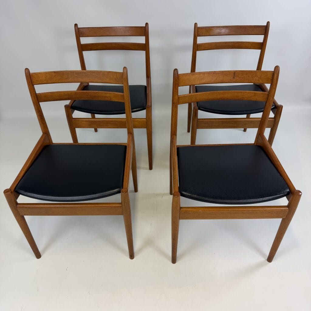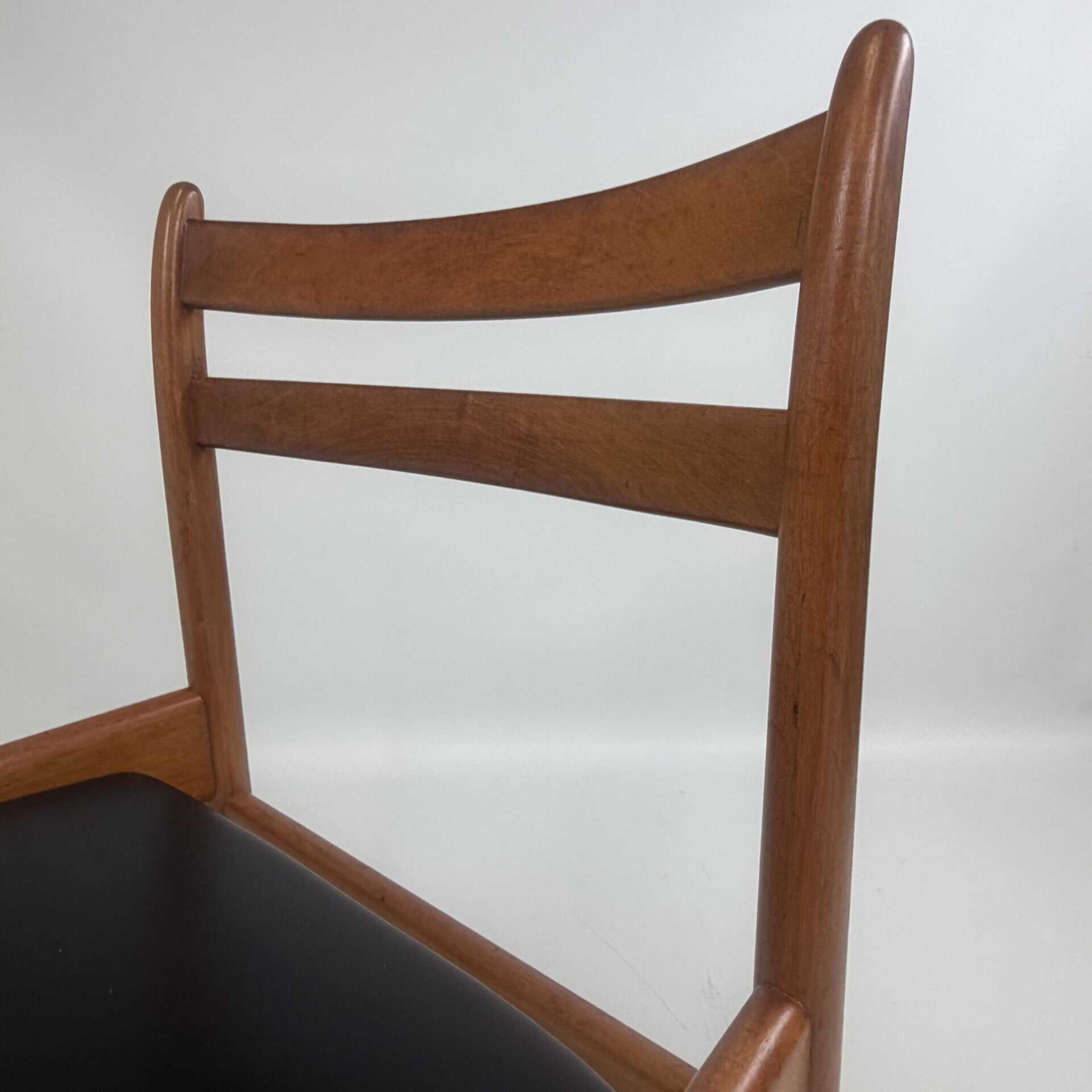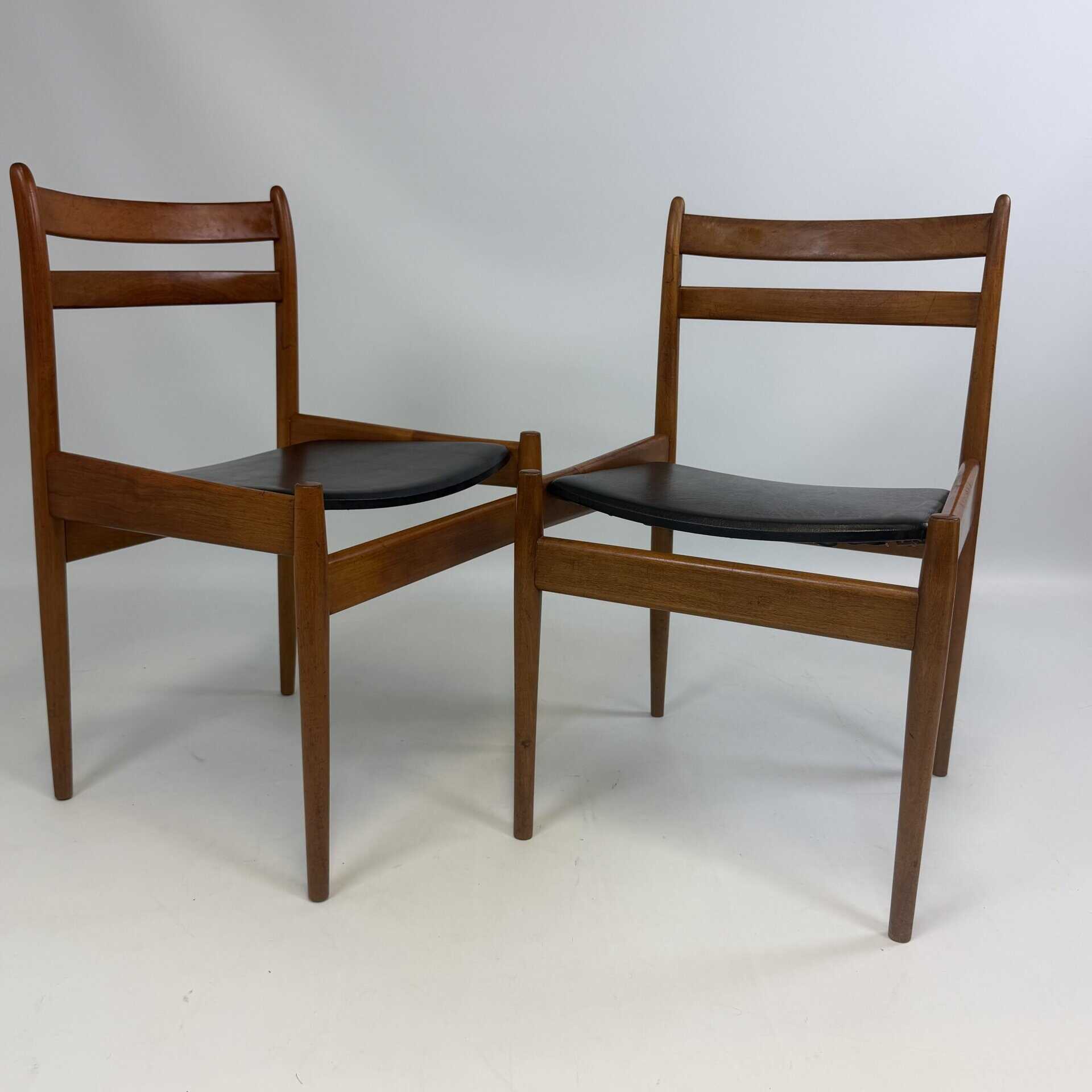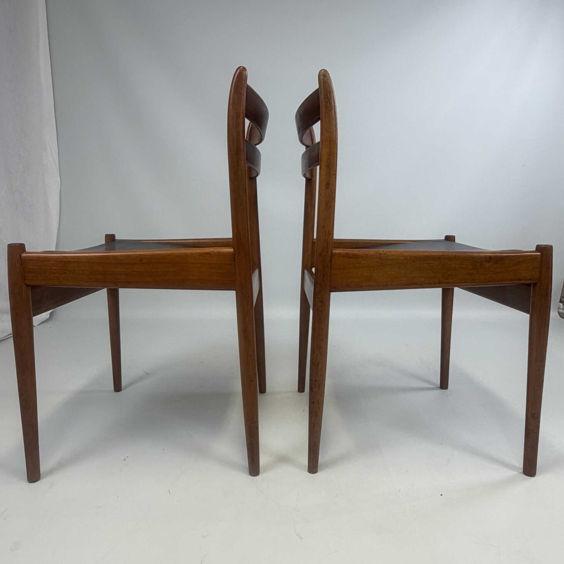 The chairs are characterised by slender, tapered legs and an open, curved backrest with horizontal slats.