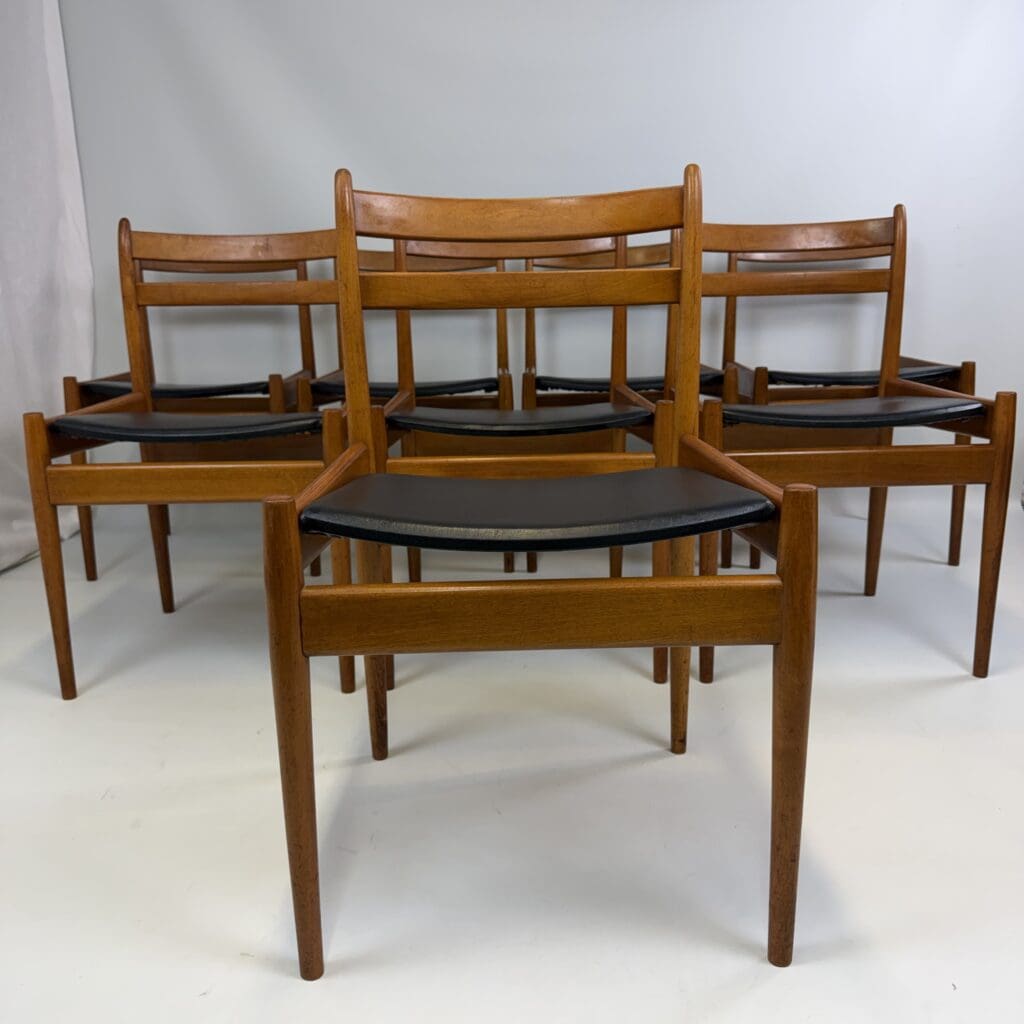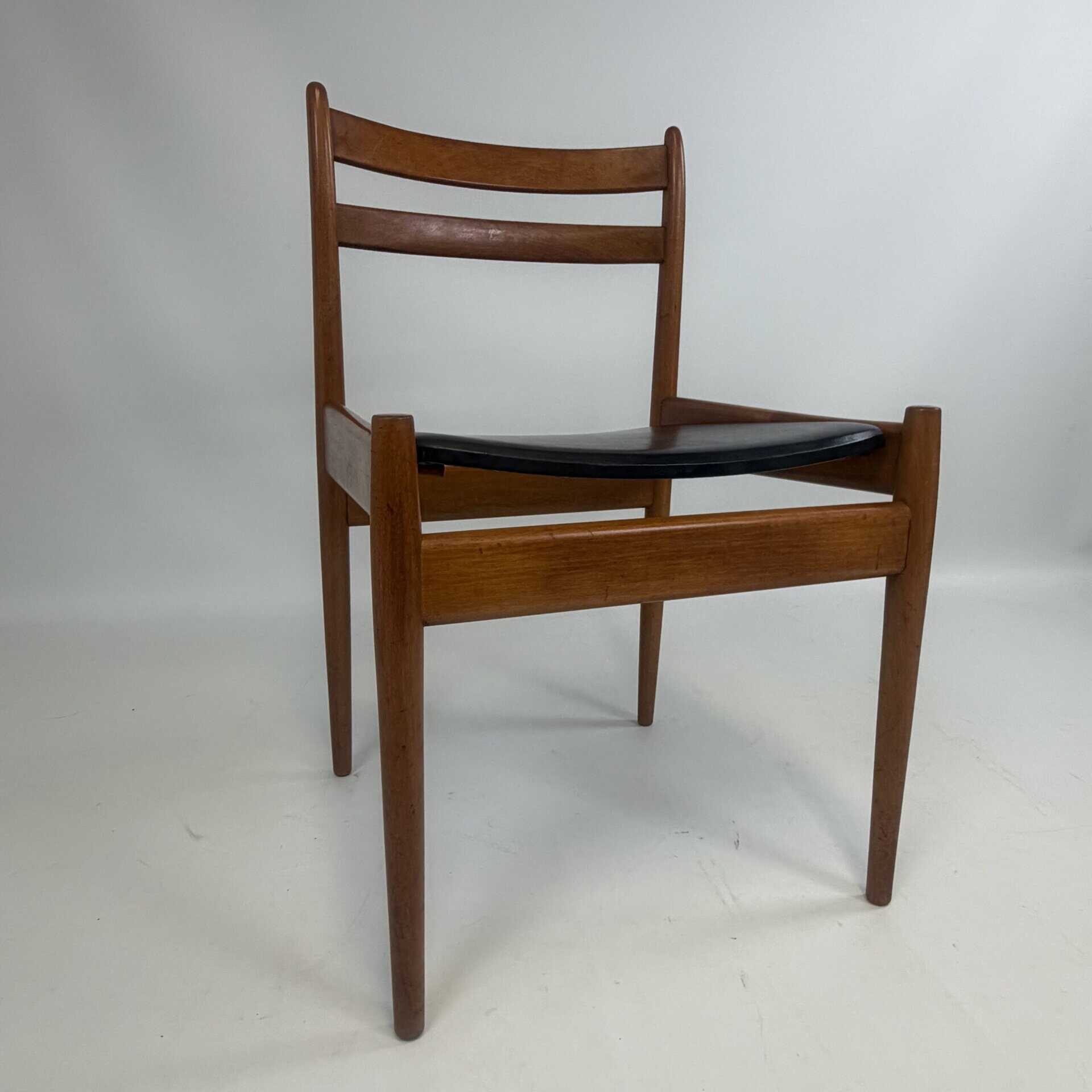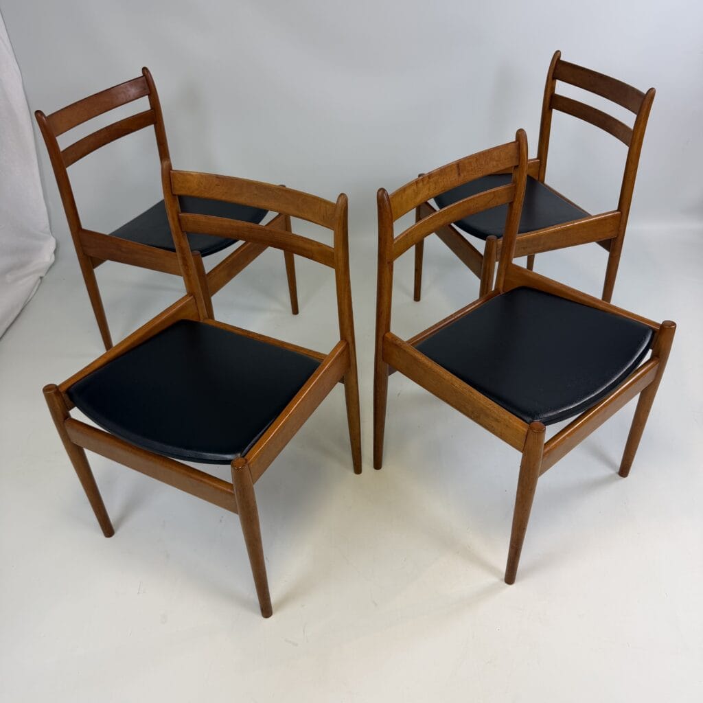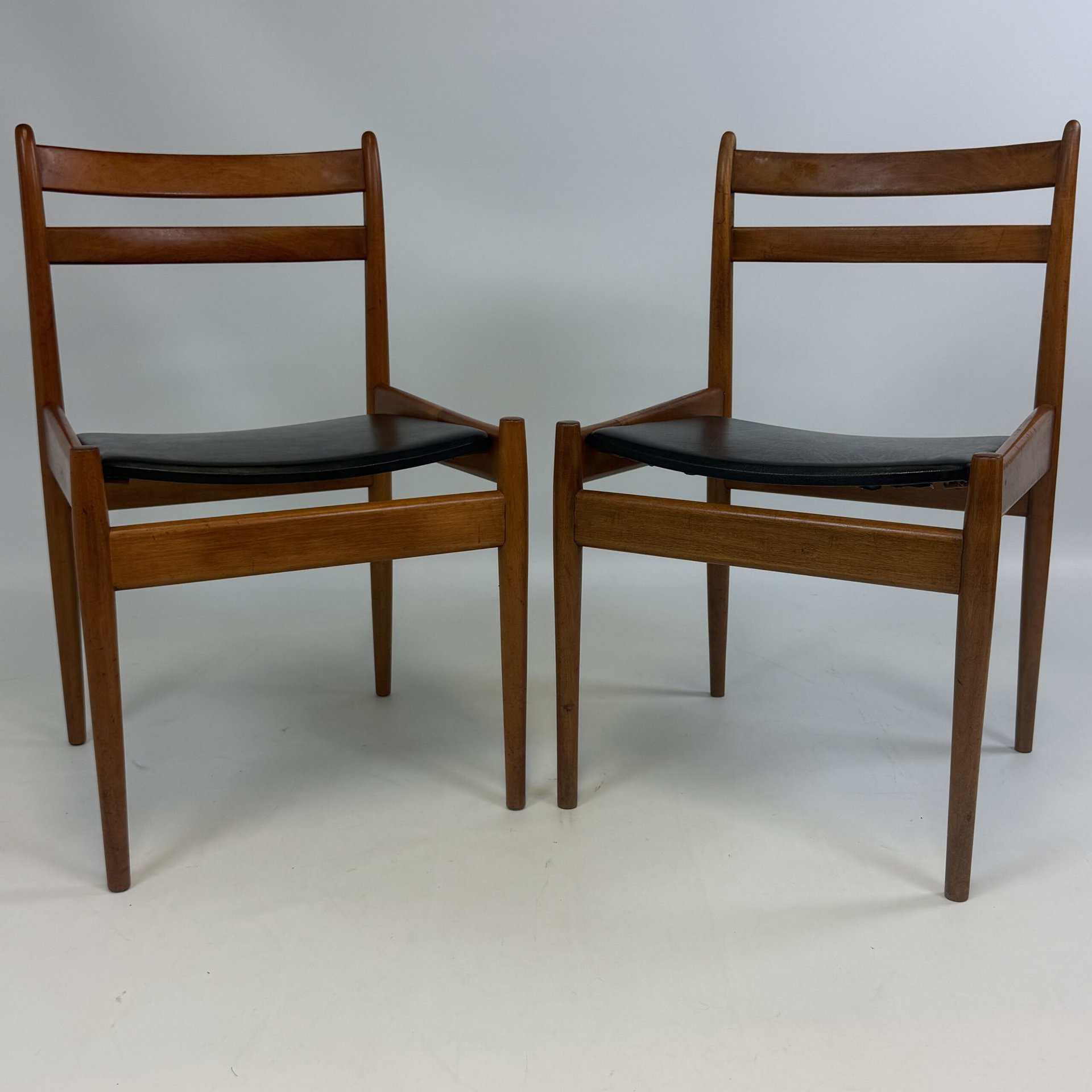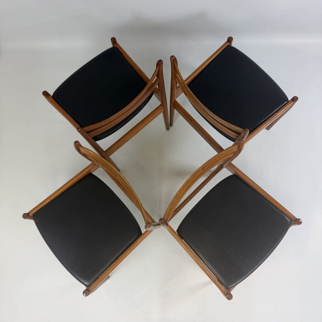 The chairs are characterised by slender, tapered legs and an open, curved backrest with horizontal slats.