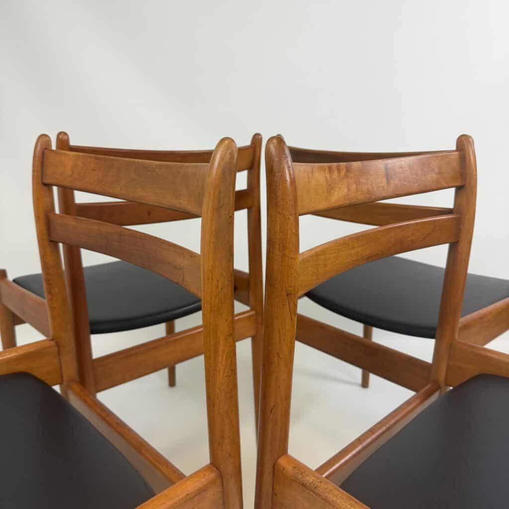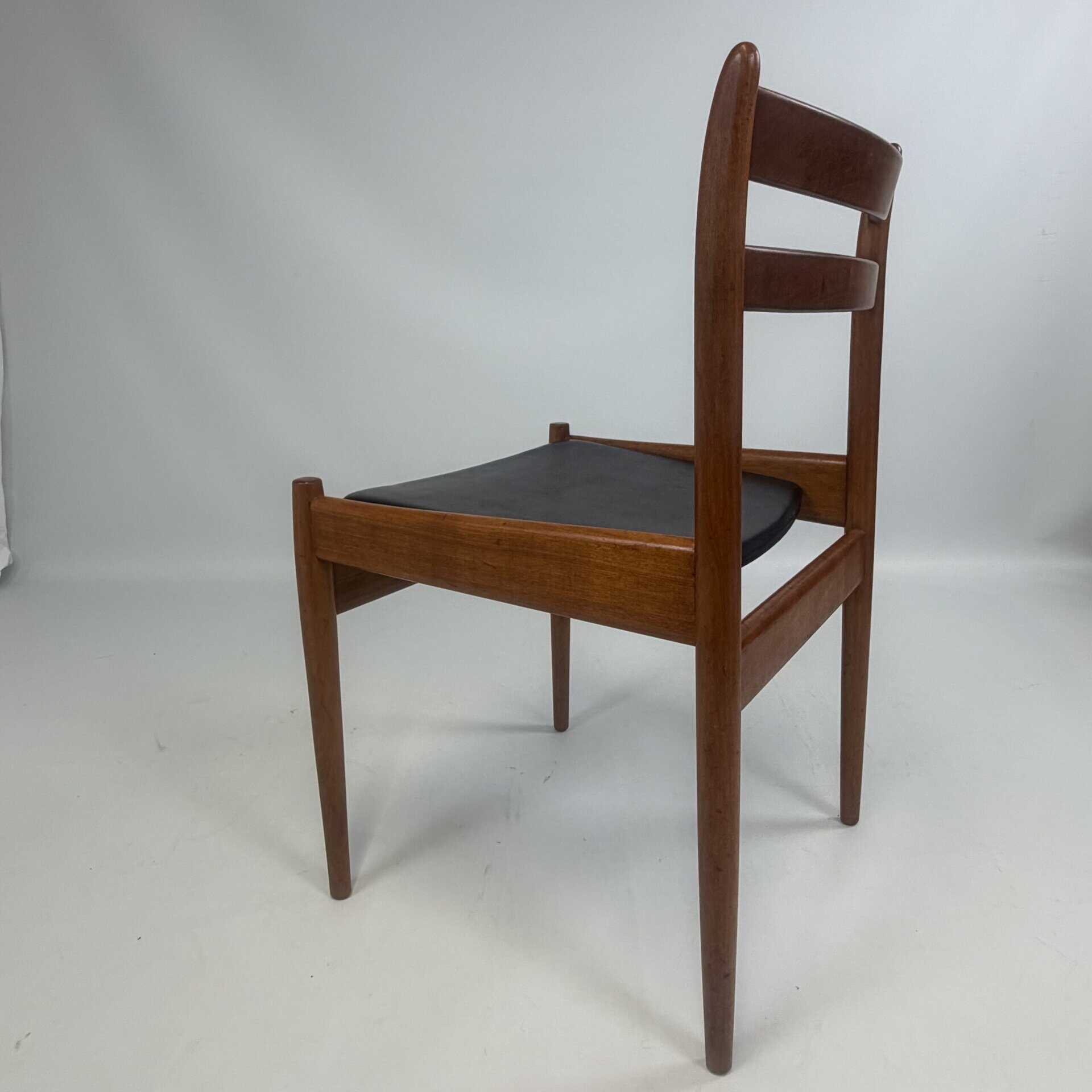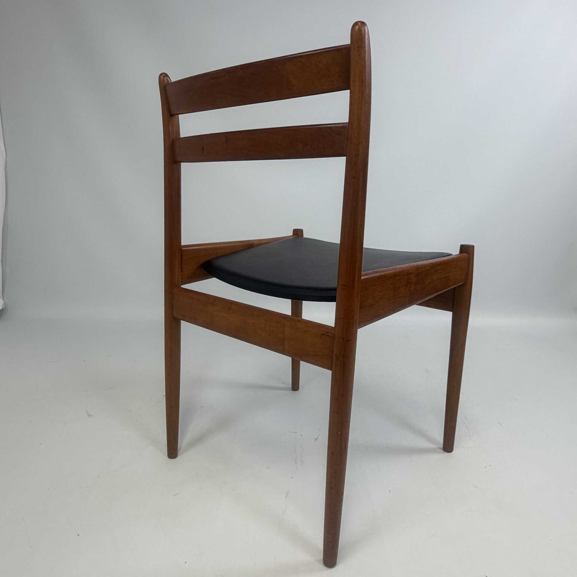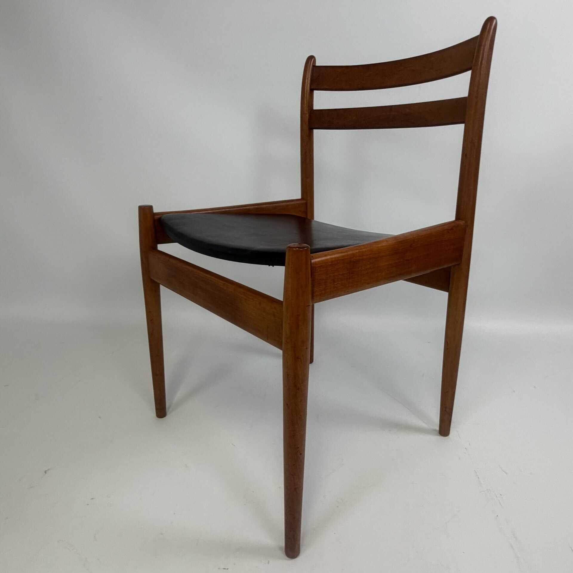 The chairs are characterised by slender, tapered legs and an open, curved backrest with horizontal slats.