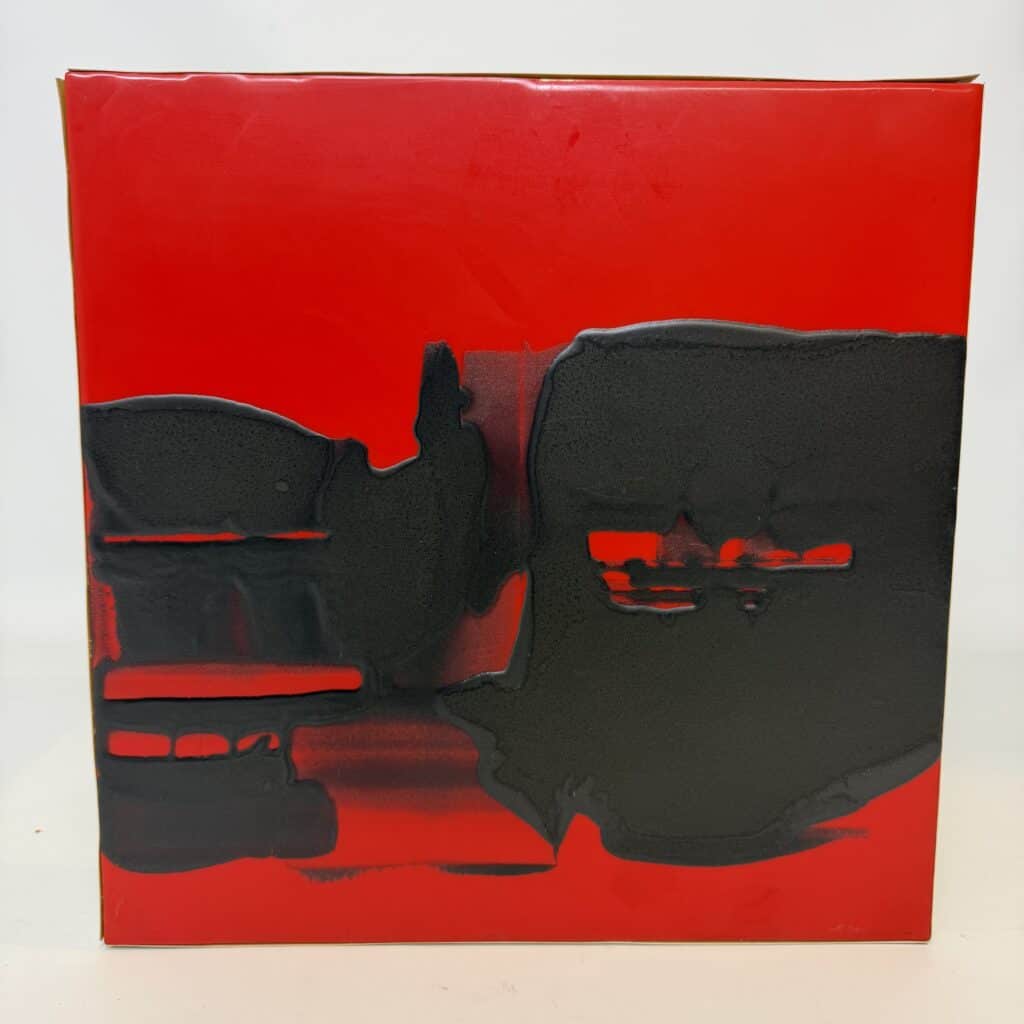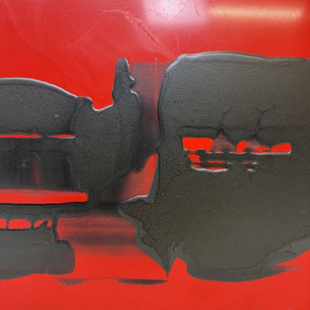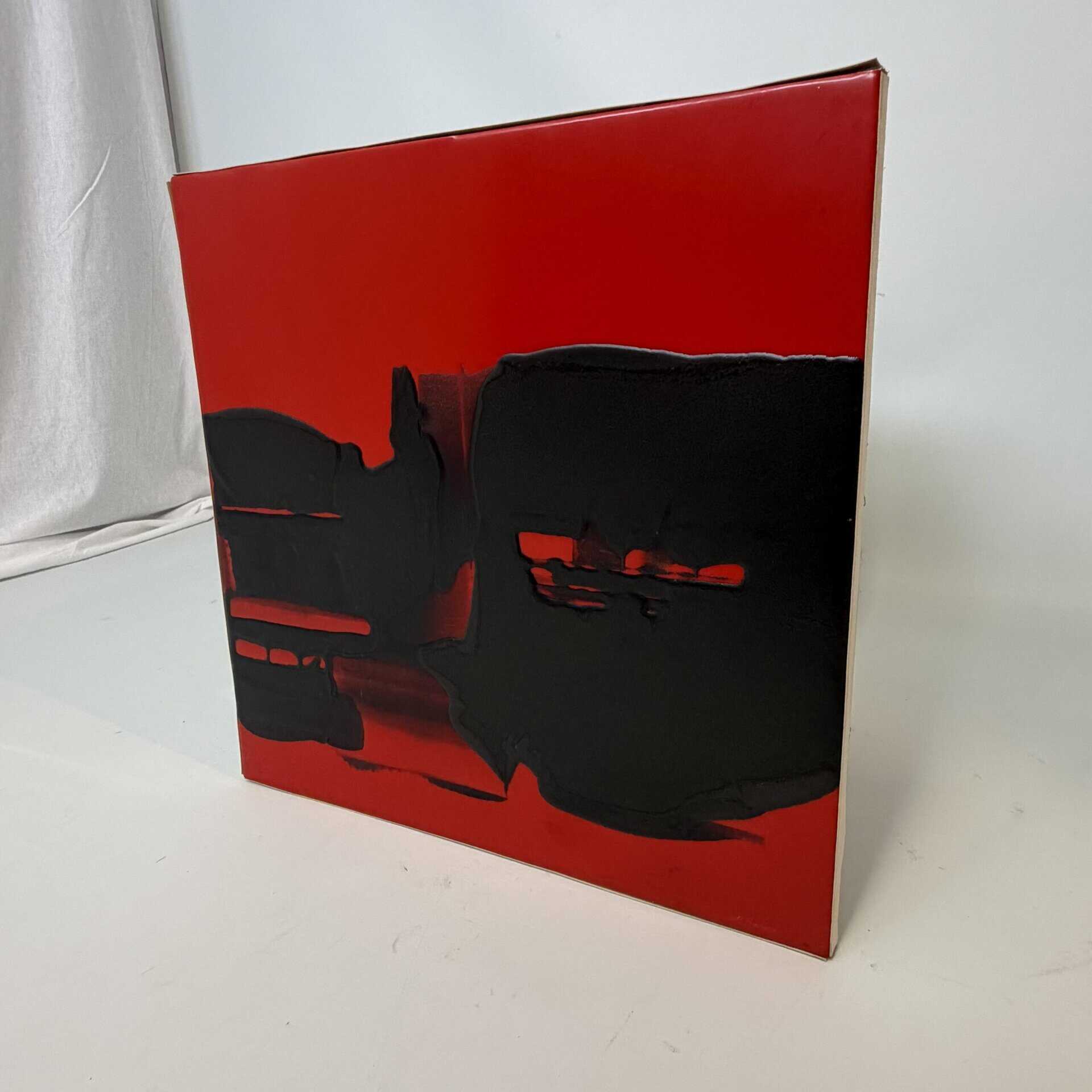 The image is abstract and non-figurative. The artwork is non-figurative and dominated by a large, irregular black mass that extends across the square canvas, the black paint applied thickly against a red background with a glossy finish