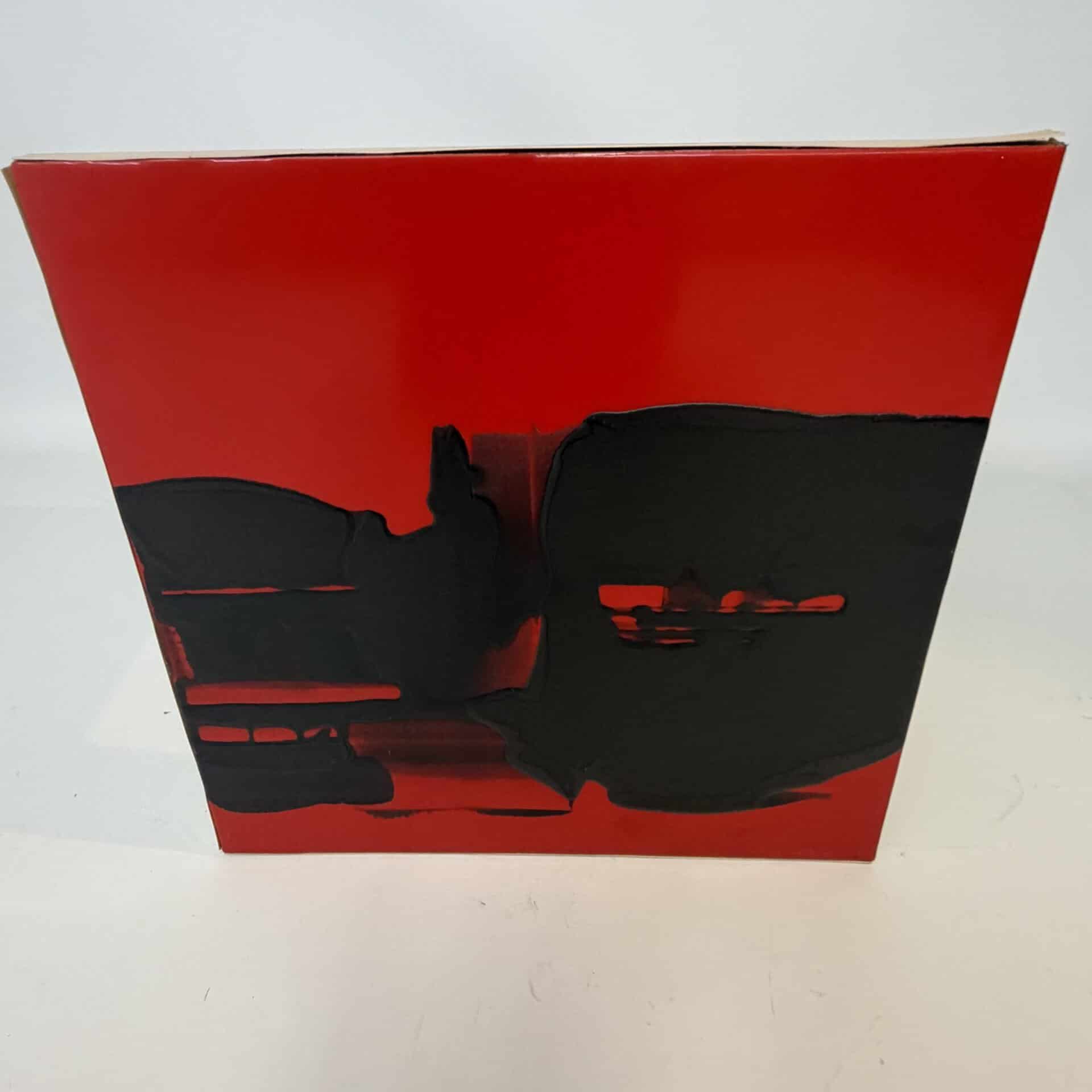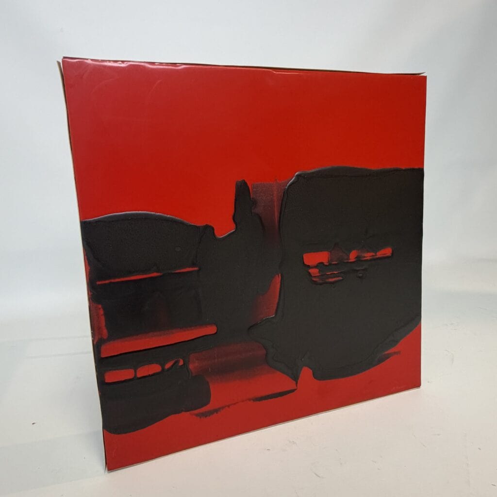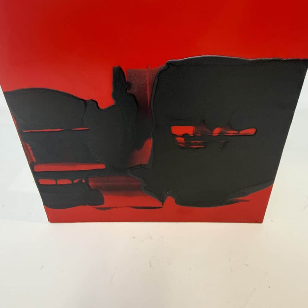 The image is abstract and non-figurative. The artwork is non-figurative and dominated by a large, irregular black mass that extends across the square canvas, the black paint applied thickly against a red background with a glossy finish