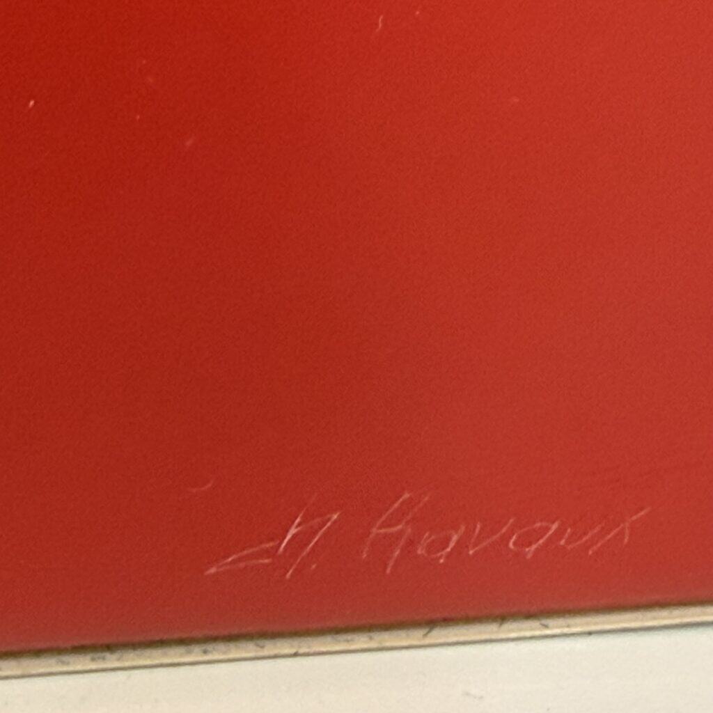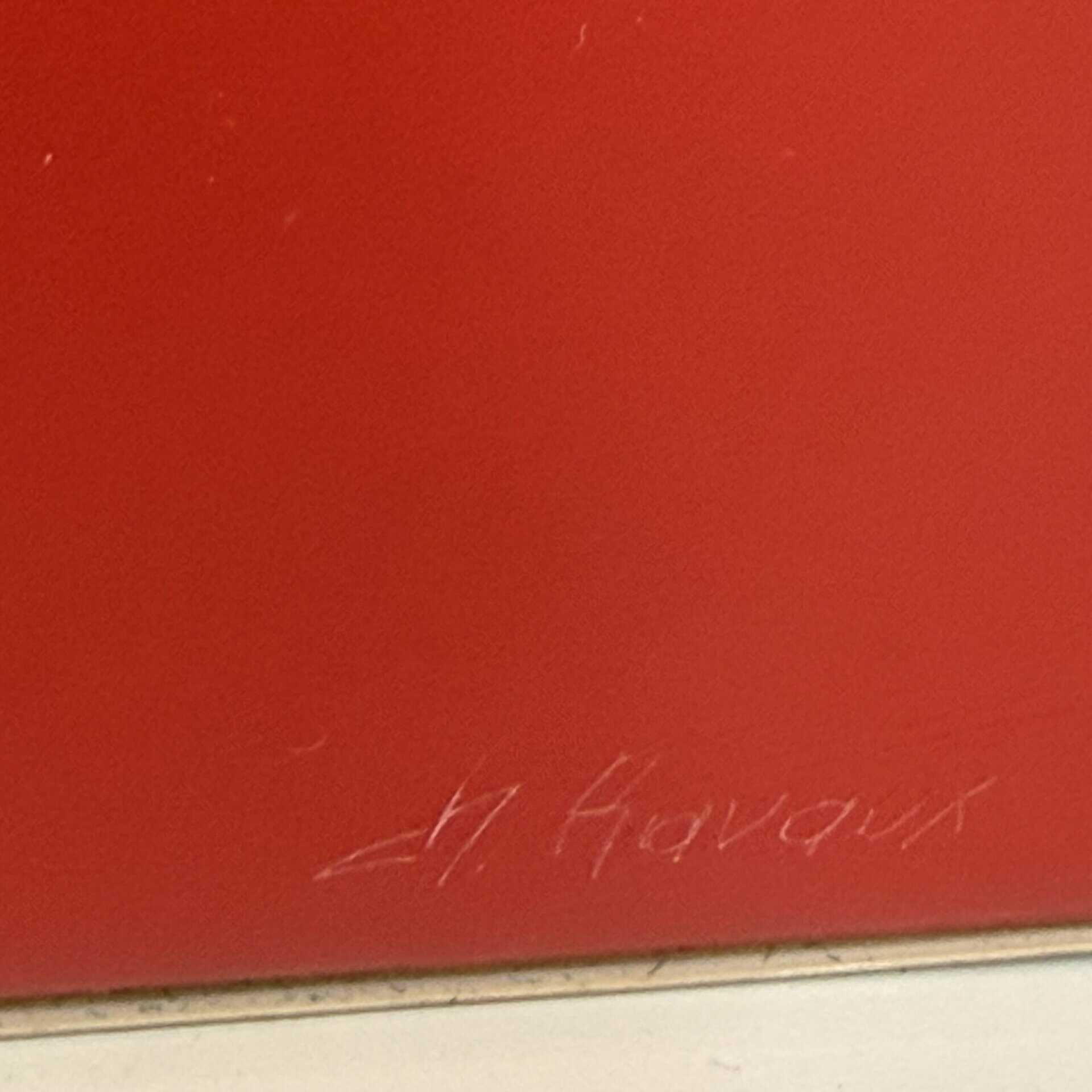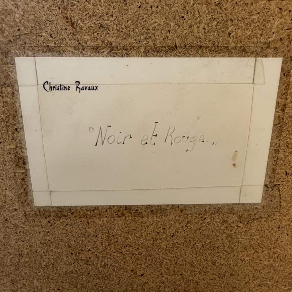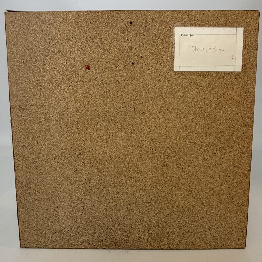 Parts of the red background shine through the black section in horizontal strips and fragmentary openings, adding depth and contrast