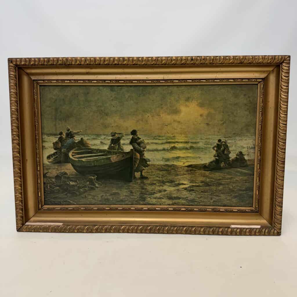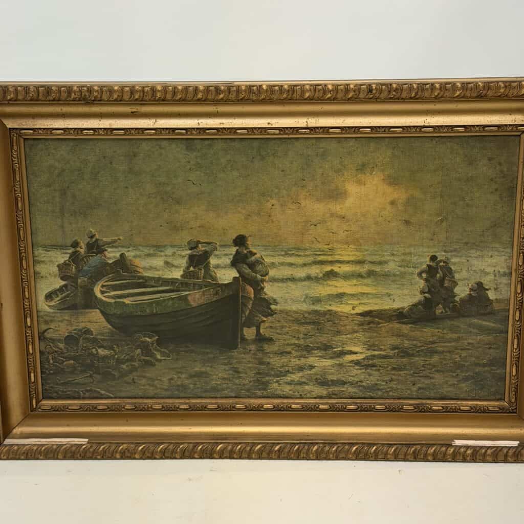 It depicts a coastal scene at sunrise, fisherwomen and children waiting on the beach for the return of the fishing boat