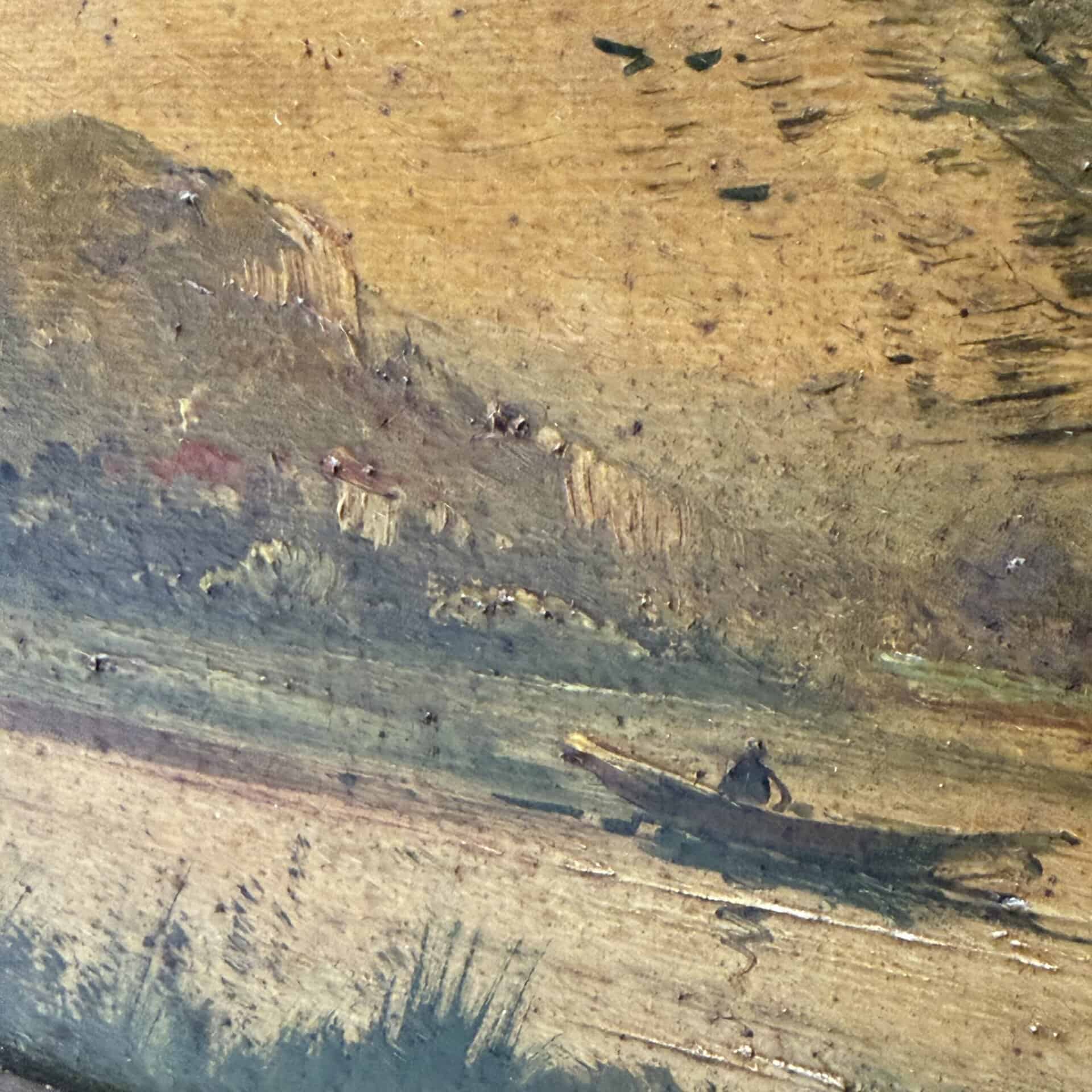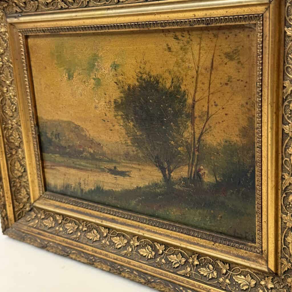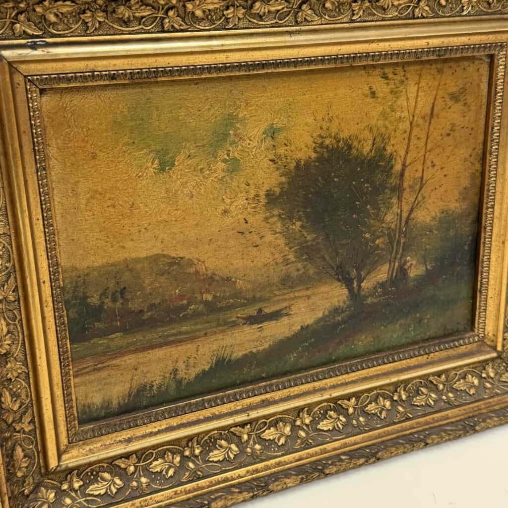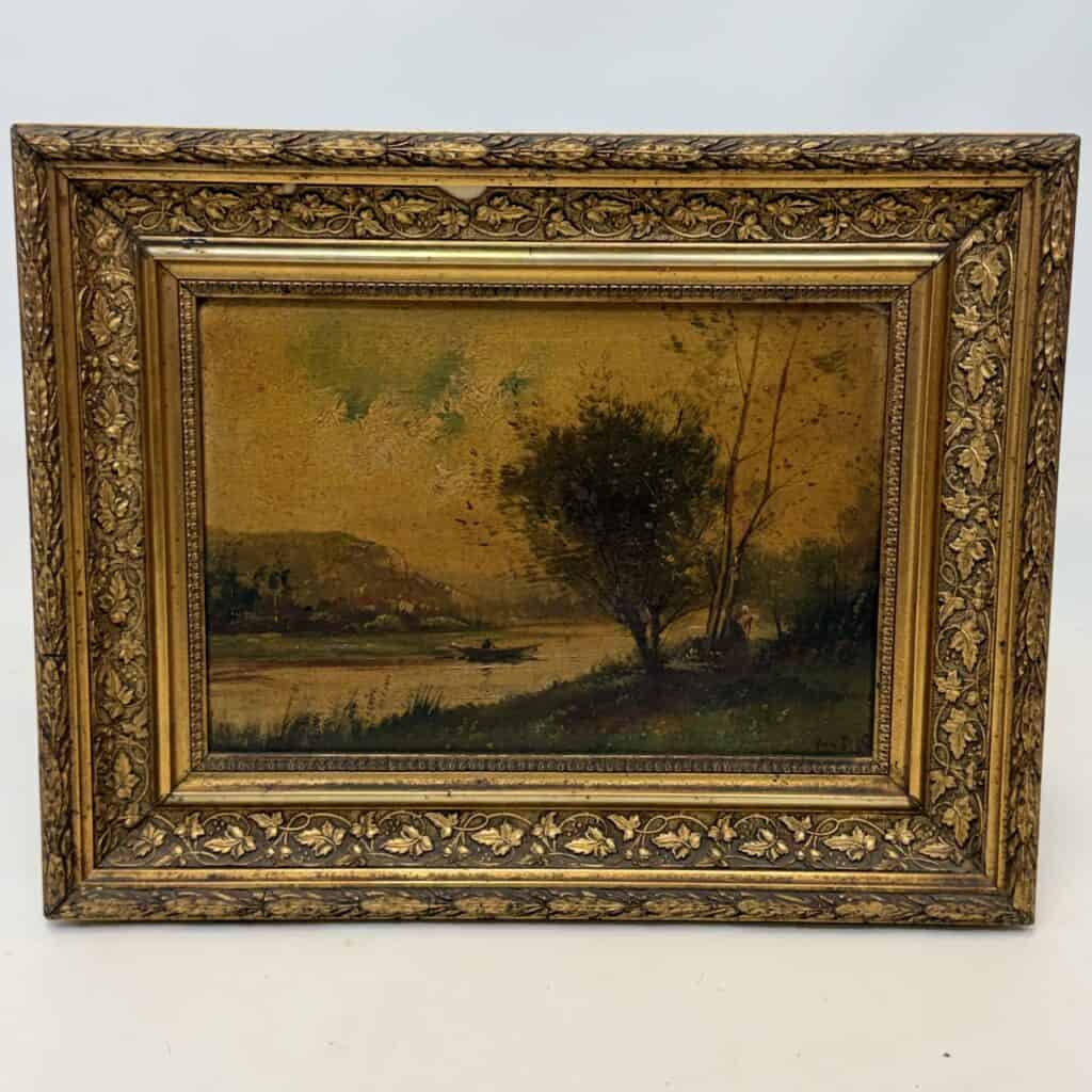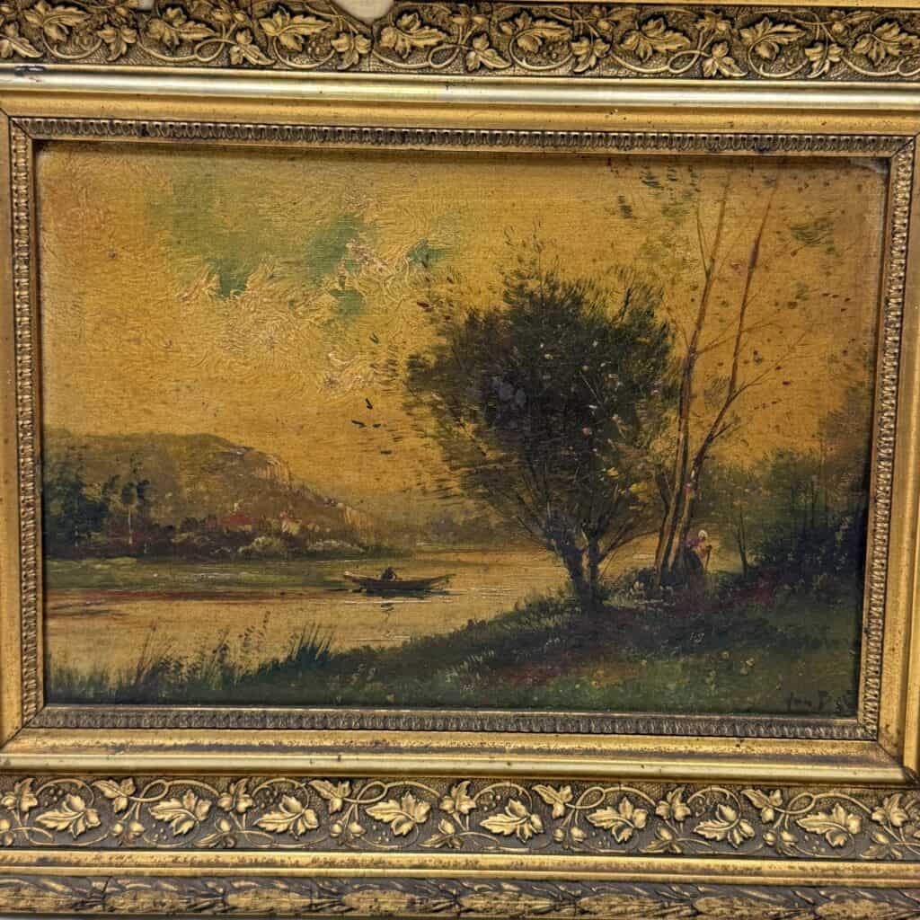 This is painted in a Barbizon-influenced landscape tradition and depicts a European river landscape at sunset or sunrise, with a boat on the water and figures on the bank