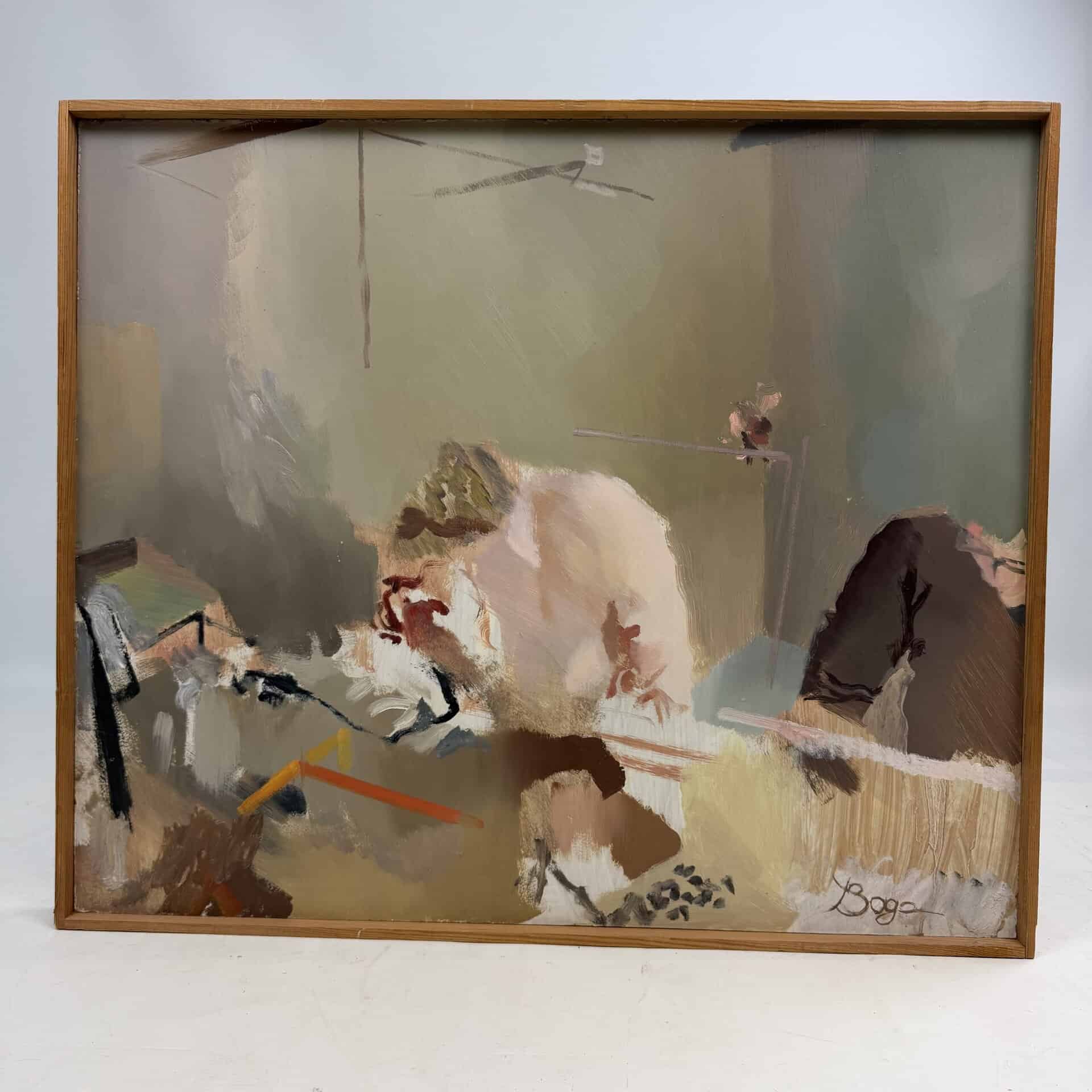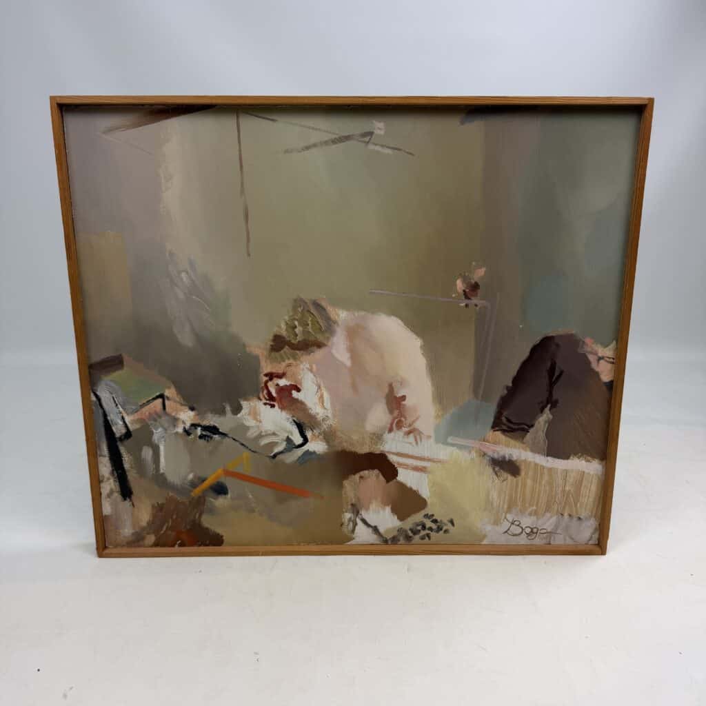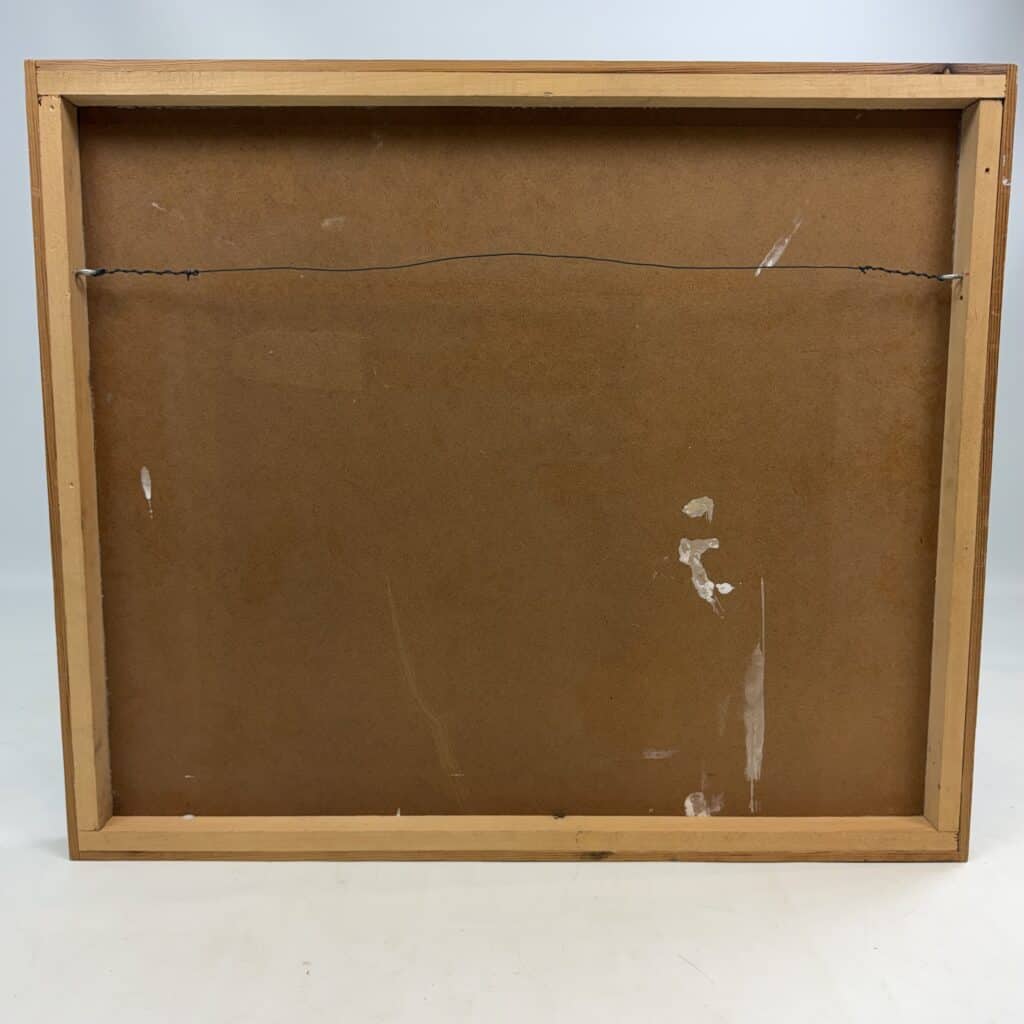 Wooden frame, the canvas is set back inside the frame which gives a subtle “window” effect which adds depth to his often “blurred” and elusive subjects.