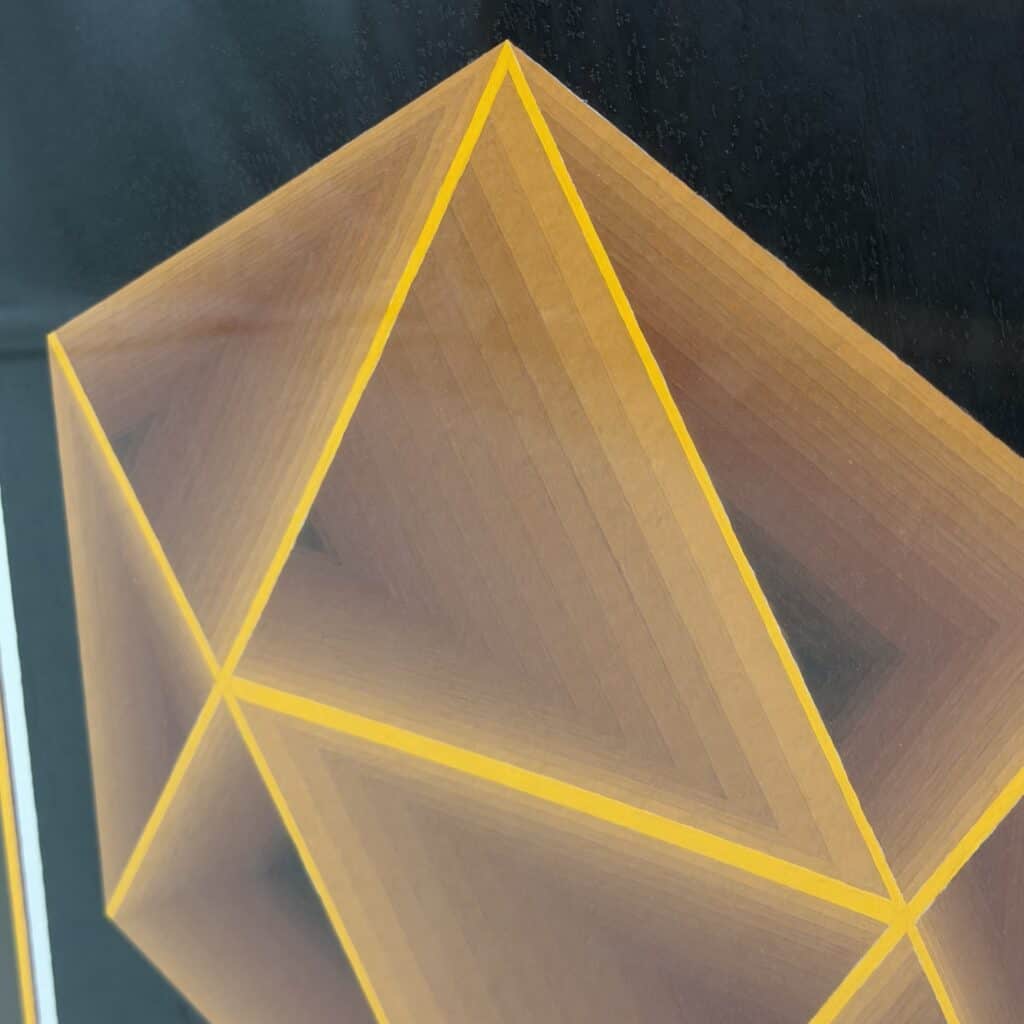 This work is composed of a multitude of orange, three-dimensional triangles on a dark background.