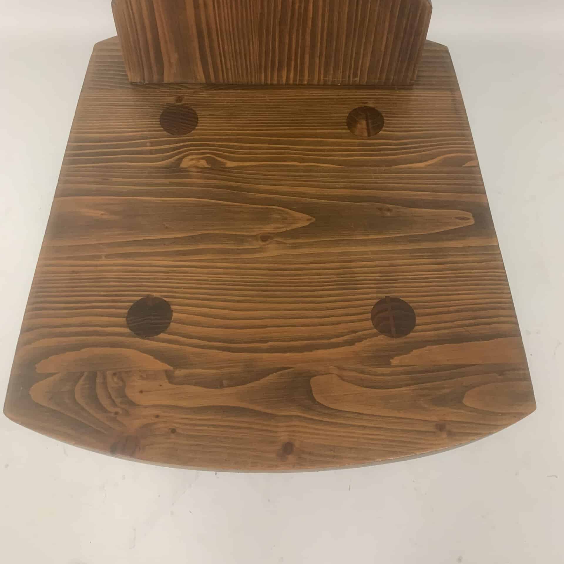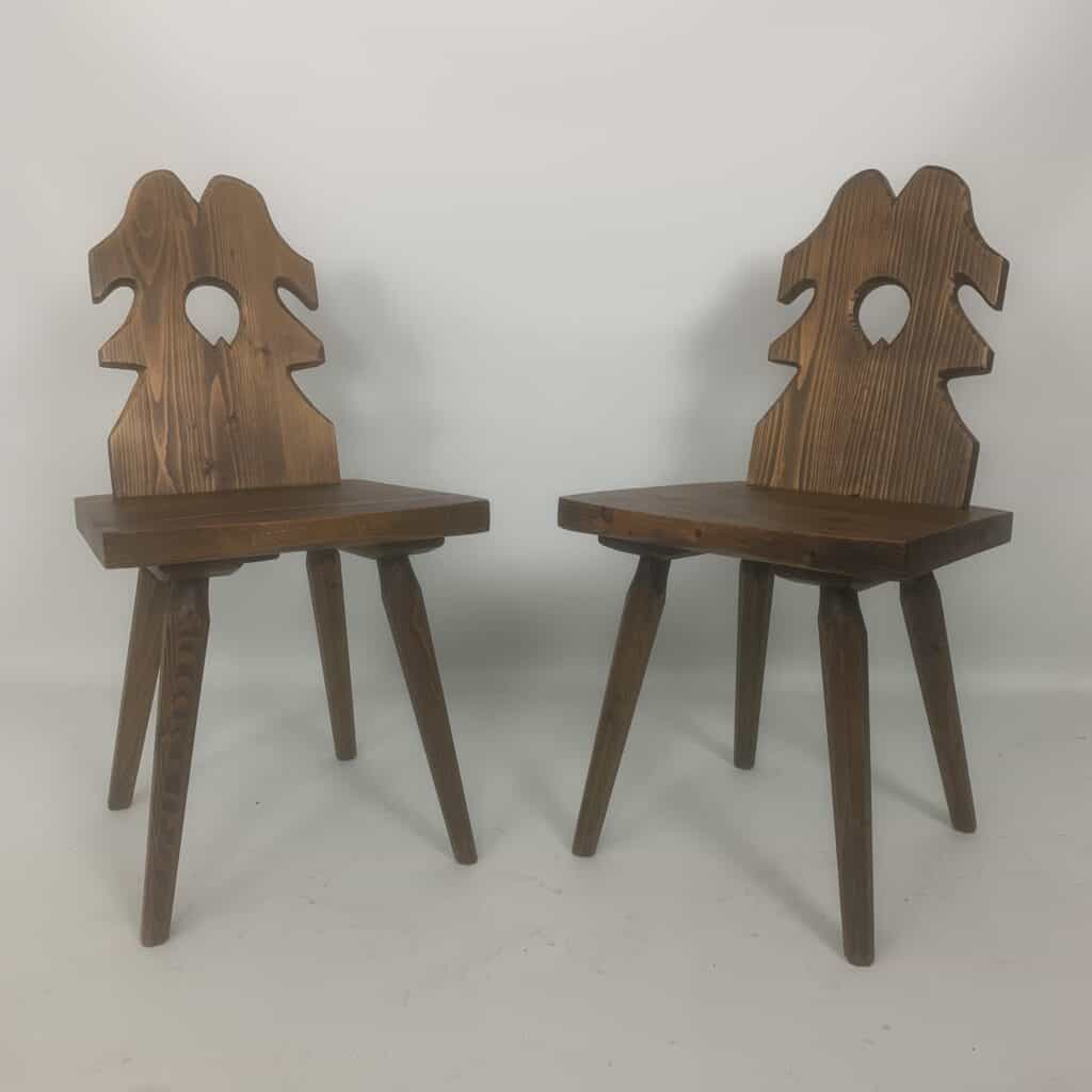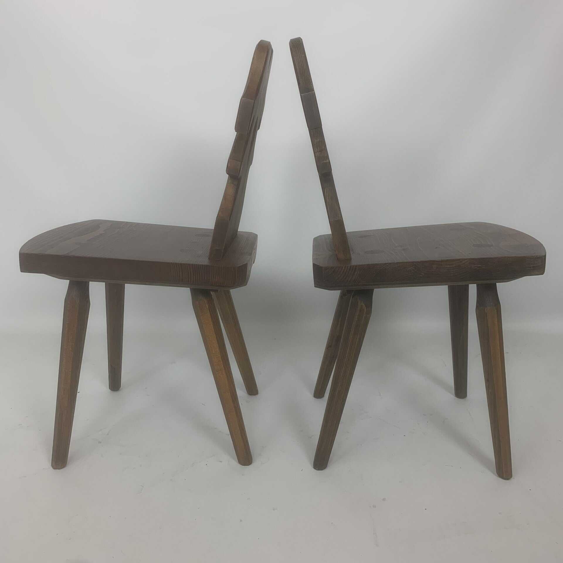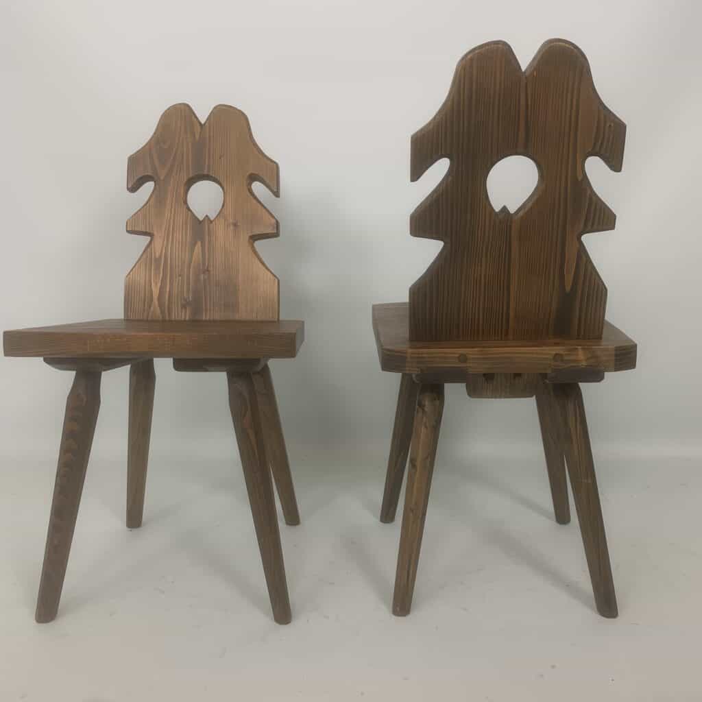 Dark stained solid wood. Raw, bold, and heavy in presence, with chunky lines and sculptural backs. The visible grain adds to the rustic-modern appeal. The round plugs visible on the seat suggest traditional mortise-and-tenon joinery, pegged through the seat for extra strength