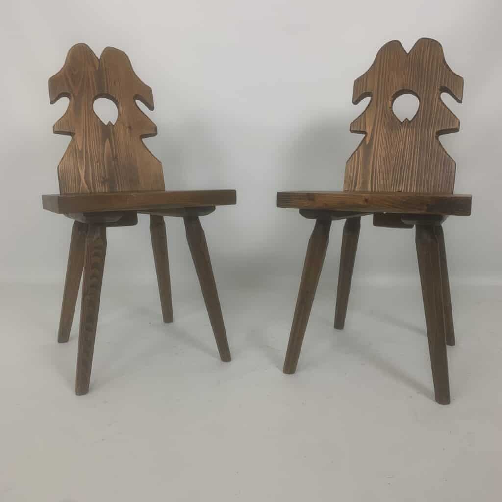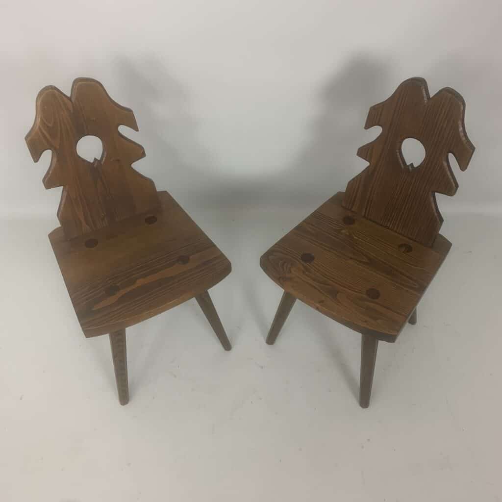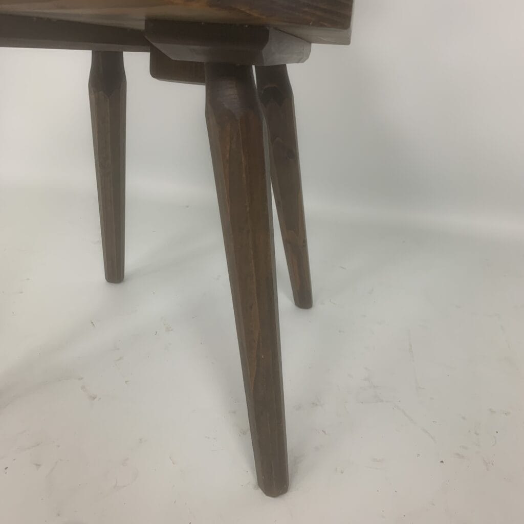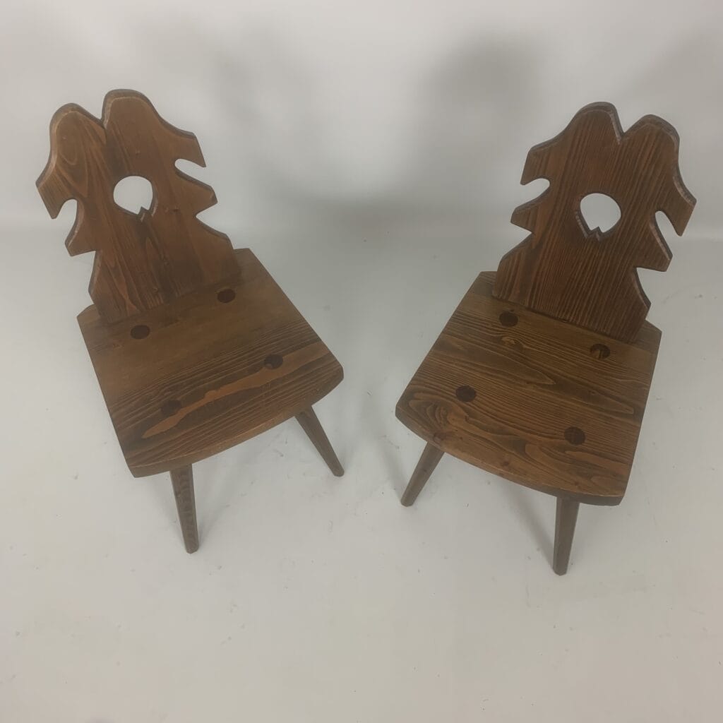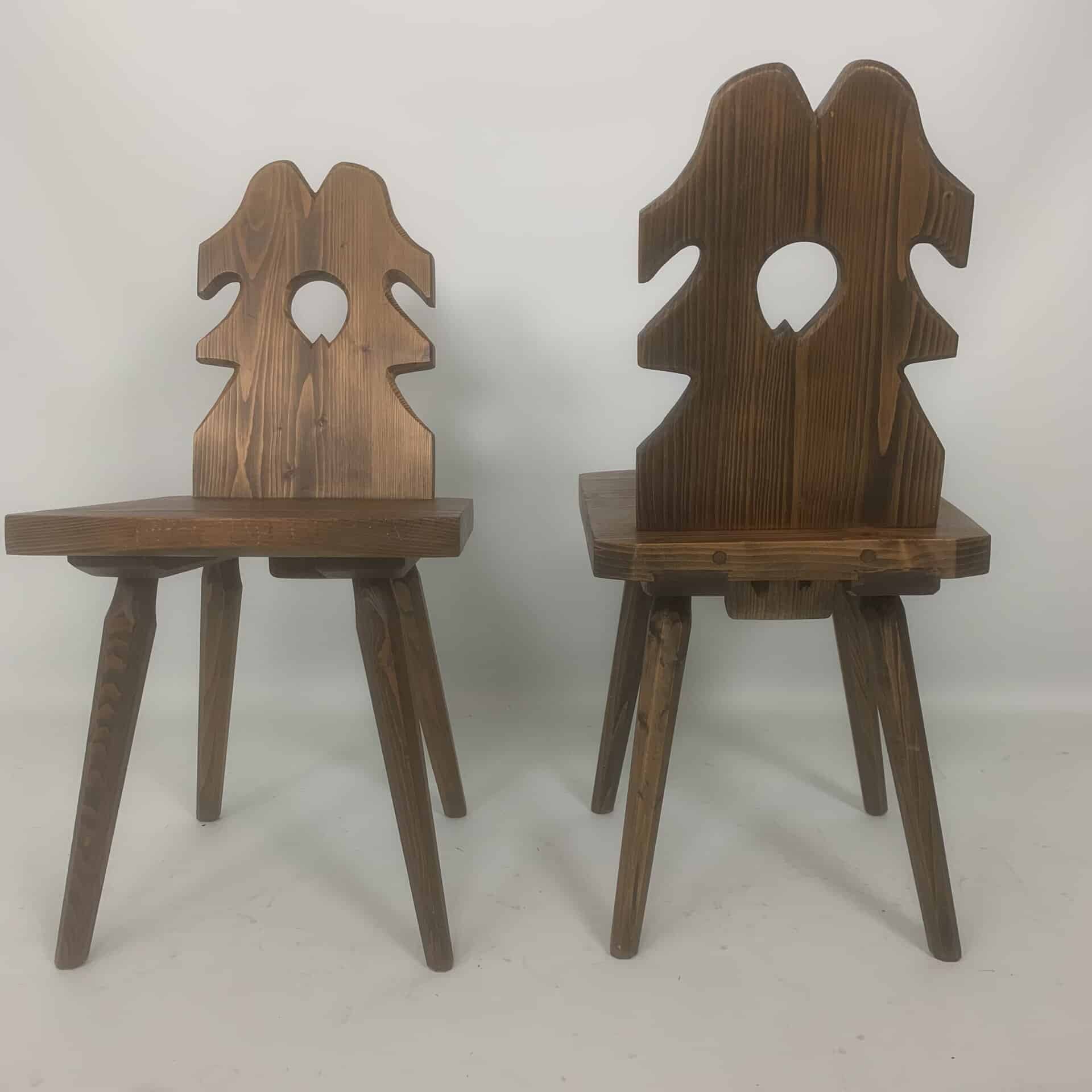 Dark stained solid wood. Raw, bold, and heavy in presence, with chunky lines and sculptural backs. The visible grain adds to the rustic-modern appeal. The round plugs visible on the seat suggest traditional mortise-and-tenon joinery, pegged through the seat for extra strength