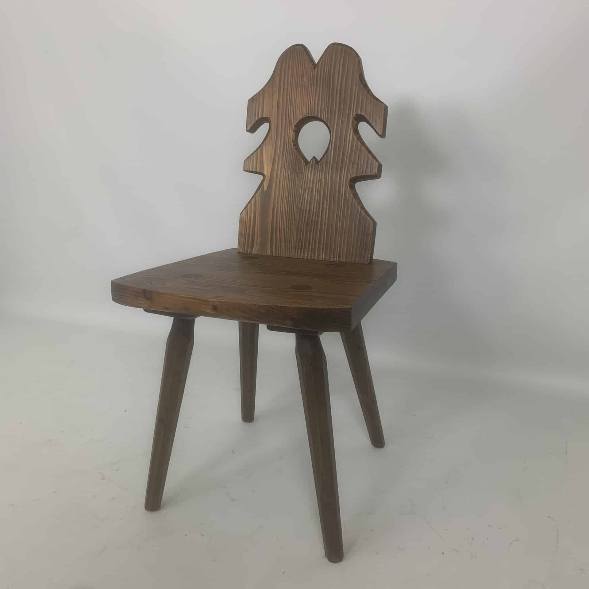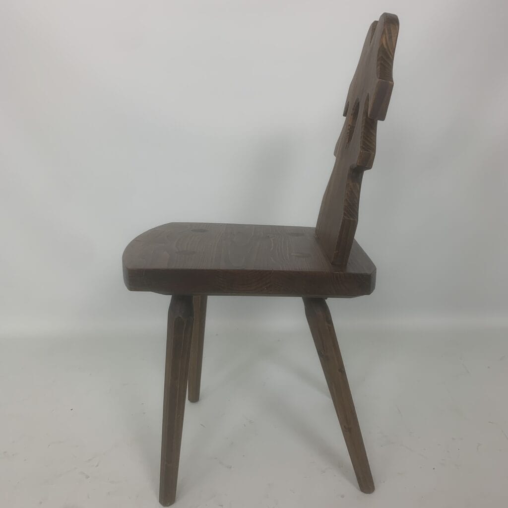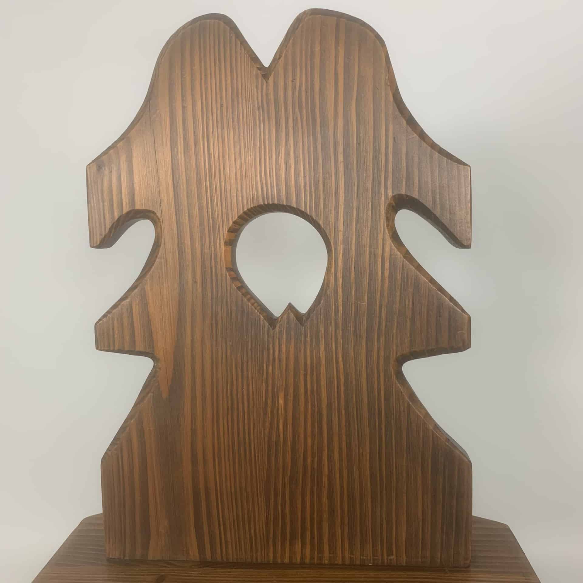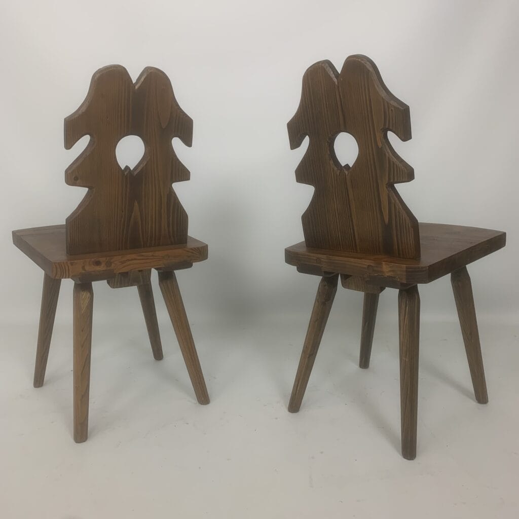Dark stained solid wood. Raw, bold, and heavy in presence, with chunky lines and sculptural backs. The visible grain adds to the rustic-modern appeal. The round plugs visible on the seat suggest traditional mortise-and-tenon joinery, pegged through the seat for extra strength