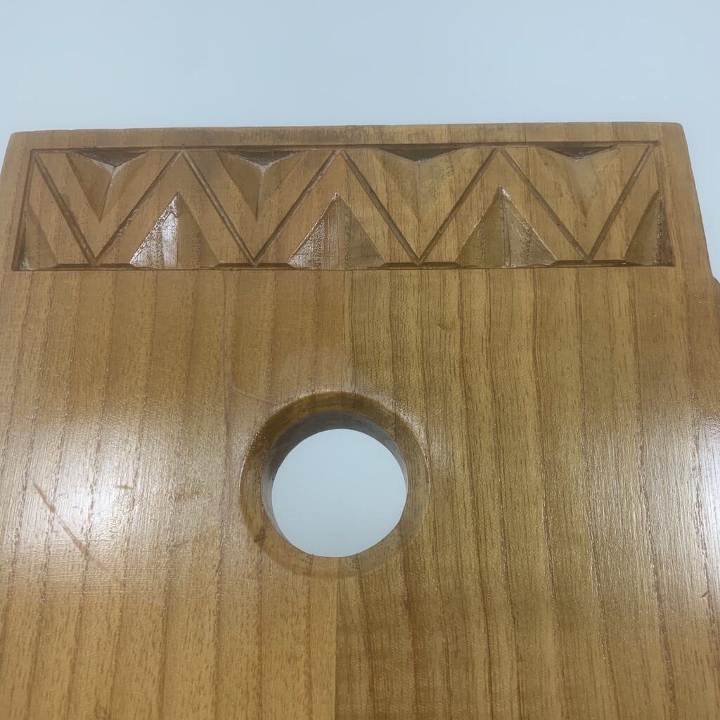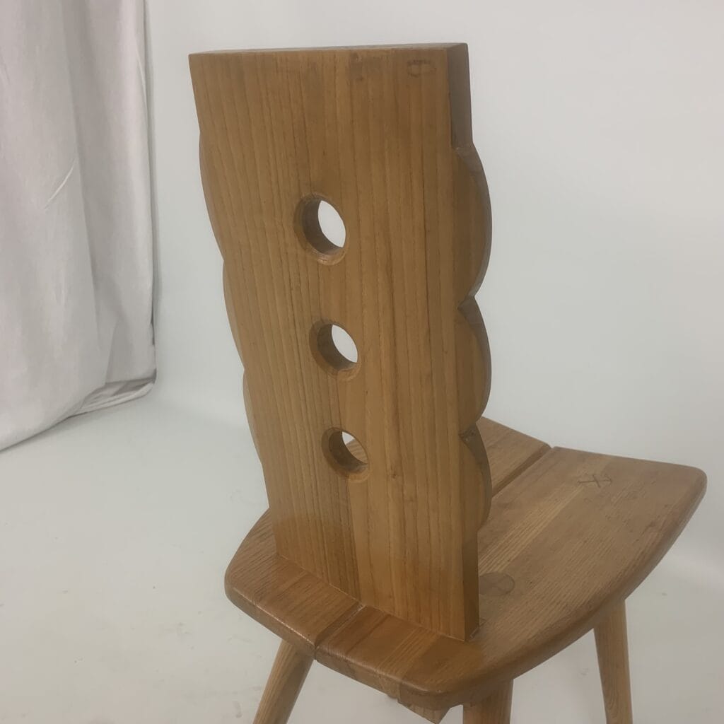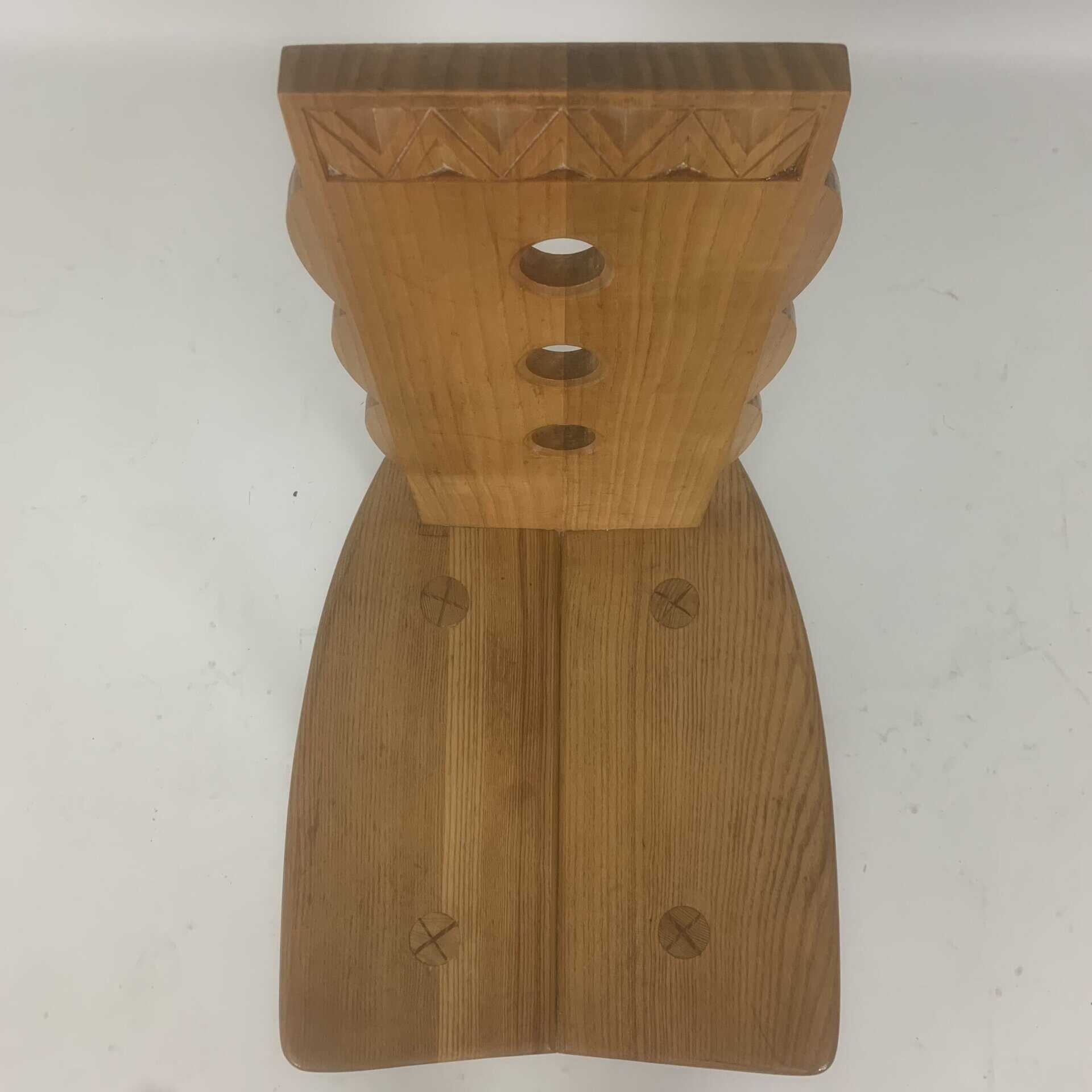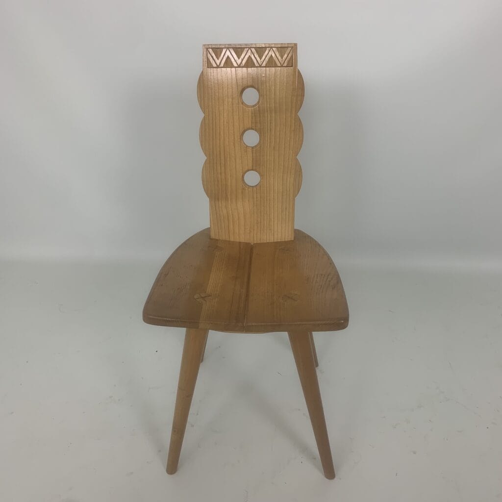 These triangular carvings on the top rail and the three circular cutouts in the backrest are distinctive