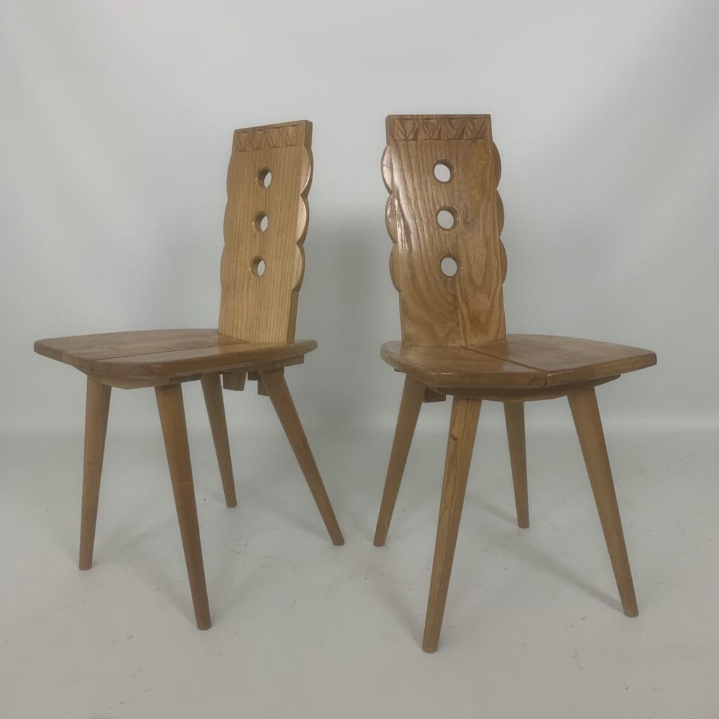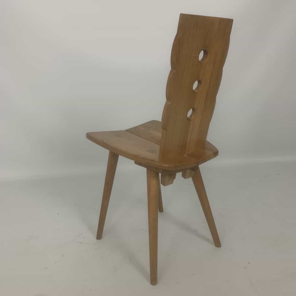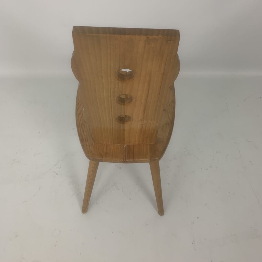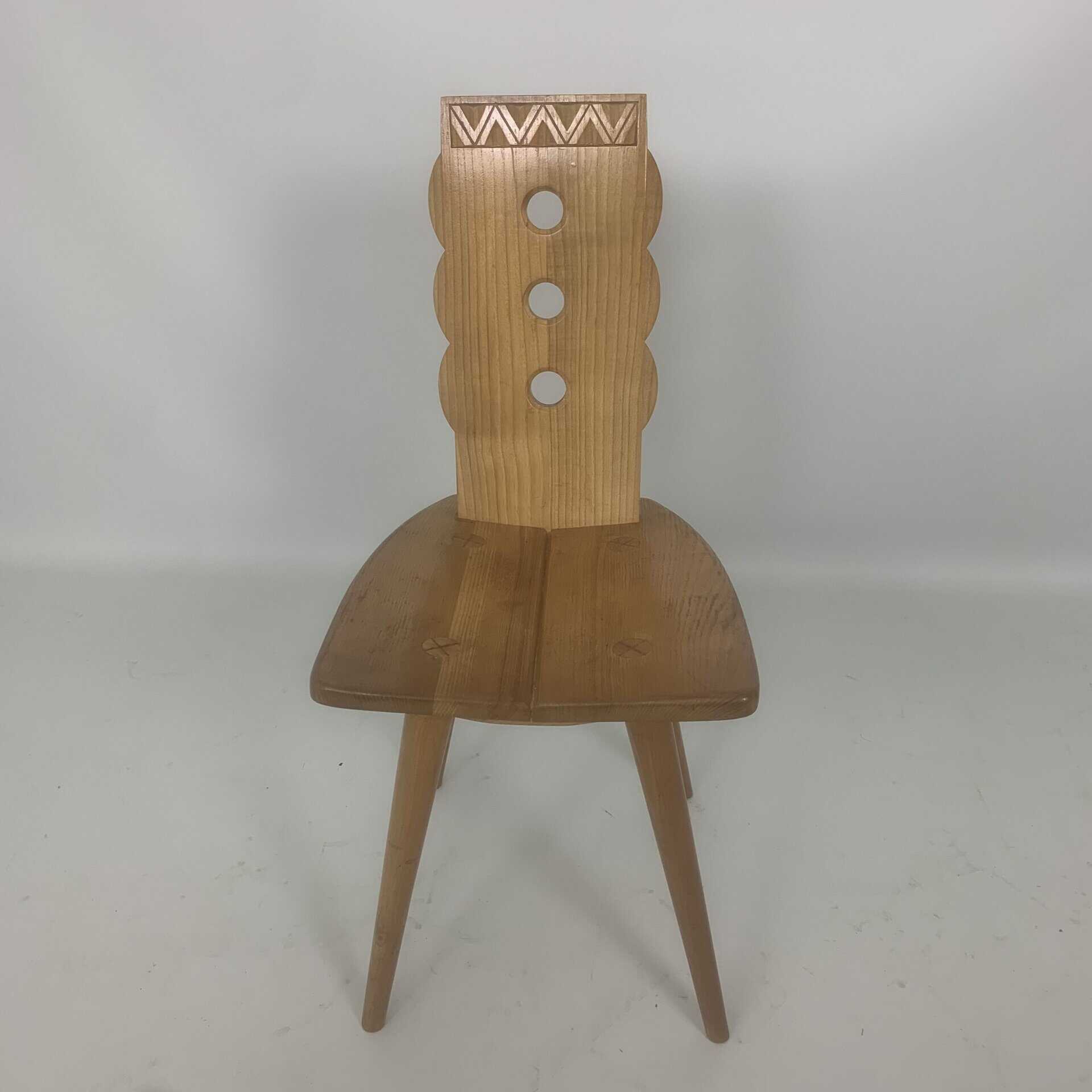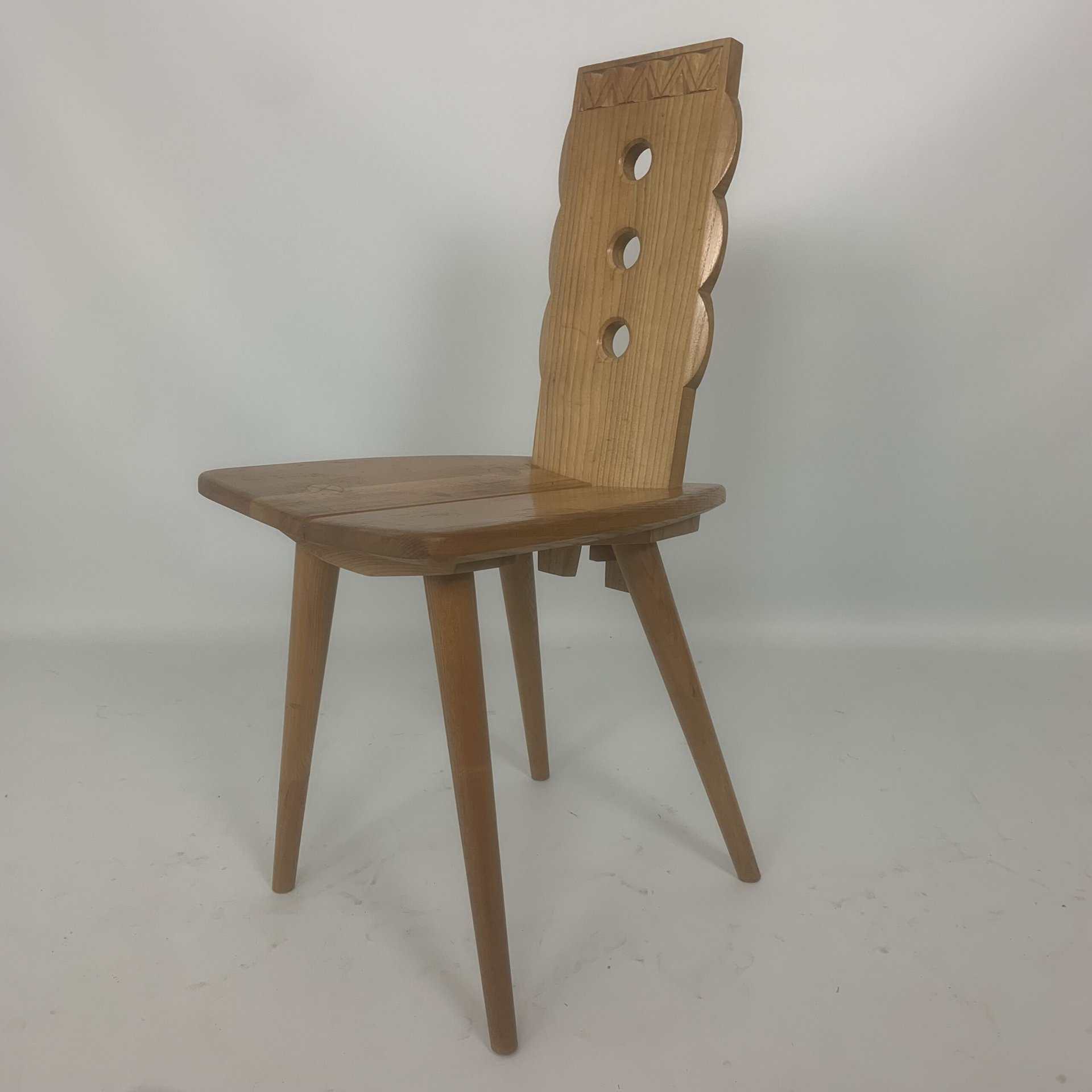 These triangular carvings on the top rail and the three circular cutouts in the backrest are distinctive