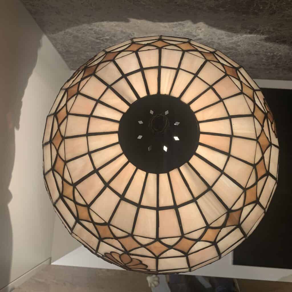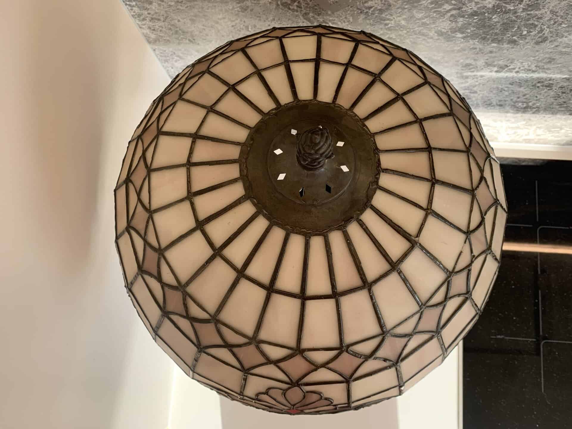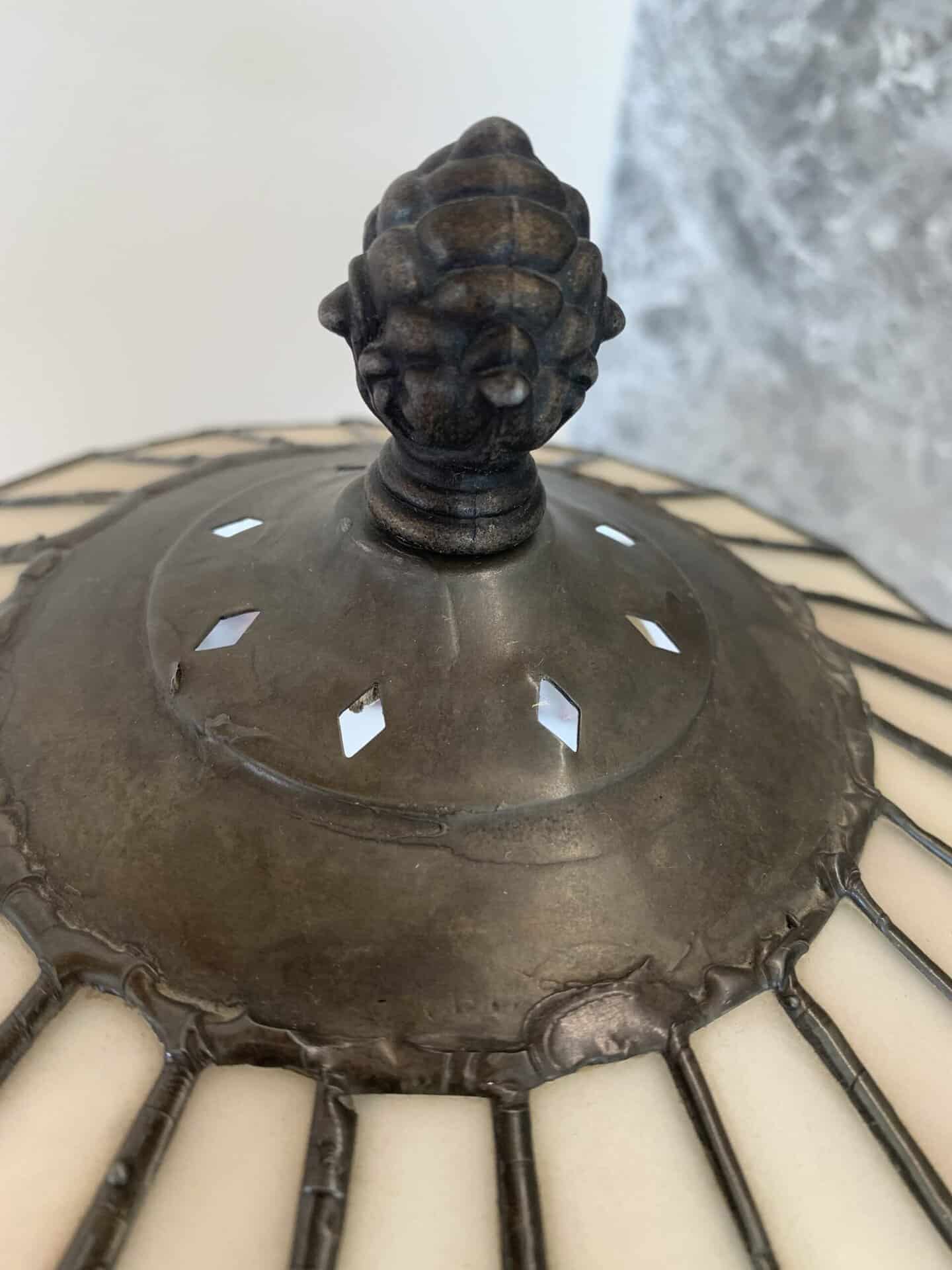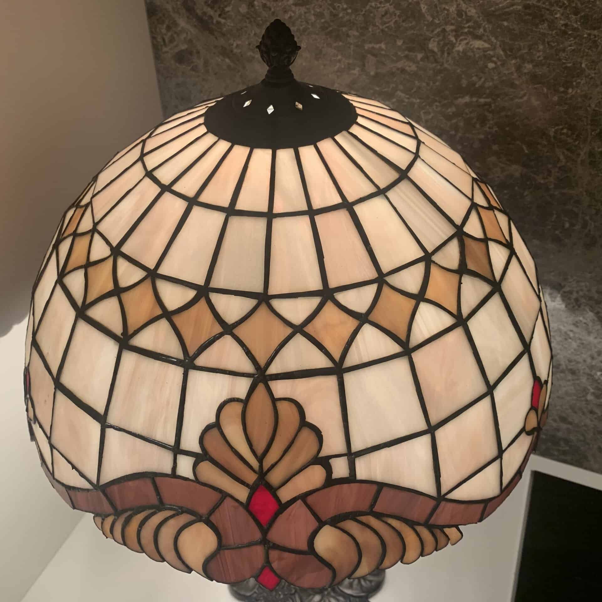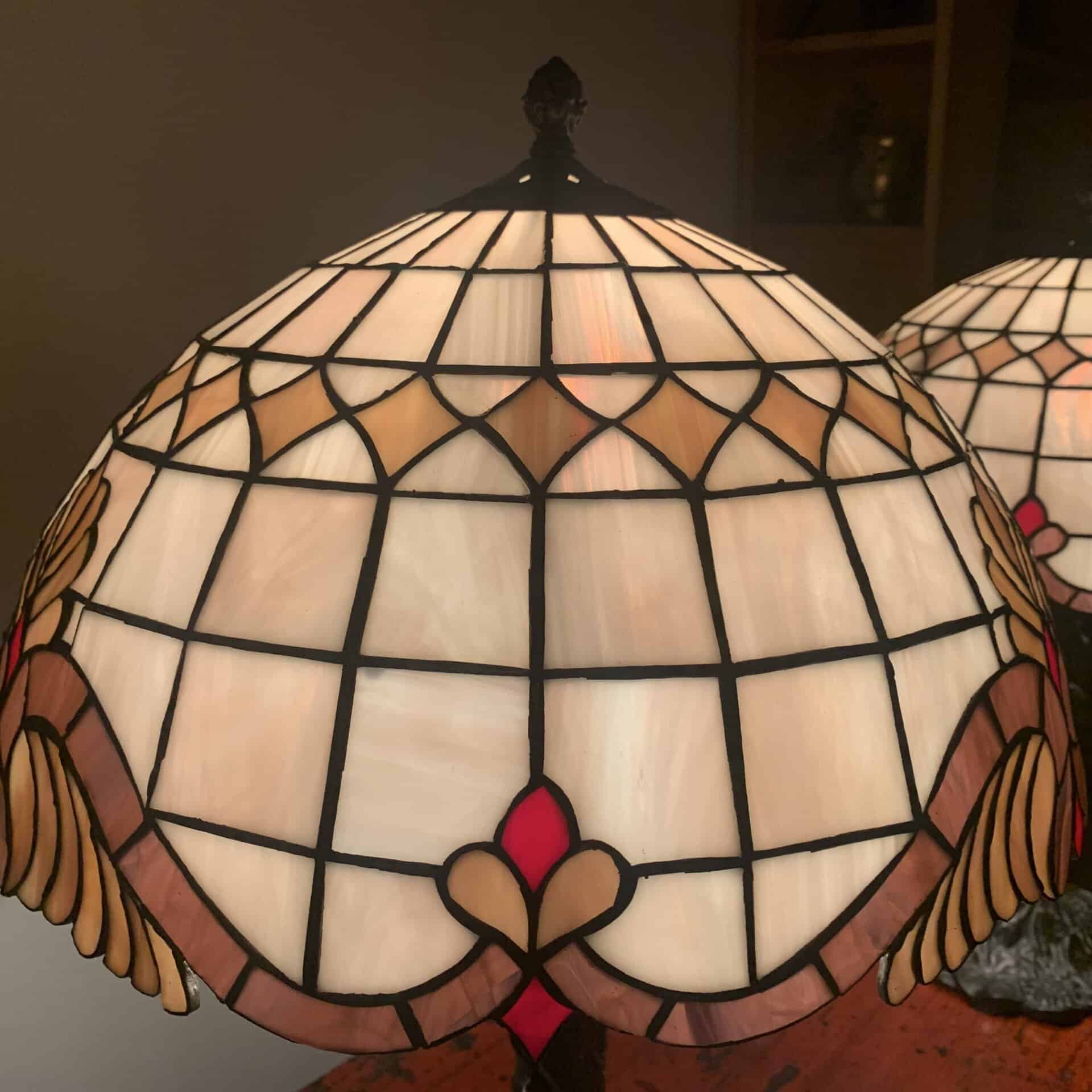 Pair of Tiffany Style Baroc Table Lamps Bronze base and shade in colored stained glass,