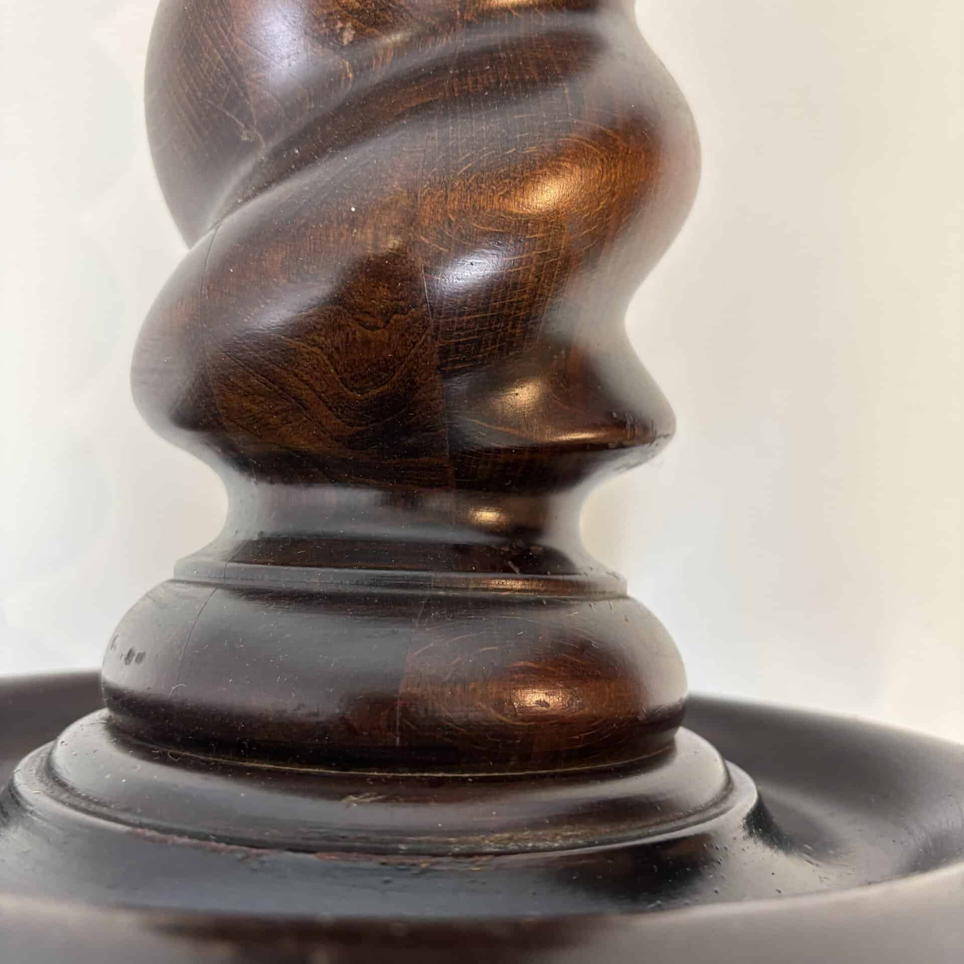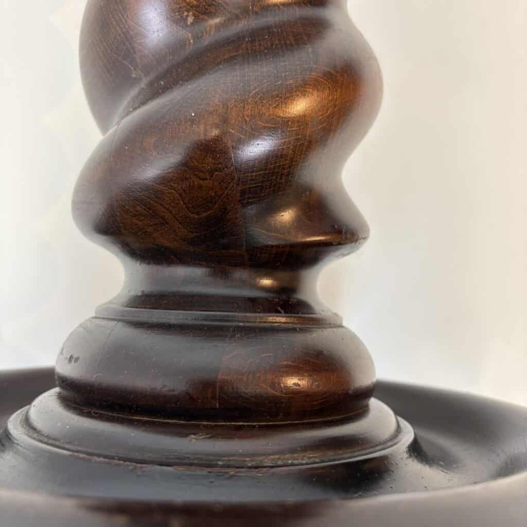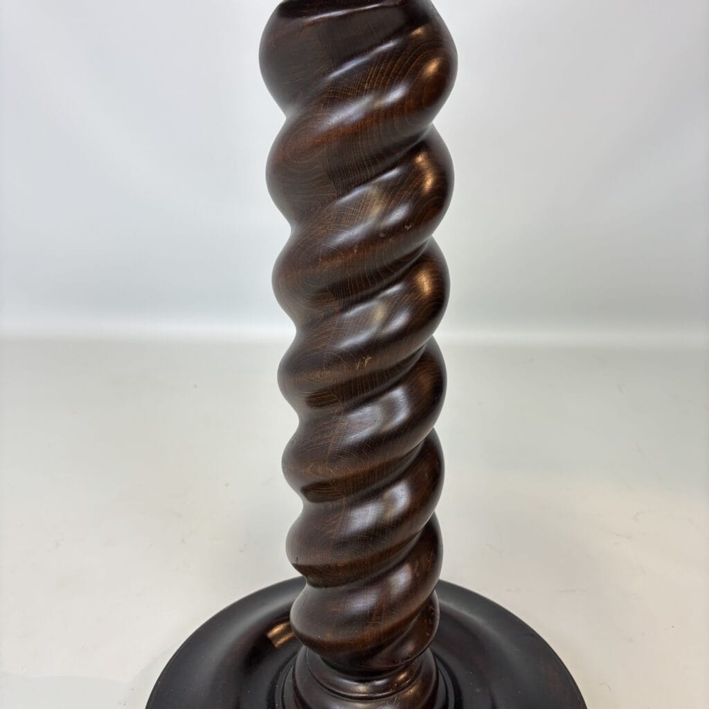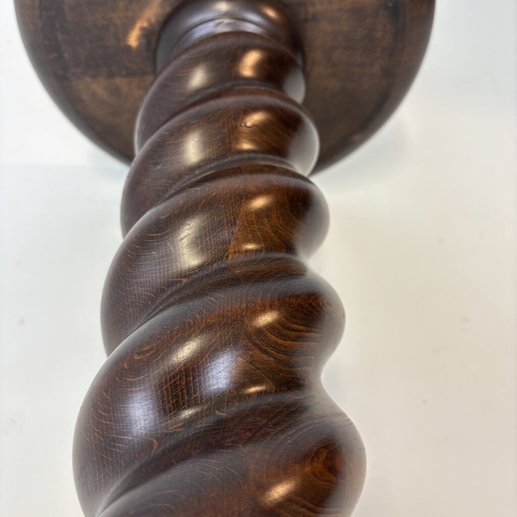 Dark heavy oak with barley twist, also known as a Solomonic column, features a design of turned, spiral grooves that ascend the central column