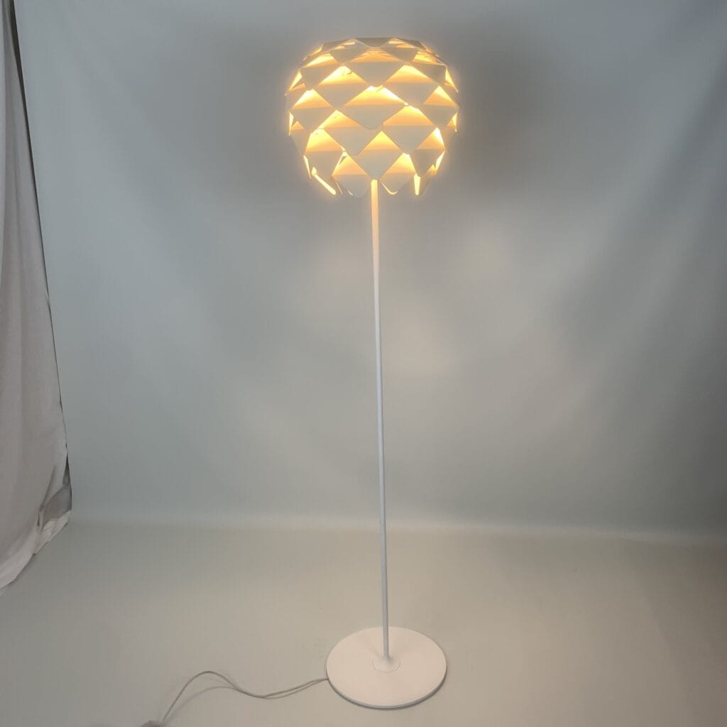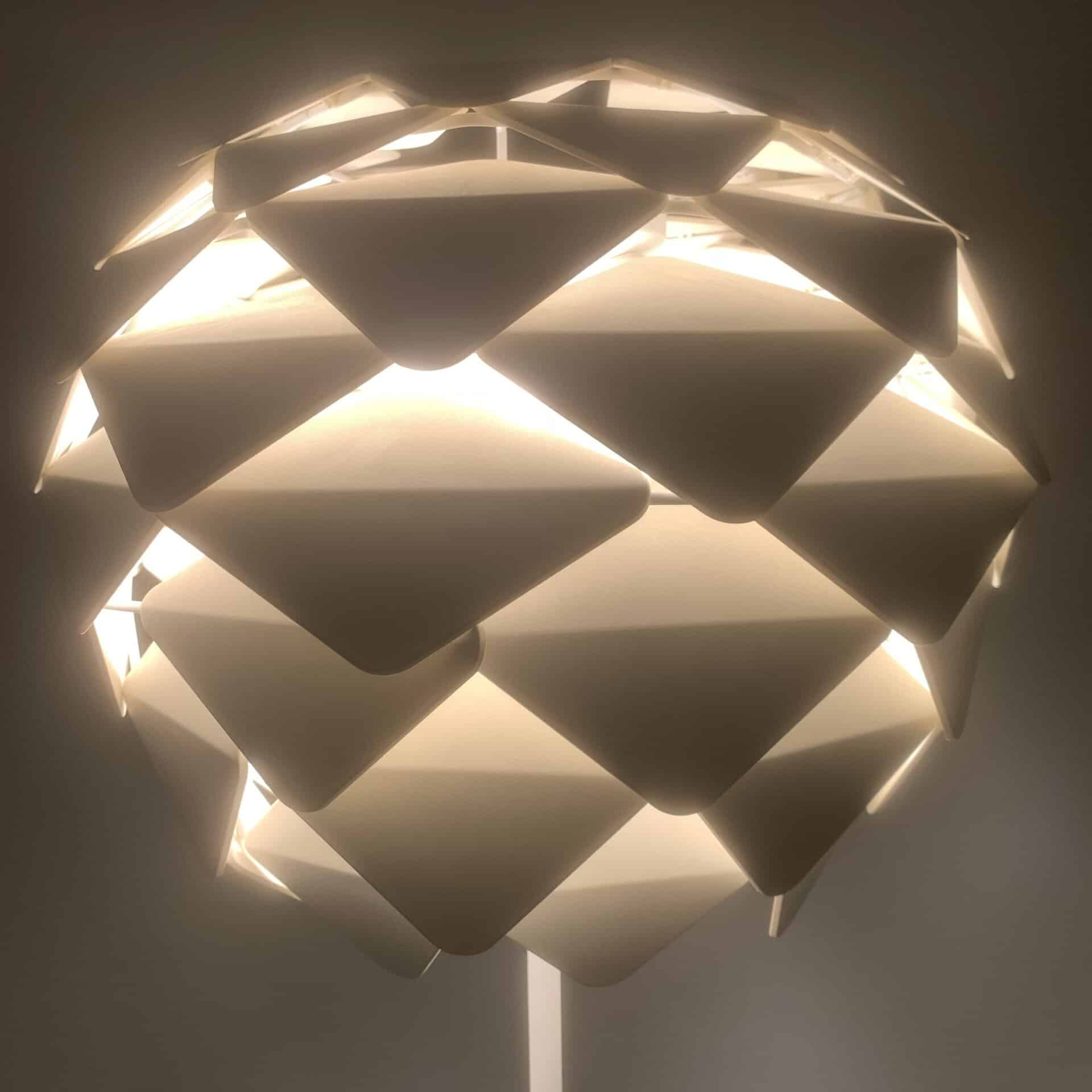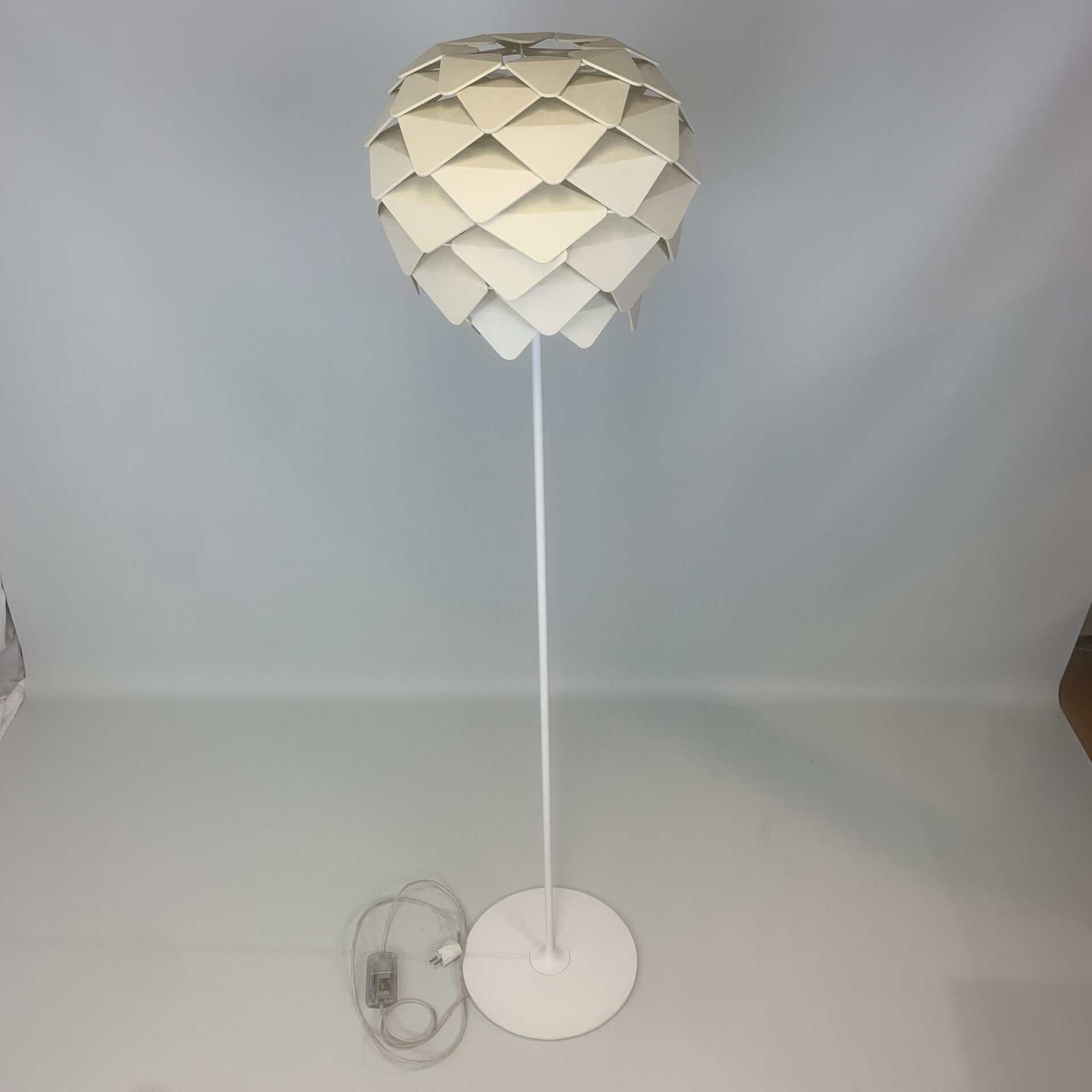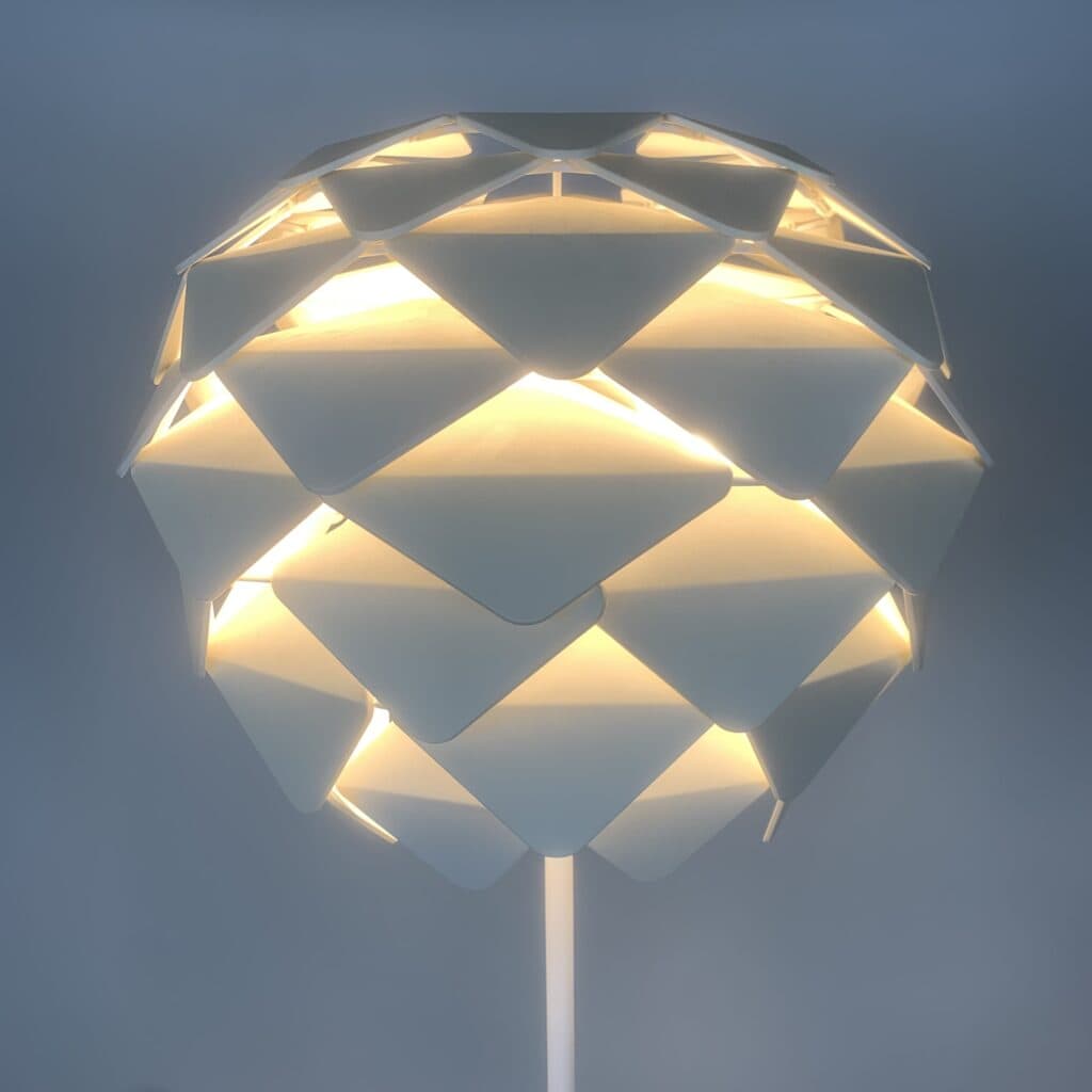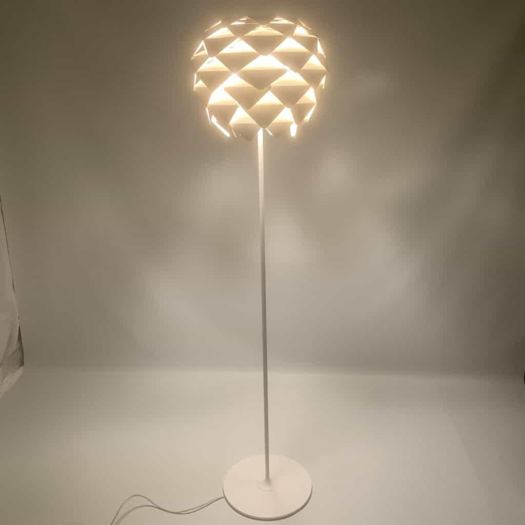 This floor lamp with dimmer has white lacquered metal base and a lampshade composed of removable grey plastic diamond-shaped slats in ABS